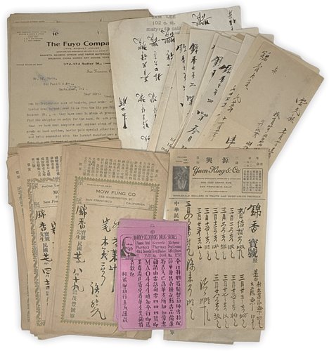 Historically Significant Extensive Collection of Over Eighty Pieces of Ephemera (Advertisements, Invoices, Retail Receipts, and Typescripts) Mostly Related to the Lesser-Known Chinese and Japanese Businesses on the West Coast, including California (San Francisco, Marysville) and Washington (Seattle). Ca. 1913; 1930s-1940s.