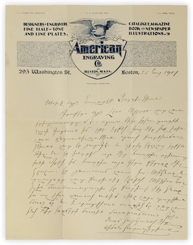 Garabedian, Simon S. (1873–1931). Original Autograph Letter Signed by an Early Armenian Immigrant in Boston Simon S. Garabedian to His Armenian Friend Nazereth Chordigian in Fresno, California. Boston, 25 August 1901.