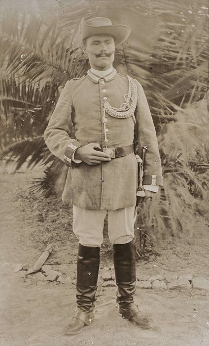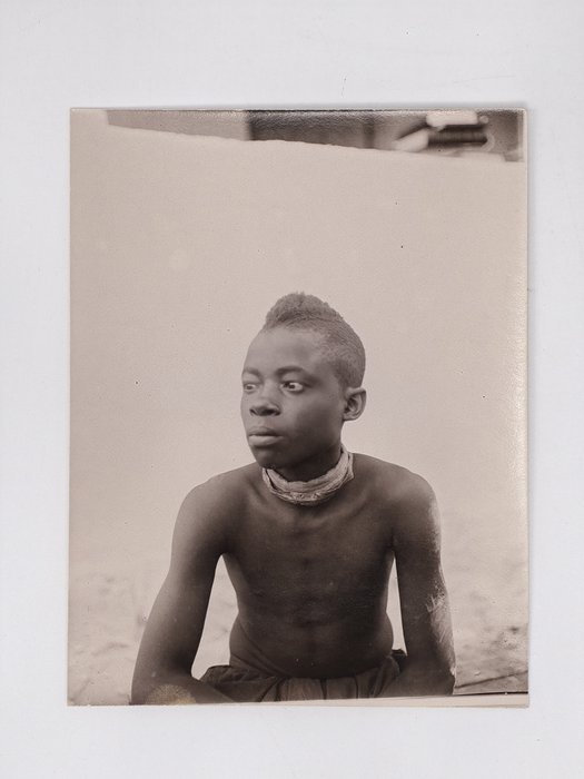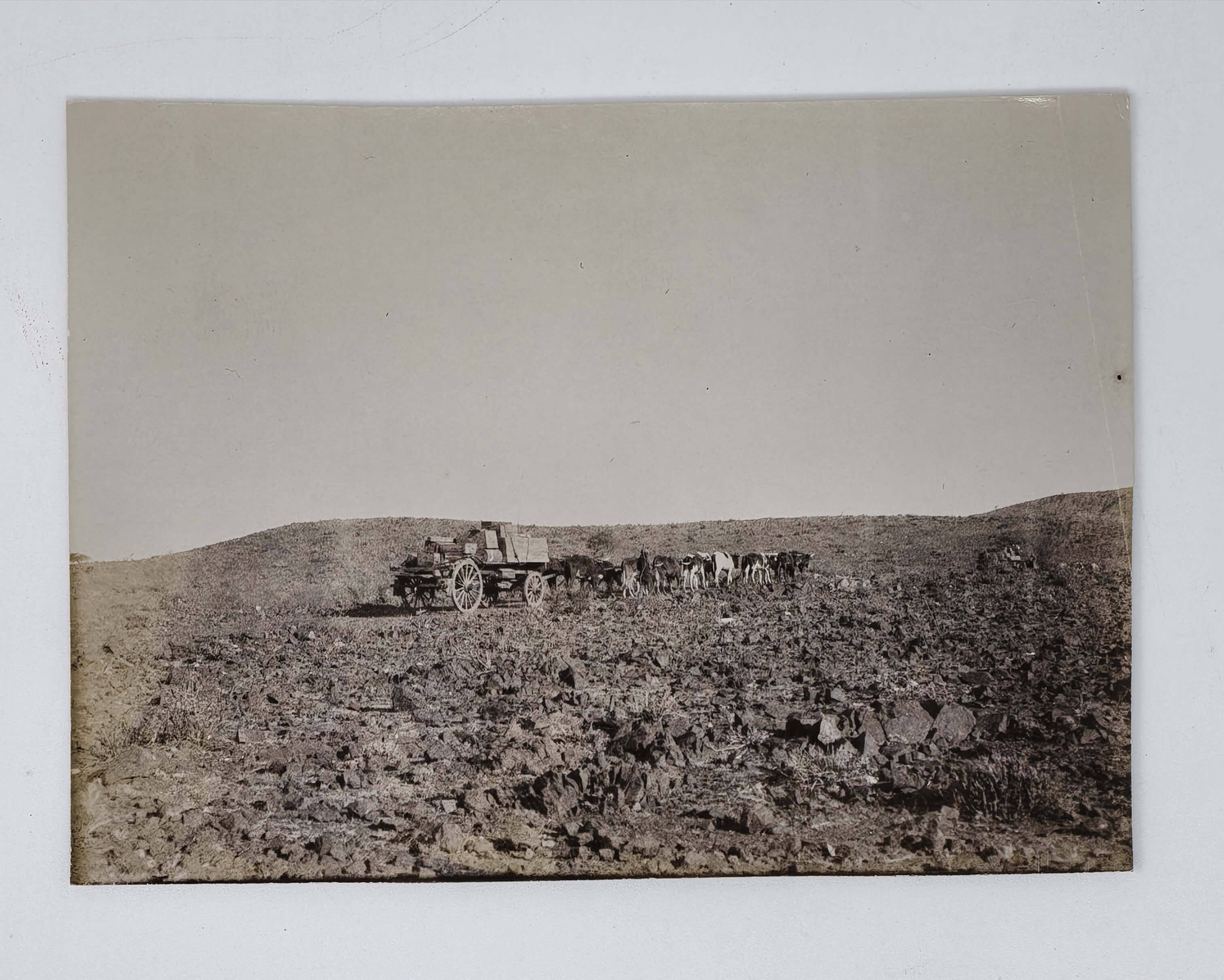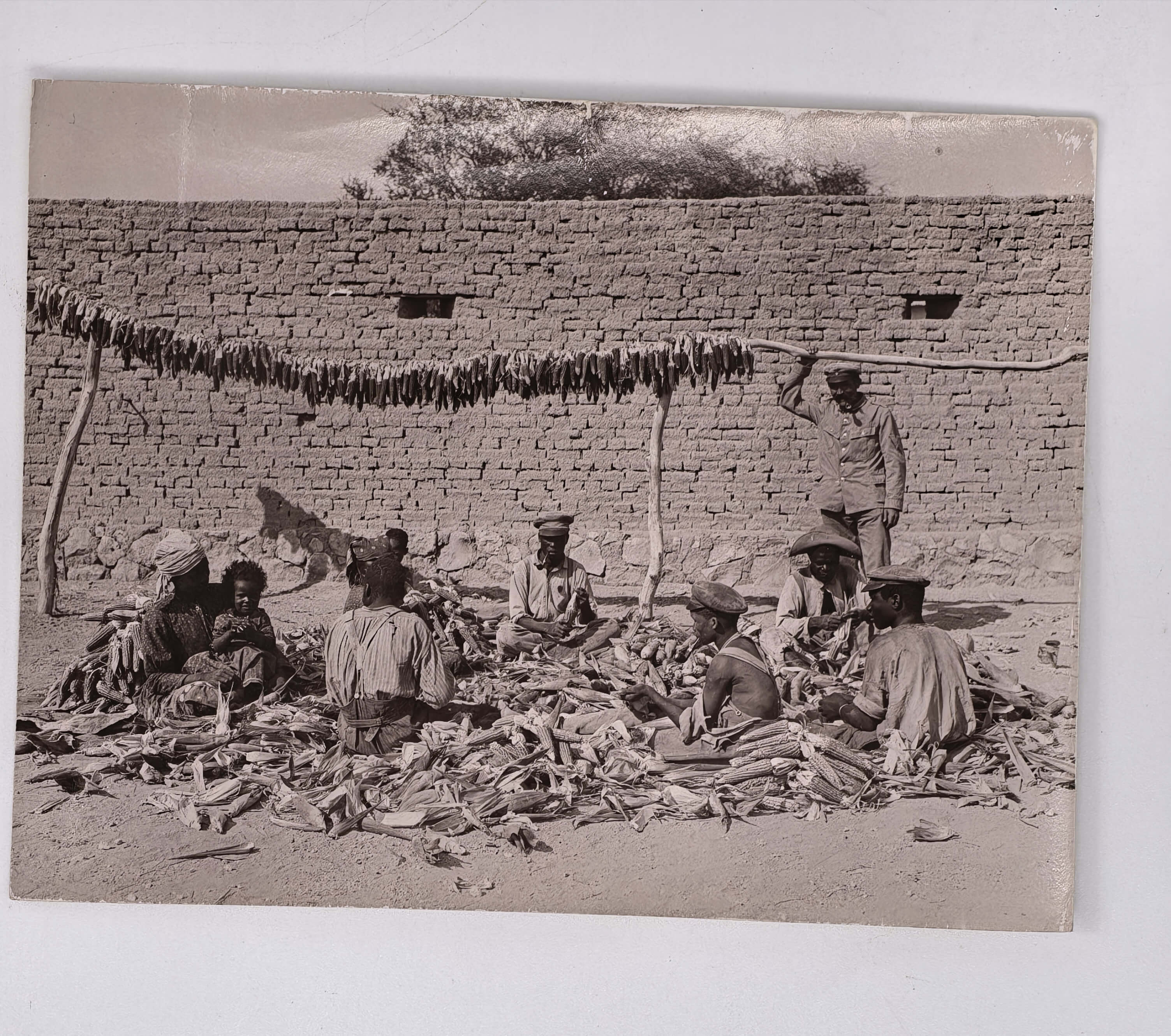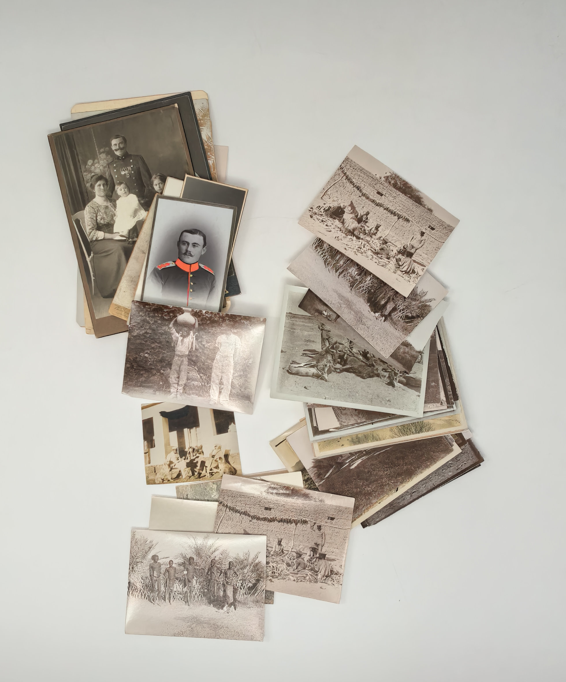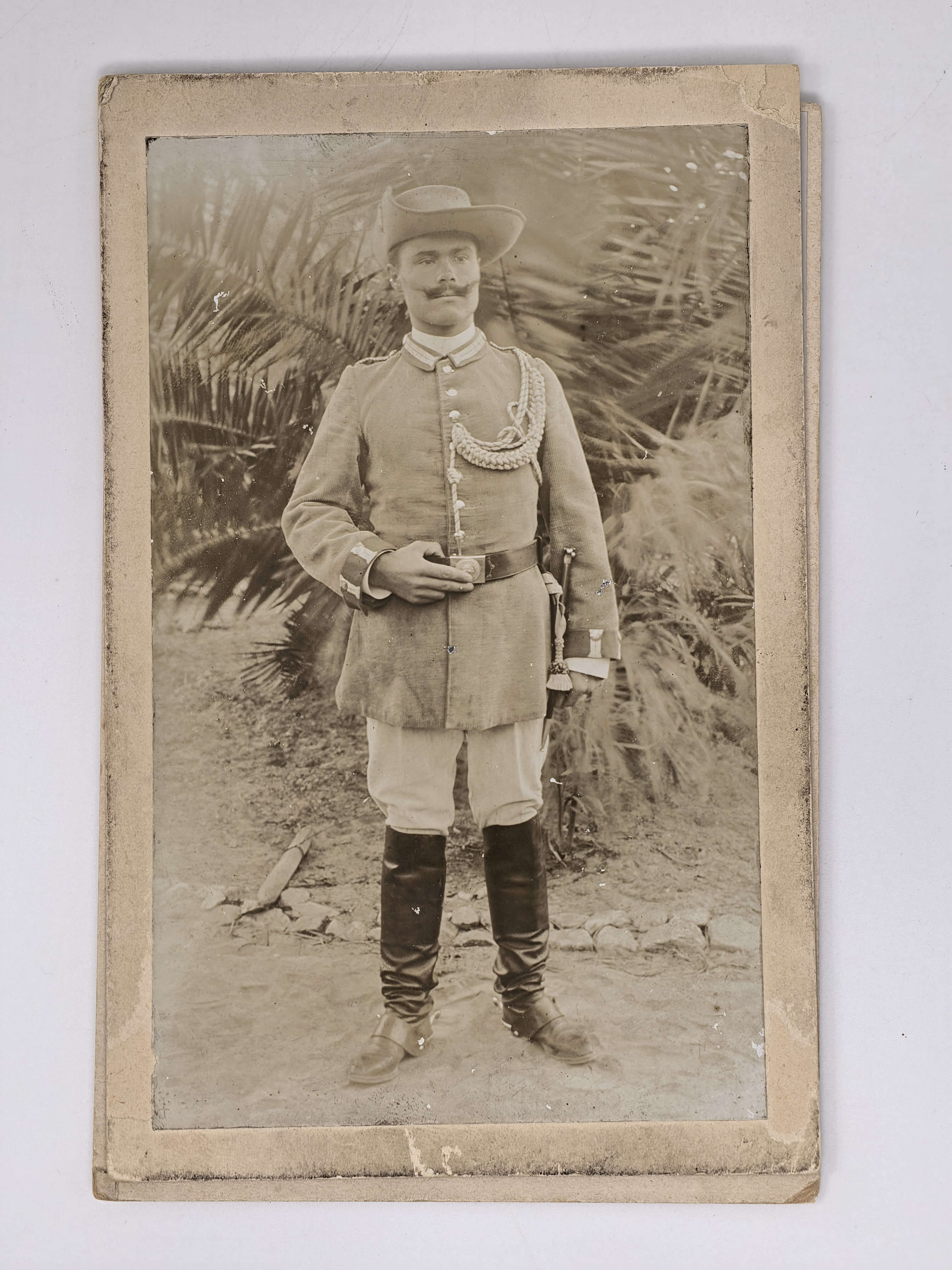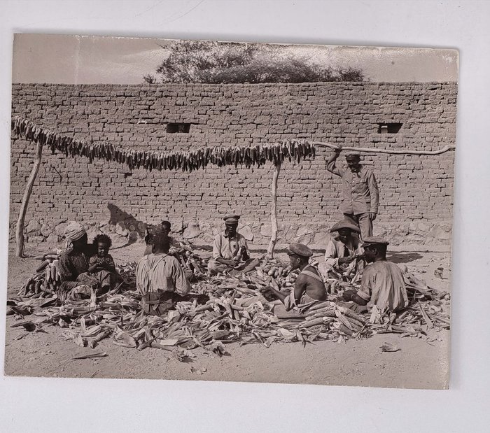 Interesting collection of early original gelatin silver photos of German Southwest Africa (Namibia), apparently taken and collected by a German military officer during his service in the colony in ca. 1900s. Among the identified photos are three views of the Sesfontein Fort (Kunene Region of modern-day northwestern Namibia): a general one and two close-up views of a wall with a damaged roof and corrugated iron sheets laid on the ground. Other images show another German fort with a waving flag, a German farm, military men in the countryside, posing with hunted antelopes, an oxen-driven wagon, Namibian hills, deserts and bush country, portraits of native Namibians wearing traditional and German-influenced outfits, people peeling corn, riding donkeys, &c. The cabinet portrait photos include four pictures of “Heinrich [Penk?]” (two taken in German Southwest Africa in 1901 and 1902), as well as of “Rave” and two unidentified German officers (all three wearing Schutztruppe uniform). Overall an interesting extensive collection of early original photos of Namibia and its people in the early 20th century.