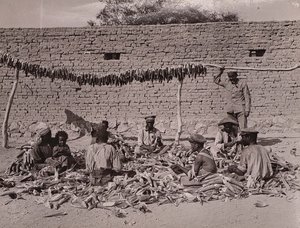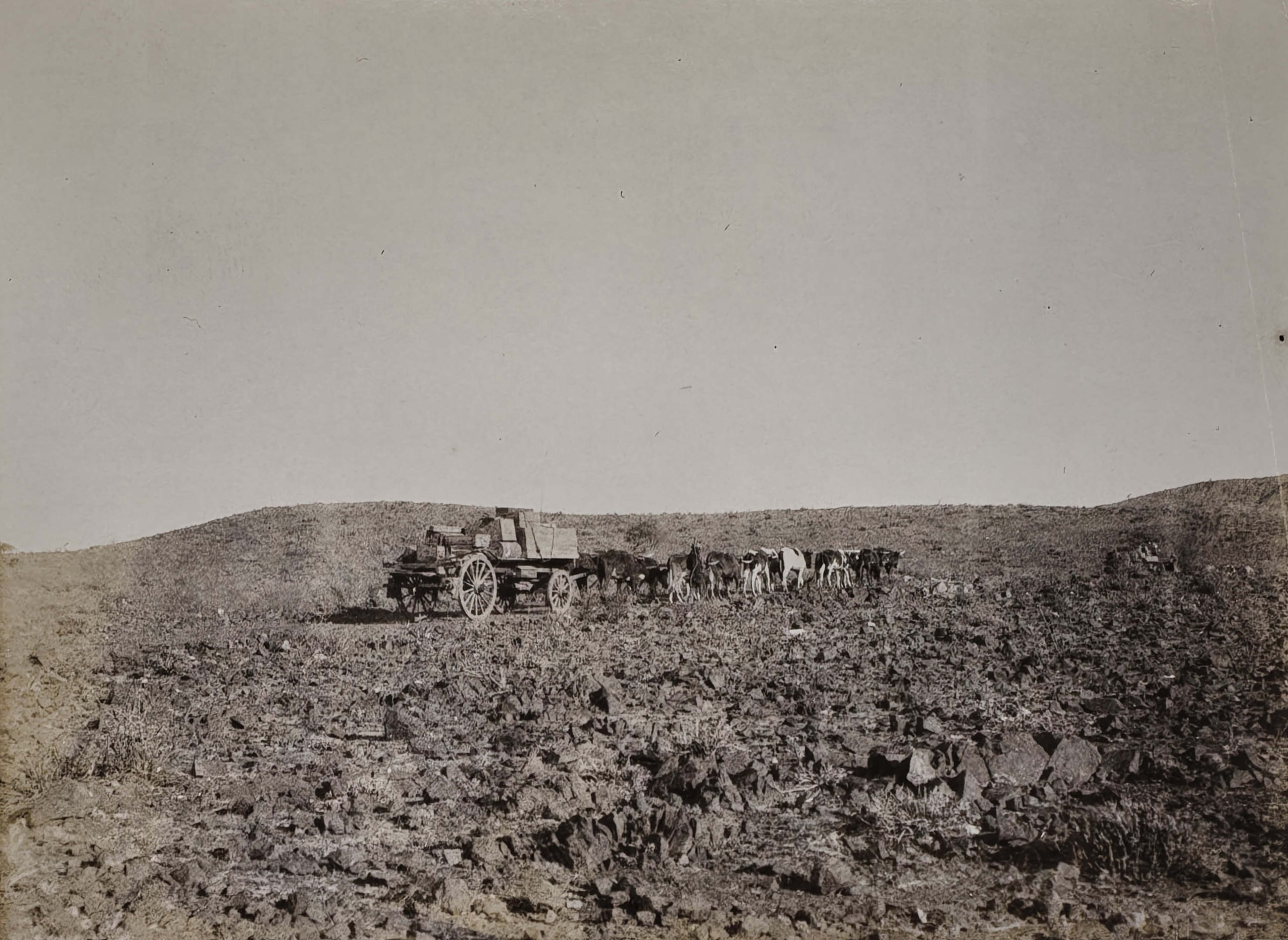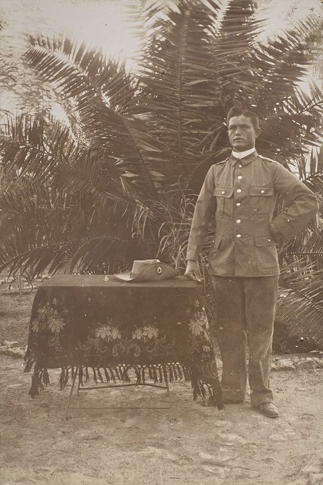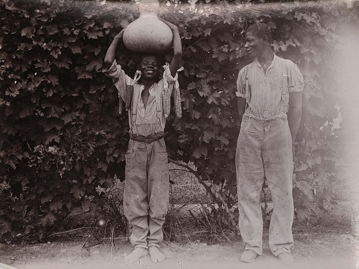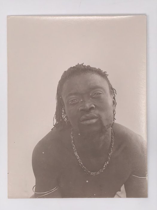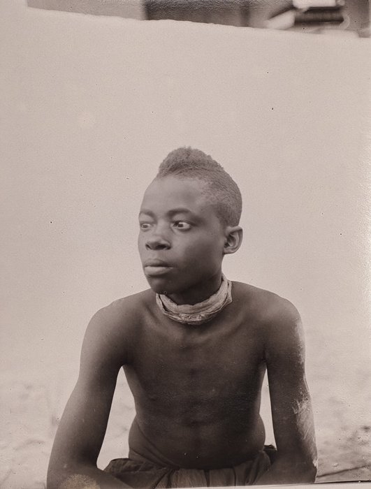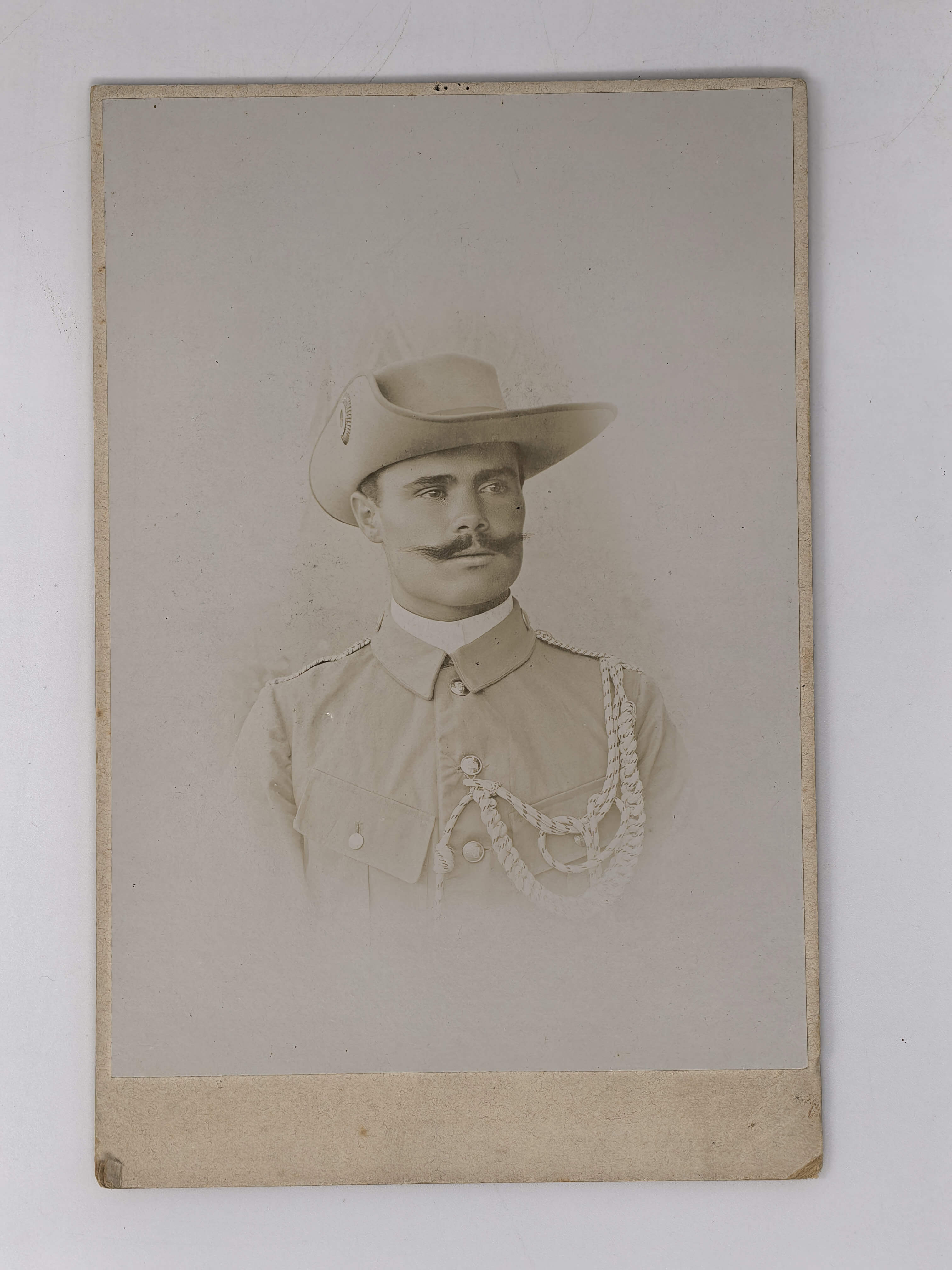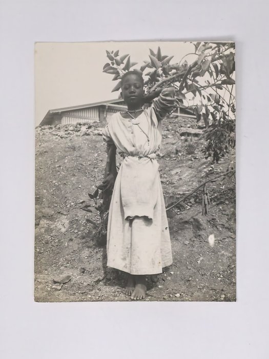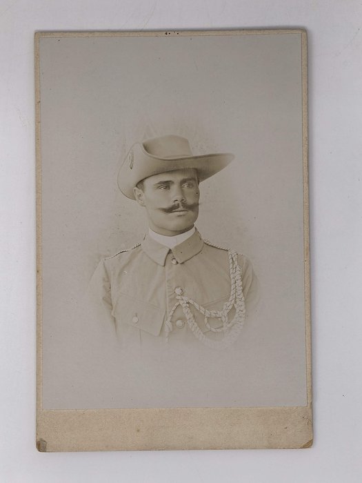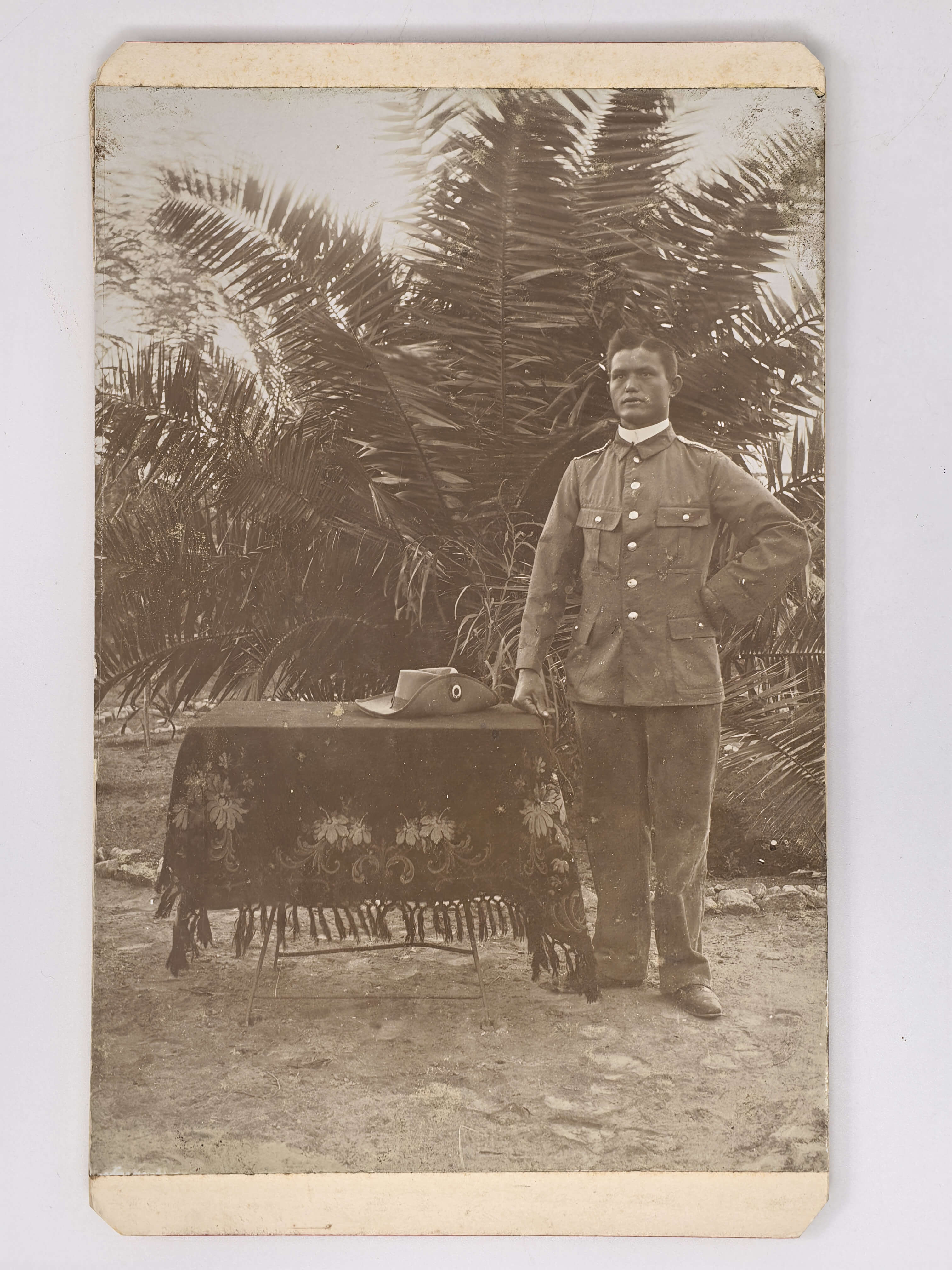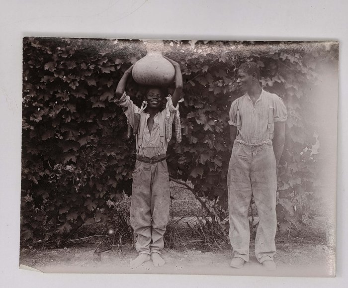 Interesting collection of early original gelatin silver photos of German Southwest Africa (Namibia), apparently taken and collected by a German military officer during his service in the colony in ca. 1900s. Among the identified photos are three views of the Sesfontein Fort (Kunene Region of modern-day northwestern Namibia): a general one and two close-up views of a wall with a damaged roof and corrugated iron sheets laid on the ground. Other images show another German fort with a waving flag, a German farm, military men in the countryside, posing with hunted antelopes, an oxen-driven wagon, Namibian hills, deserts and bush country, portraits of native Namibians wearing traditional and German-influenced outfits, people peeling corn, riding donkeys, &c. The cabinet portrait photos include four pictures of “Heinrich [Penk?]” (two taken in German Southwest Africa in 1901 and 1902), as well as of “Rave” and two unidentified German officers (all three wearing Schutztruppe uniform). Overall an interesting extensive collection of early original photos of Namibia and its people in the early 20th century.