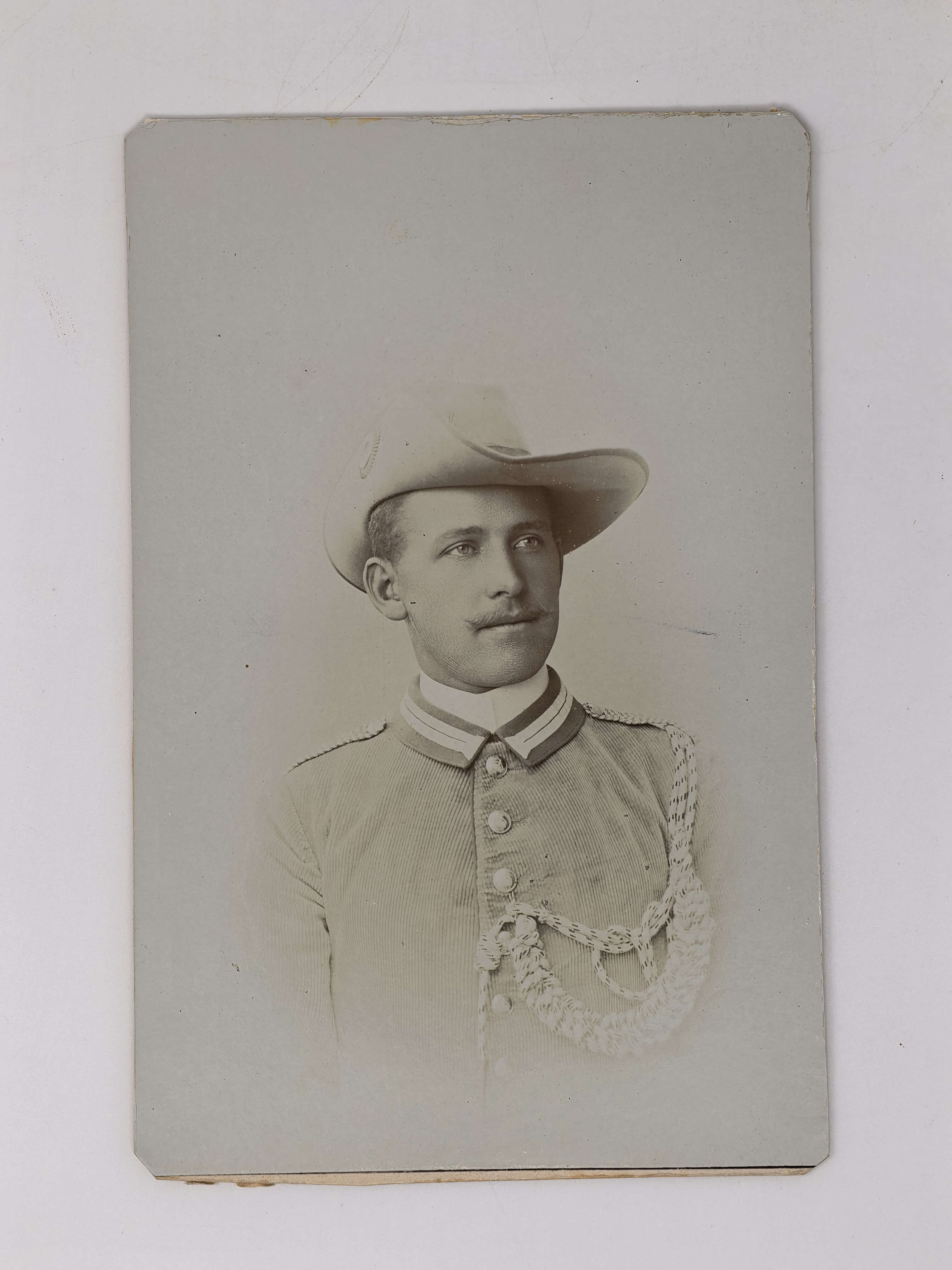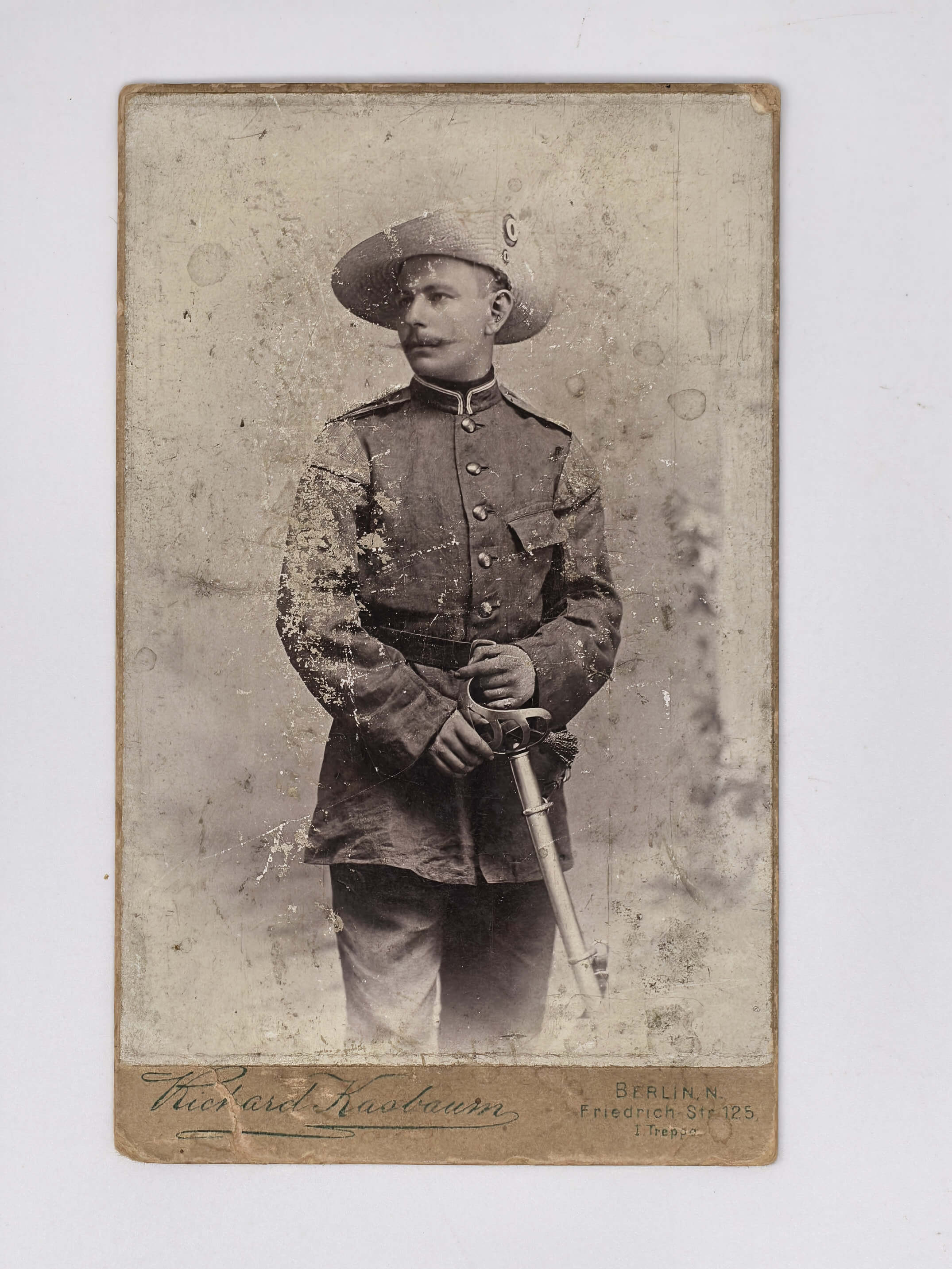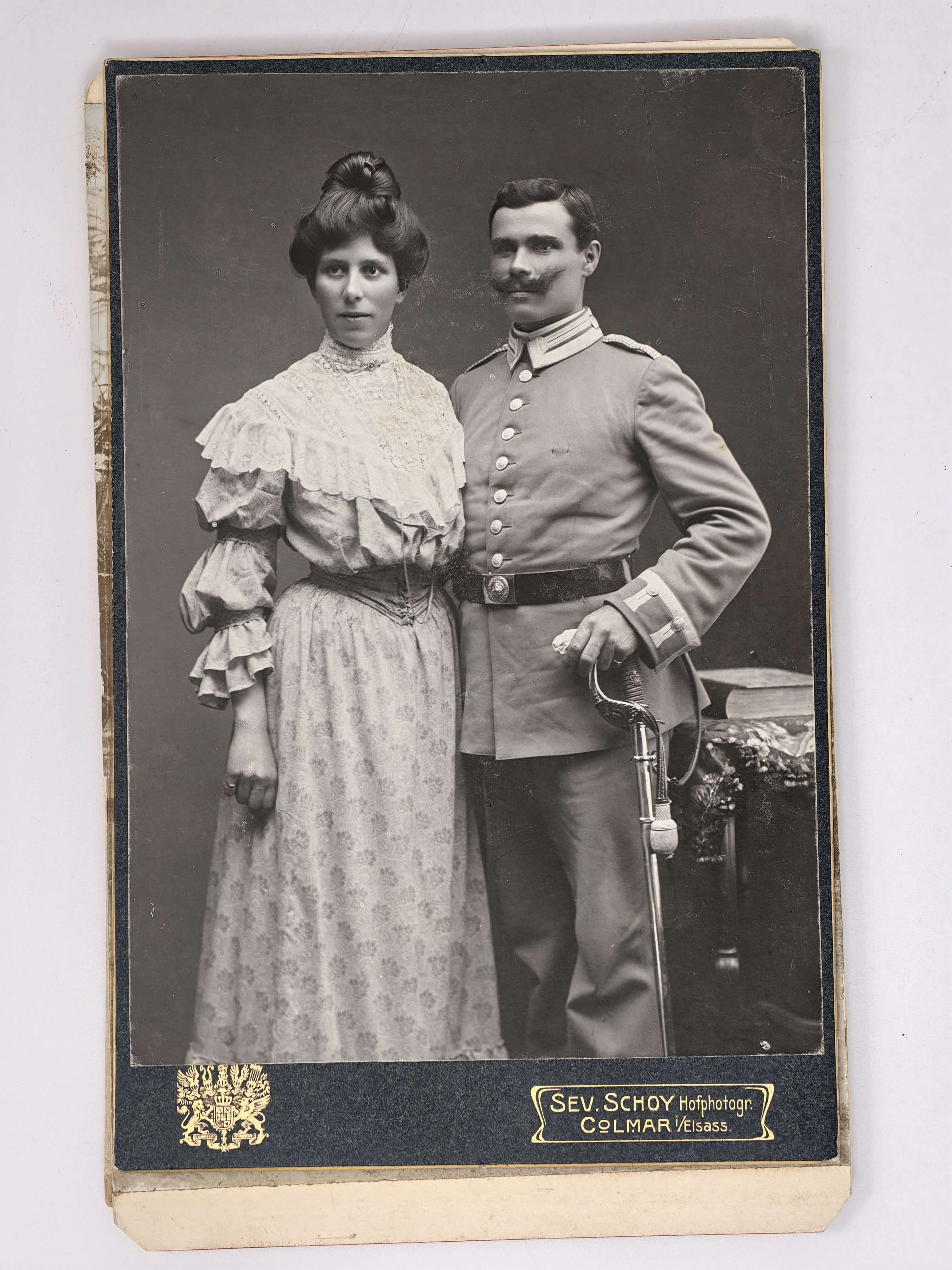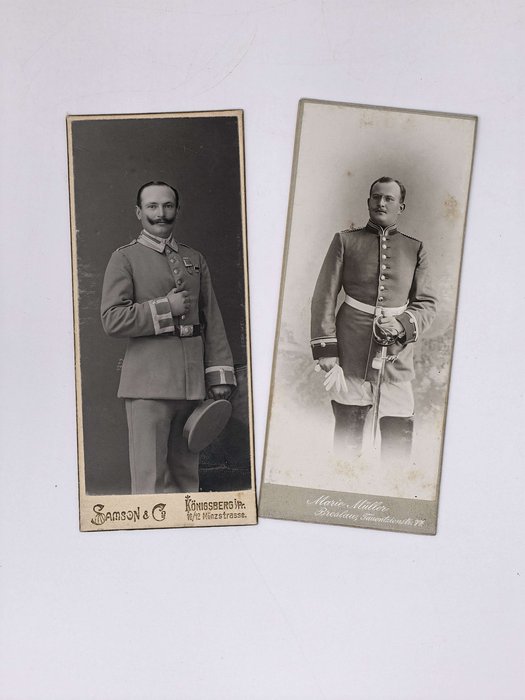 48 loose original gelatin silver photos (including ten duplicates), from ca. 9x12 cm (3 ½ x 4 ½ in) to ca. 4,5x9,5 cm (1 ¾ x 3 ½ in). With ten cabinet portrait gelatin silver photos, mounted on the original card, image size 11x16 cm (4 ¼ x 6 ¼ in) to ca. 6x9 cm (2 ¼ x 3 ½ in). Five cabinet portrait photos have gilt- or colour-printed names of the studios on the mounts (Berlin, Breslau, Königsberg, Colmar, Mannheim); eight have period pencil or pen captions on verso, identifying people (three are also dated “1901,” “1902” or “1906”). A few photos with minor creases, several mildly faded, three cabinet portrait photos are slightly soiled, one slightly scratched, but overall a very good collection of strong interesting photos.