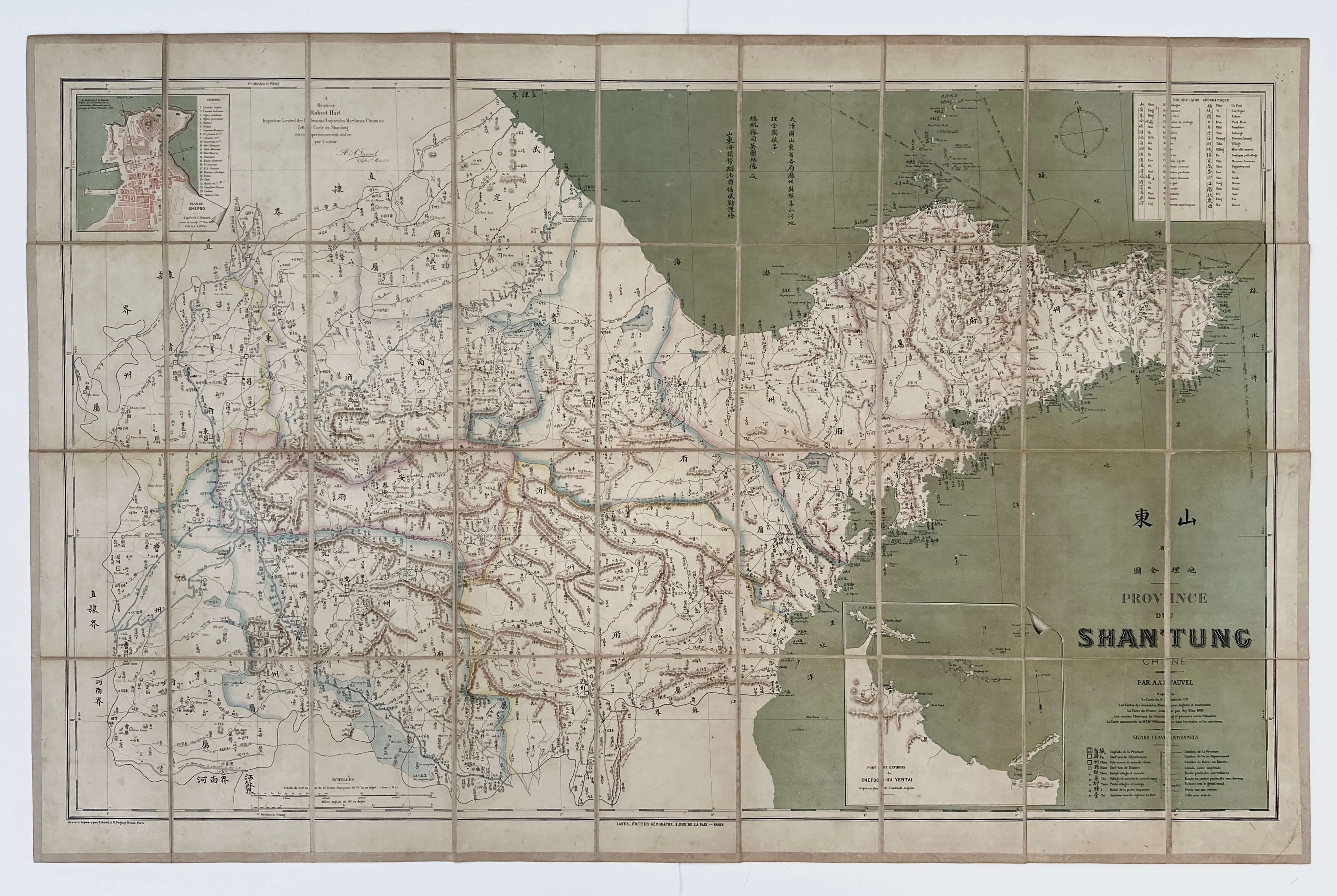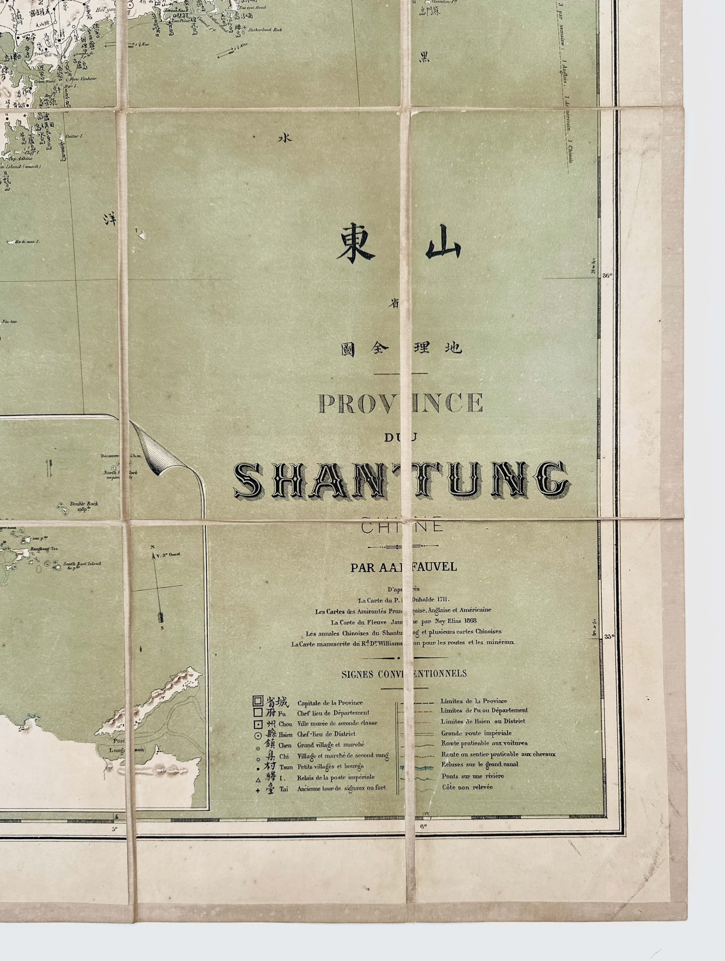 Rare first edition of the early detailed French map of the eastern Chinese province of Shantung (Shandong), compiled just over a decade after China had opened its ports to foreign trade as a result of its defeat in the Second Opium War (1856-1860). The compiler was a French naturalist and explorer, Albert-August Fauvel, who in 1872-1884 served in the Chinese Imperial Customs Service in Chefoo (Yantai) – the seat of the region’s foreign commerce. During the Sino-French War (1884-1885), Fauvel quit the Imperial Customs service and transferred to the Messageries Maritimes company, travelling around the Far East (Singapore, Dutch East Indies), Seychelles and Brazil. He compiled several works on the natural history and geography of Shandong Province and China and published the first detailed description of the Chinese alligator (Fauvel, A.A. Alligators in China: Their History, Description & Identification/ North-China Branch of the Royal Asiatic Society. Shanghai, 1879).