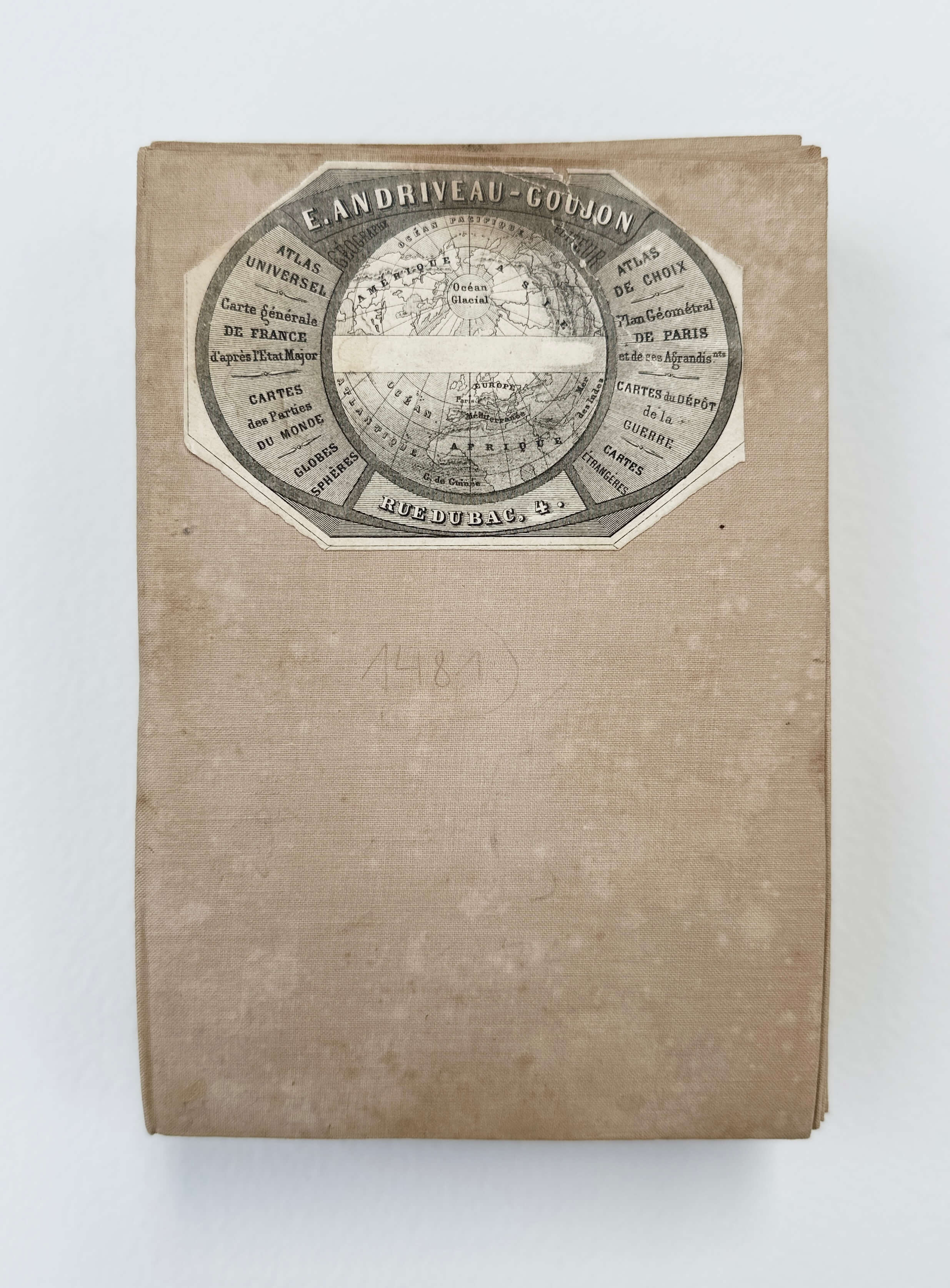Large folding lithographed map ca. 70x110 cm (27 ½ x 43 ½ in), dissected into 36 compartments and linen backed. Borders outlined in colour. With two inserts. The title and legend in the right lower corner, concise Chinese-French vocabulary of geographical terms in the right upper corner; names of the publisher and typographer on the lower margin. Place names in parallel French and Mandarin. Paper label of a Paris bookstore of Eugène Andriveau-Goujon pasted on verso. Map slightly age-toned, the linen of the outer compartments slightly soiled on verso, but overall a very good map.