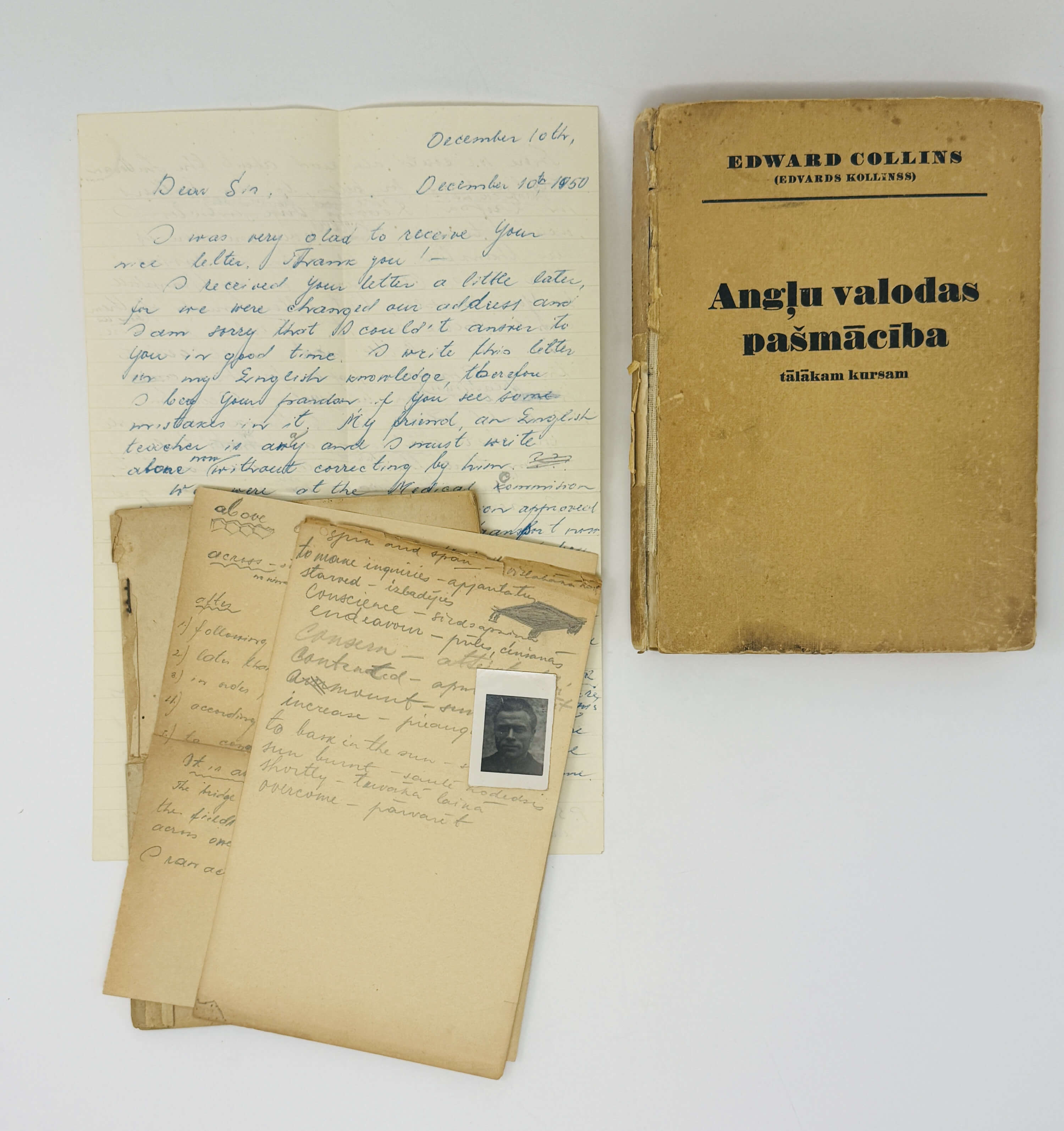 A book ‘Collins, E. Anglu valodas pašmācība tālākam kursam [i.e. Self-taught course of English] / translated by Gustav Meisters, edited by Ernests Blese, the professor of Latvian University. Stuttgard: Ausmas Apgāds, 1946. 336 p. Original cardboard binding. Tear alongside the binding, overall in good condition. Together with appendix of questions to each lesson in English (lacking one page).