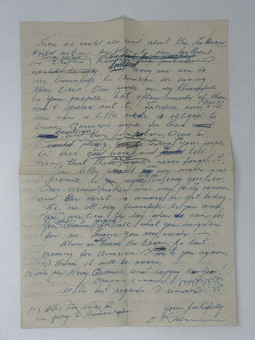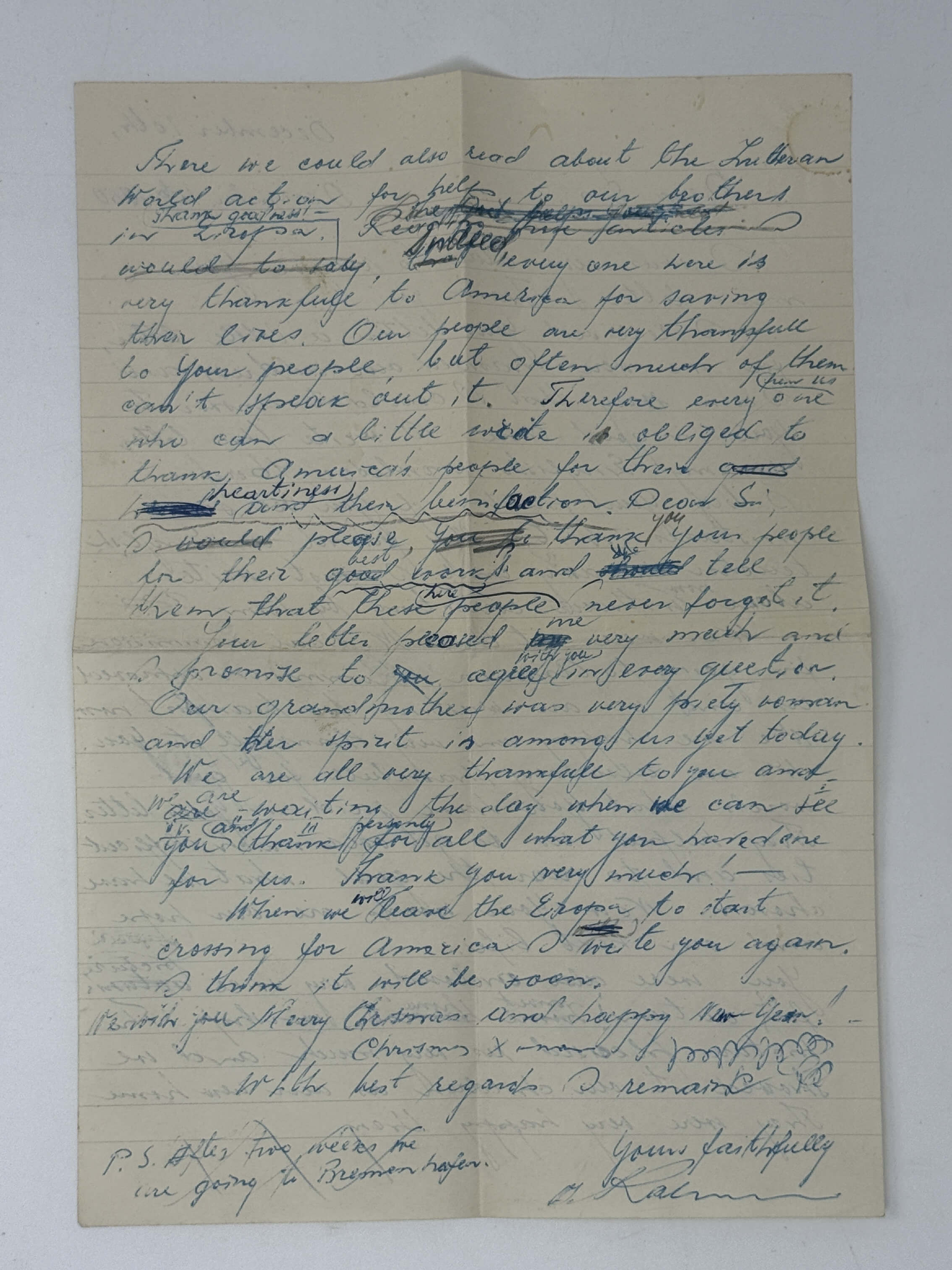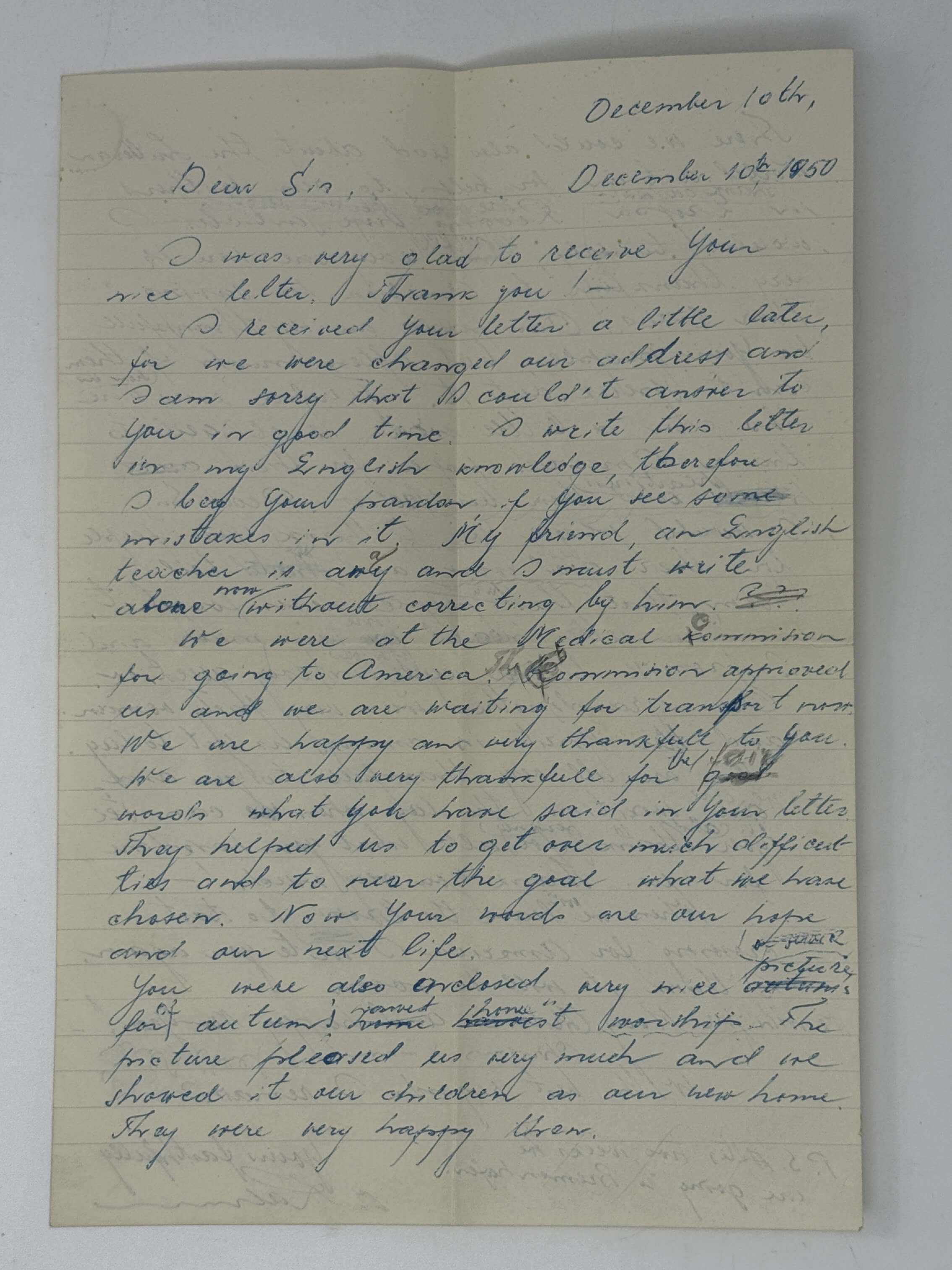 Quote from the letter: ‘Everyone here is very thankful to America for saving their lives. Our people are very thankful to your people, but often much of them can’t speak about it. Therefore everyone who can a little write obliged to thank American people for their heartiness and their benefaction. Dear sir, please thank the people there and tell them that people here will never forget it… When we will leave Europa for crossing to America, I write again… After two weeks we are going to Bremen harbour’. 10th of December, 1950. 2 p. 12 x 8 in.