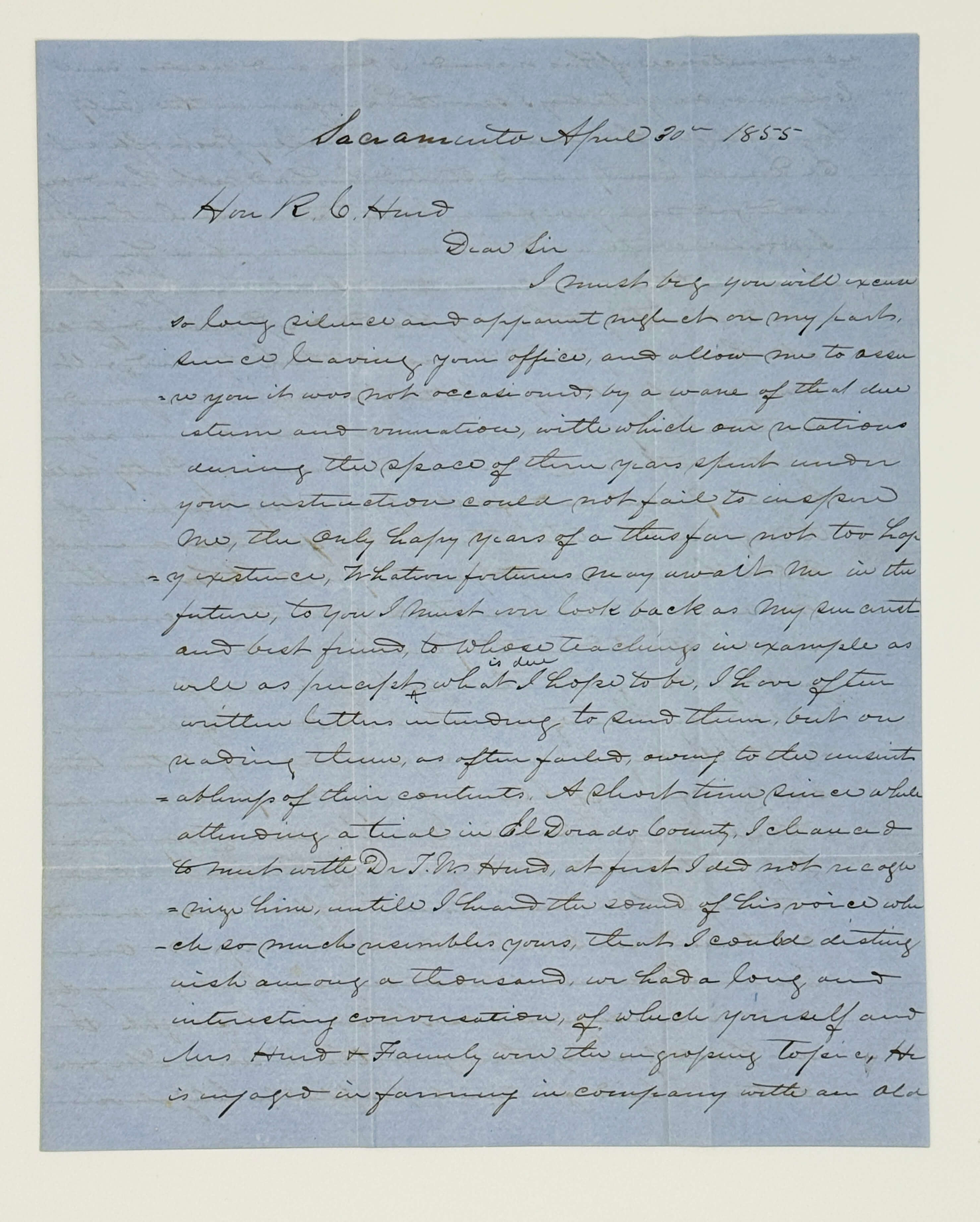 A short time since, while attending a trial in El Dorado County, I chanced to meet with Dr. J.W. Hurd, at first I did not recognize him. Until I heard the sound of his voice which so much resembles yours, that I could distinguish among a thousand, we had a long and interesting conversation, of which yourself and Mrs. Hurd & family were the engrossing topic. He is engaged in farming in company with an old acquaintance of his named C. Hix and resides near Coloma. Yesterday I saw the Dr. again in the city. He left me his address. “Gun Valley Post Office, El Dorado County” and stated he had not had any word from you for a long time, so I thought I would write and let you know where he is. Any letters you send to me, I will be very hapy [sic!] to forward directly to him by hand. He promised to call here every time he visited the city and he felt desirous of getting a letter from you & enquired particularly concerning all persons he was acquainted with in Mt. Vernon.