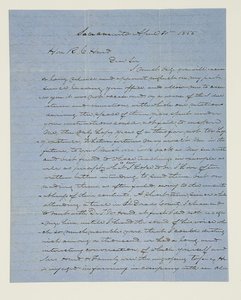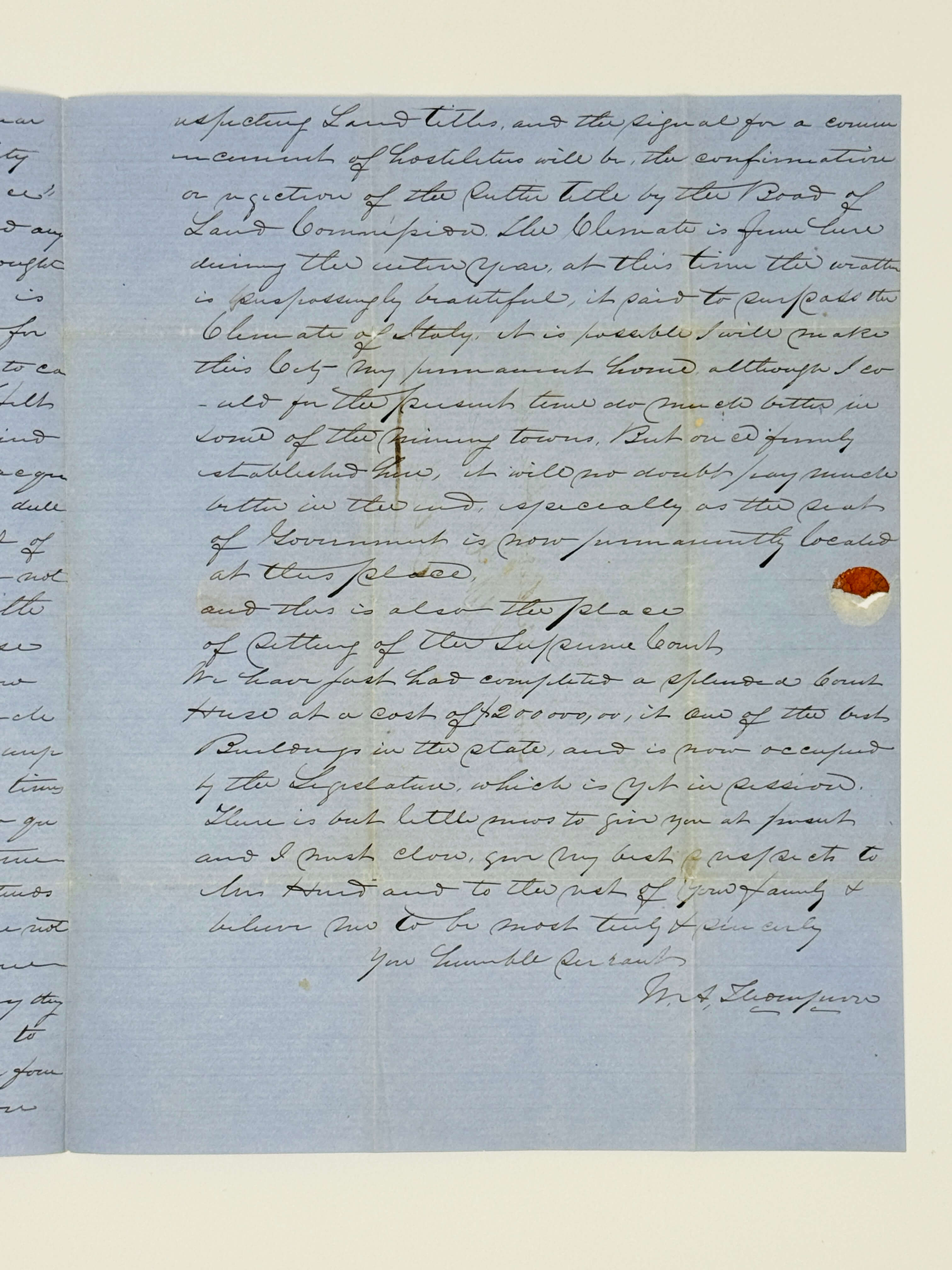 Thompson’s letter, written two years before his death, talks about his emerging practice (“just getting into that sort of business which will pay”) and life “in expectation of better times not far off.” He notes about his avoidance of “criminal practice” and preference of “much profitable litigation respecting land titles,” contemplates about the authorities’ decision regaring the Sutter Land Title (1841 Mexican Government’s Land Grant to John Augustus Sutter, revoked by the U.S. Supreme Court in 1858, but confirmed in 1864) and informs the addressee about the completion of “a splendid Court House at a cost of $200 000,00, is one of the best buildings in the state” (built in 1855, replaced in 1910). He also notes on a local “surpassingly beautiful” climate and his meeting with the addressee’s relative, a farmer from “Gun Valley, El Dorado County.” Overall an interesting, content-rich early Sacramento letter.