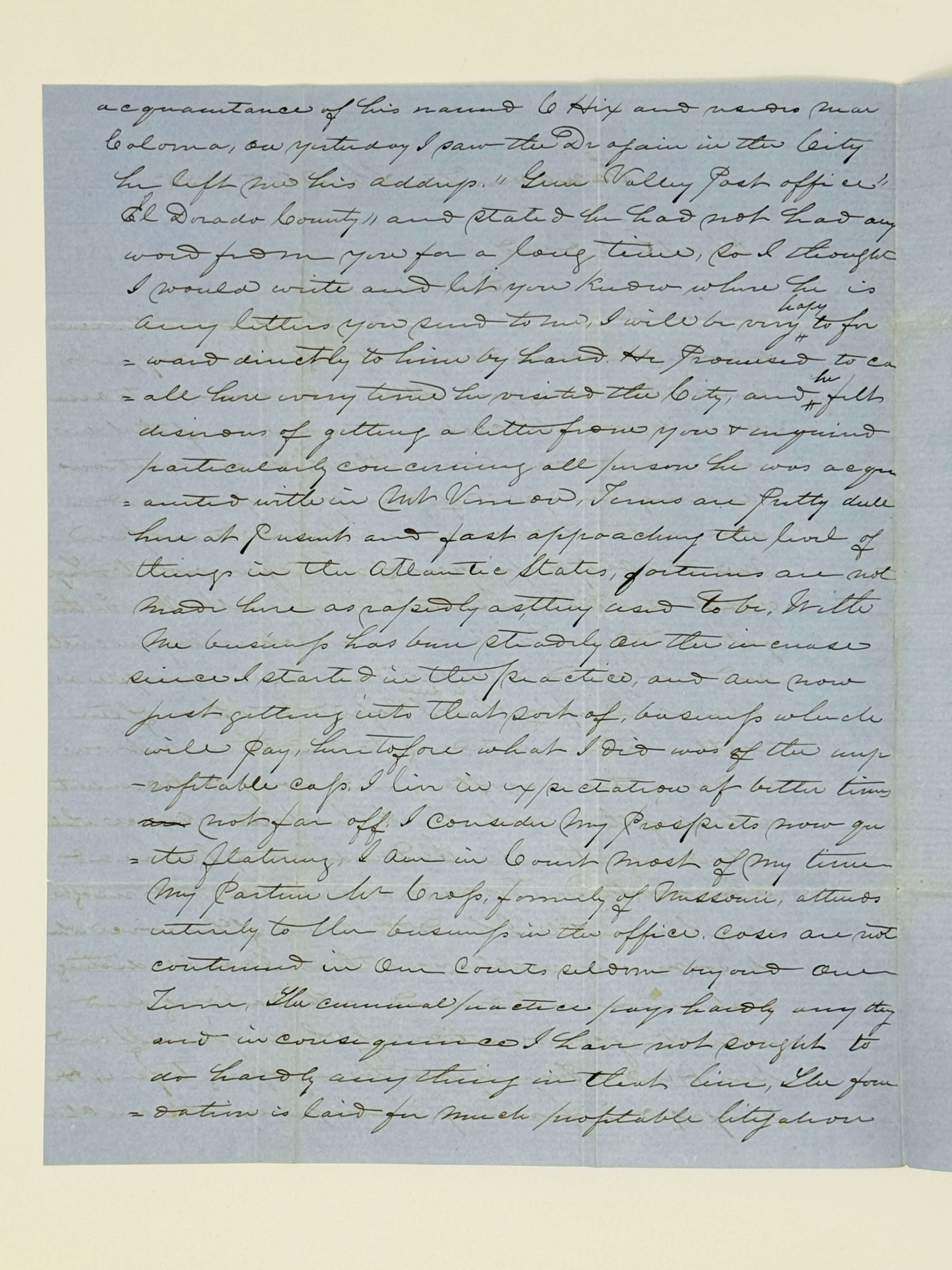 Times are pretty dull here at present and fast approaching the level of things in the Atlantic States, fortunes are not made here as rapidly as they used to be. With me business has been steadily on the increase since I started in the practice, and am now just getting into that sort of business which will pay, heretofore what I did was of the unprofitable [?]. I live in expectation of better times not far off. I consider my prospects now quite flatering [sic!]. I am in Court most of my time. My partner Mr. Cross, formerly of Missouri, attends entirely to the business in the office. <…> The criminal practice pays hardly any thing and in consequence I have not sought to do hardly anything in that line. The foundation is laid for much profitable litigation respecting land titles and the signal for a commencement of hostilities will be the confirmation or rejection of the Sutter title by the Boad [sic!] of Land Commission. The climate is fine here during the entire year, at this time the weather is surpassingly beautiful, it said to surpass the climate of Italy. It is possible I will make this city my permanent home although I could for the present time do much better in some of the mining towns. But once firmly established here, it will no doubt pay much better in the end, especially as the seat of Government is now permanently located at this place and this is also the place of setting of the Supreme Court.