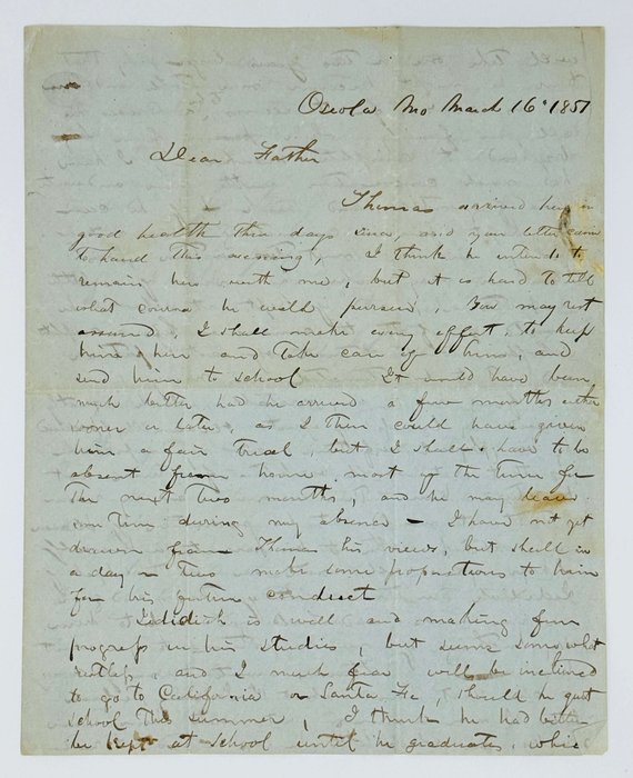 Jedidiah is well and making fine progress in his studies, but seems somewhat restless and I must fear will be inclined to go to California or Santa Fe, should he quit school this summer. I think he had better be kept at school until he graduates, which will take one or two years longer, by that time he might become more stable and firm in his views, for it seems to be a crisis in all our family, when passing from boyhood to complete manhood. I have had much conversation with him and write him frequently, and think if he can be kept from committing some act of folly in the next two or three years, that he may make a man of no little importance and if kept at school he would go forth to commence lide a complete scholar, which I think of vast importance and not to be estimated in many. <…>