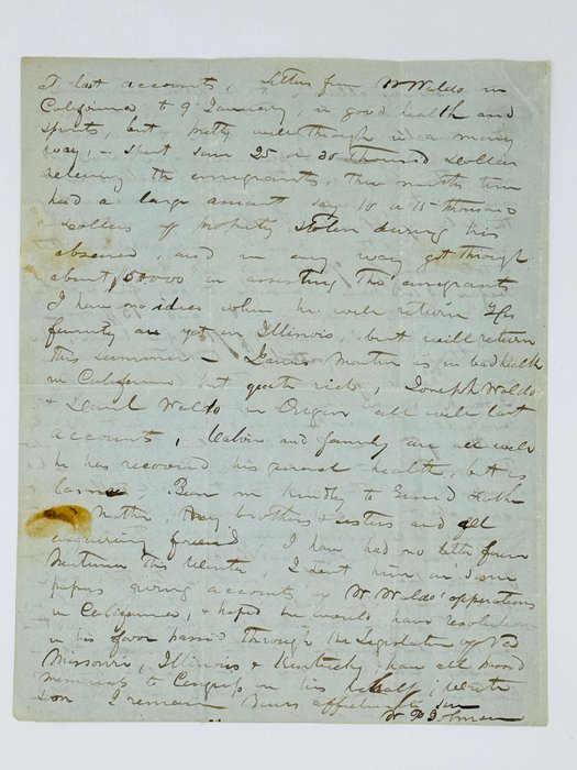 My love to Mother and she can rest assured that I will leave nothing under to take care of Thomas. There will be a continuous Railroad from this region to the East in a few years, and then we shall look for you & mother if you do not come sooner. The kins are all well in this country. William Marten in Santa Fe at last accounts. Letters from W. Waldo in California to 8 January, in good health and spirits, but pretty [well through?] in a many way. Spent sum 25 or 30 thousand dollars releasing the emigrants, three months time had a large amount, say 10 or 15 thousand dollars of property stolen during his absence and in any way got through about $50,000 in assisting the emigrants. I have no ideas when he will return. His family are yet in Illinois, but will return. Janus Marten is in bad health in California, but quite rich. Joseph Waldo & [Samuel?] Waldo in Oregon, all well last accounts. Calvin and family are all well, he has recorded his grand health, but is lame. <…> I have had no letter from [Mortimer?] this month. I sent him some papers giving accounts of W. Waldo’s opperations [sic!] in California & hoped he would have resolutions in his favor passed through the Legislation of Va., Missouri, Illinois & Kentucky, have all passed memorials to Congress in his behalf <…>”