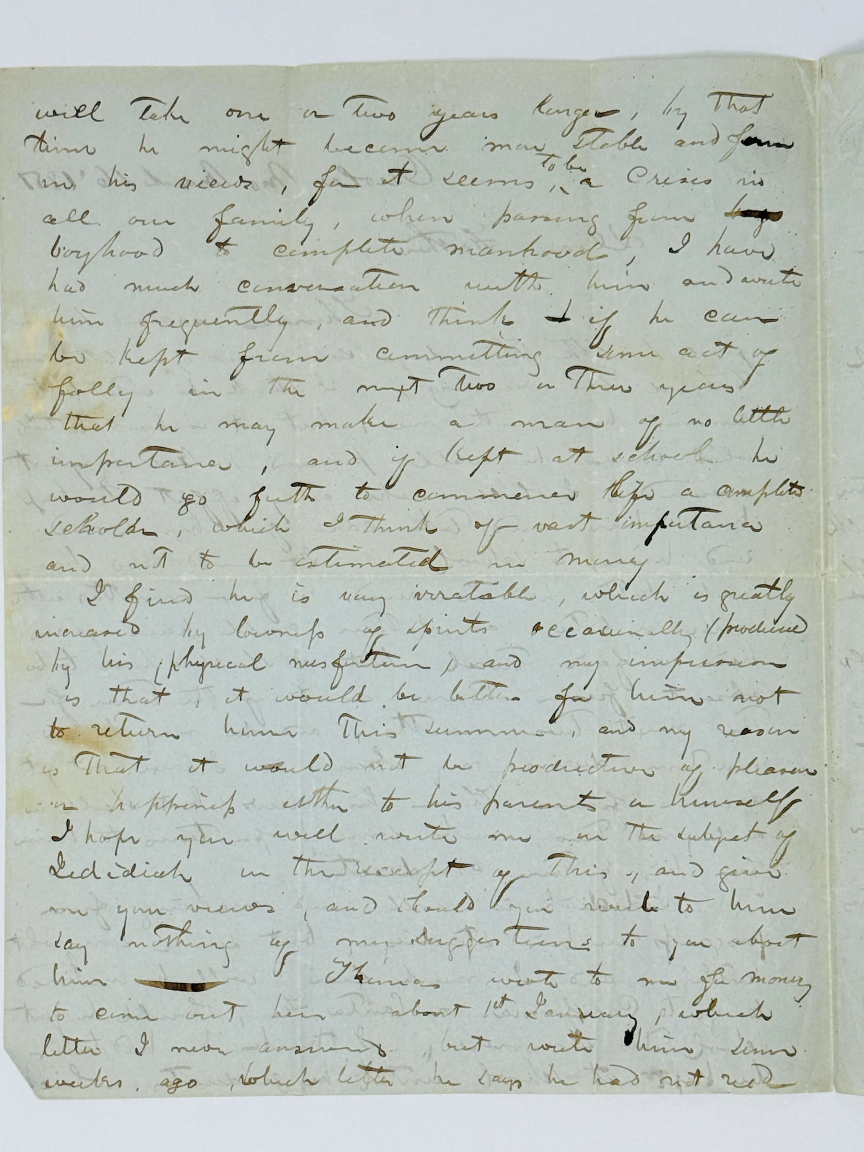 I find he is very irratable [sic!], which it greatly increased by <…> of spirits occasionally <…> and my impression is that it would be better for him not to return home this summer <…>