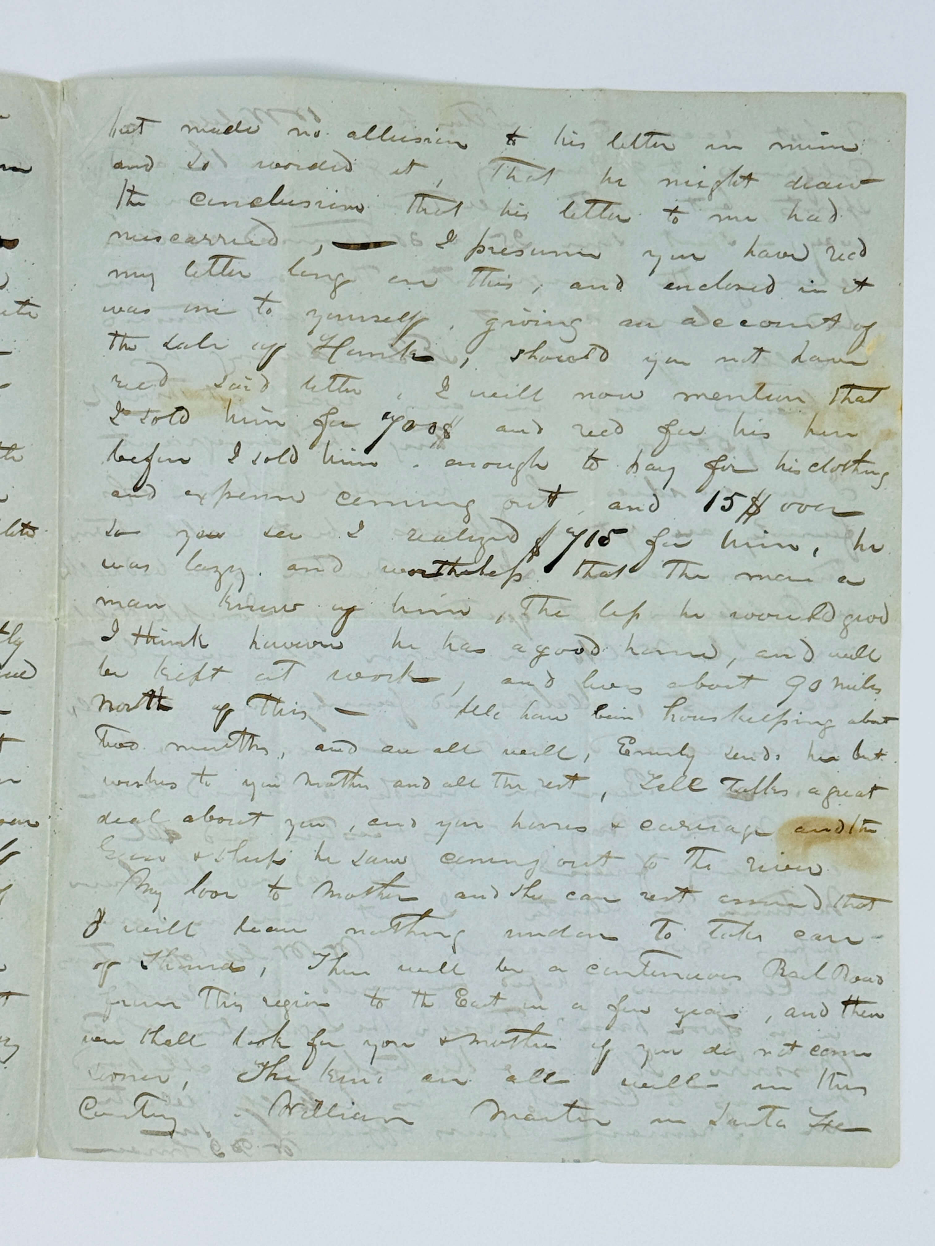 My love to Mother and she can rest assured that I will leave nothing under to take care of Thomas. There will be a continuous Railroad from this region to the East in a few years, and then we shall look for you & mother if you do not come sooner. The kins are all well in this country. William Marten in Santa Fe at last accounts. Letters from W. Waldo in California to 8 January, in good health and spirits, but pretty [well through?] in a many way. Spent sum 25 or 30 thousand dollars releasing the emigrants, three months time had a large amount, say 10 or 15 thousand dollars of property stolen during his absence and in any way got through about $50,000 in assisting the emigrants. I have no ideas when he will return. His family are yet in Illinois, but will return. Janus Marten is in bad health in California, but quite rich. Joseph Waldo & [Samuel?] Waldo in Oregon, all well last accounts. Calvin and family are all well, he has recorded his grand health, but is lame. <…> I have had no letter from [Mortimer?] this month. I sent him some papers giving accounts of W. Waldo’s opperations [sic!] in California & hoped he would have resolutions in his favor passed through the Legislation of Va., Missouri, Illinois & Kentucky, have all passed memorials to Congress in his behalf <…>”