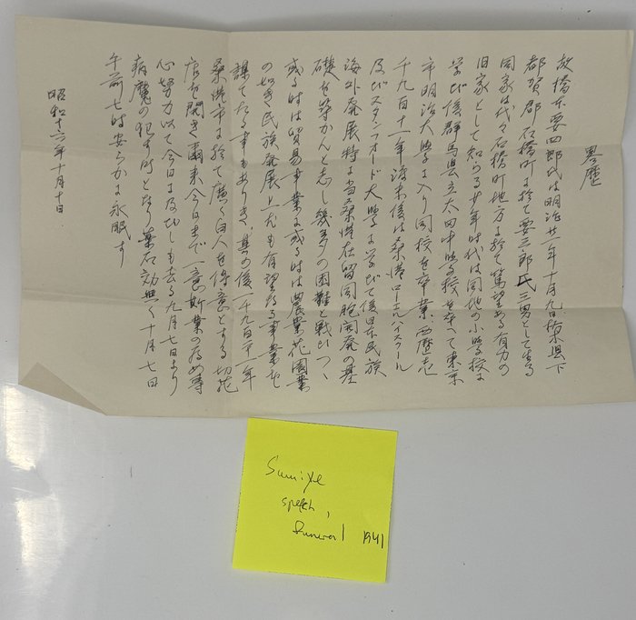 — Sumiye Hashimoto. The handwritten speech at the funeral of her husband, Yoshiro. San Francisco, ca. 10th of October, 1941. [1] p. 8,5 x 12 in. In Japanese.