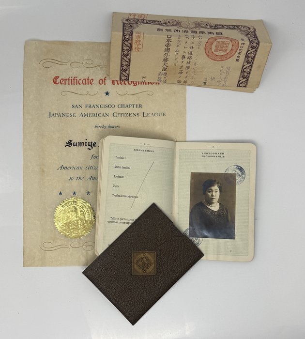 — Imperial Japanese Government Passport N120431. Ca.1929. Sumiye Hashimoto’s passport on his proceeding to America. Together with 1 p. of rules for foreign residents. In Japanese