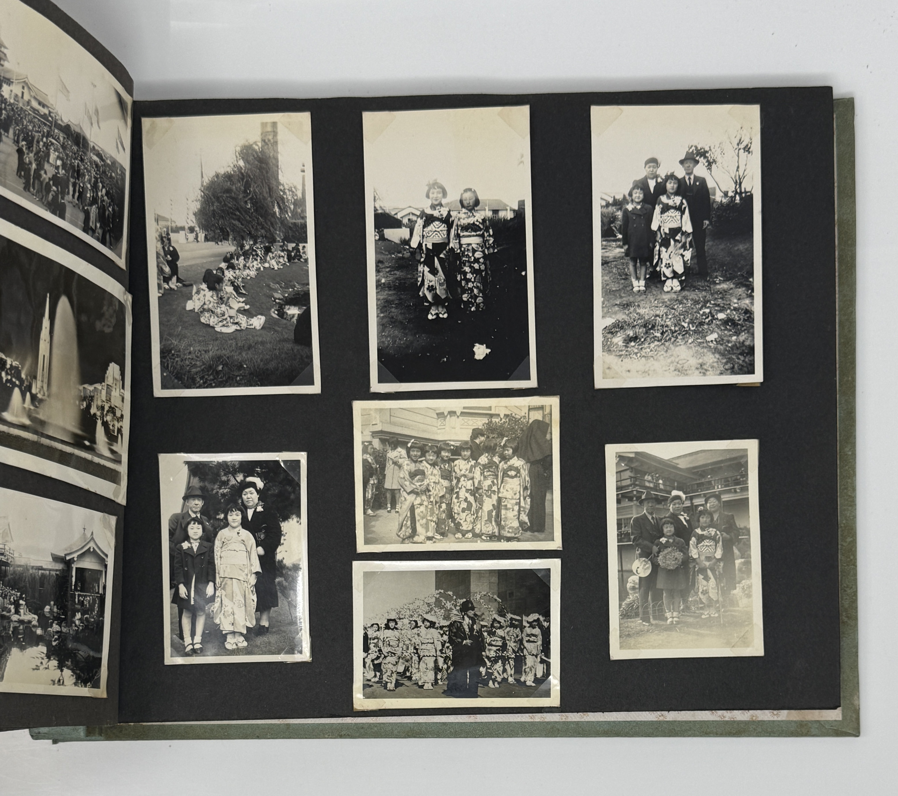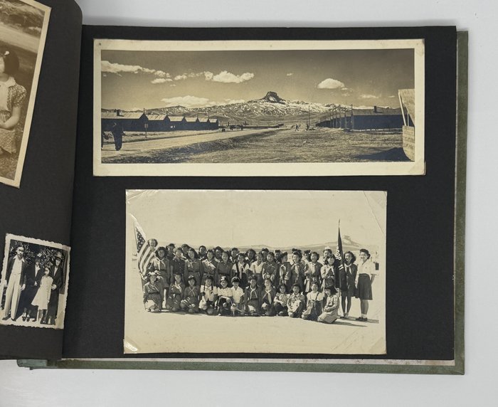 The family shown visiting California World’s Fair in San Francisco Bay on Treasure Island in 1939. The Japanese American procession is photographed in traditional attire, carrying American flag, as well as Japanese pavilion. One photo shows family photographed next to three Japanese sailors, likely from Japanese steamer SS Korea Maru - the only time the family traveled back to Japan was on this steamer in 1931. Two photos are from Heart Mountain camp: a panoramic view of the camp and the Girl Scout group photo of the camp with the flag of the group and the American flag.