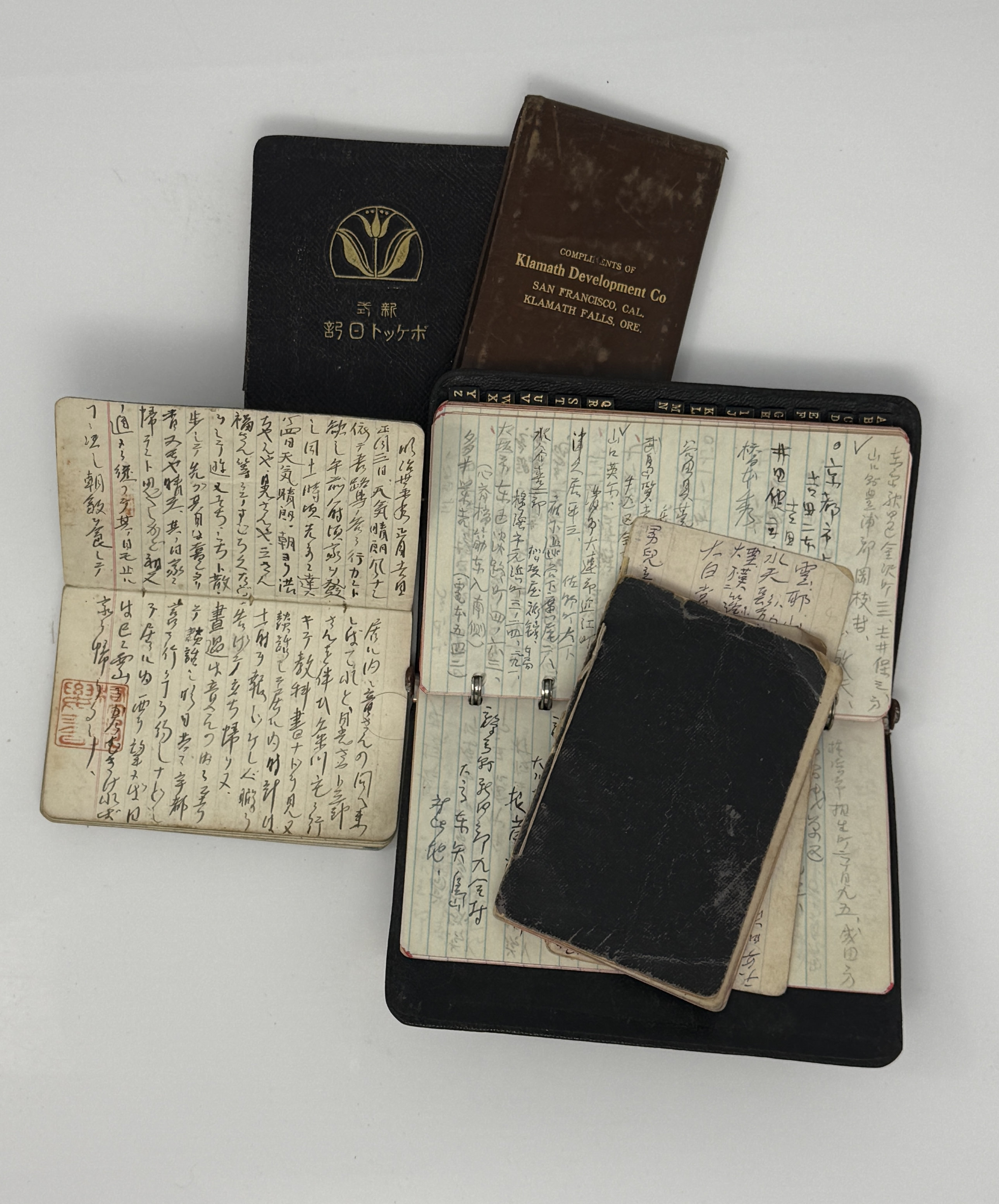 The notebooks that were kept by Yoshiro during his time in Meiji University in Tokyo in 1900s and 1910s and supplemented by him in his early years in San Francisco. The books contain the addresses of acquaintances in Japan and USA, the notes of lectures, letter drafts, the train tables, the list of events in Japanese history, the rates for the money transfers, three-line haiku likely composed by Yoshiro himself and a folk method for treating beriberi (脚気).