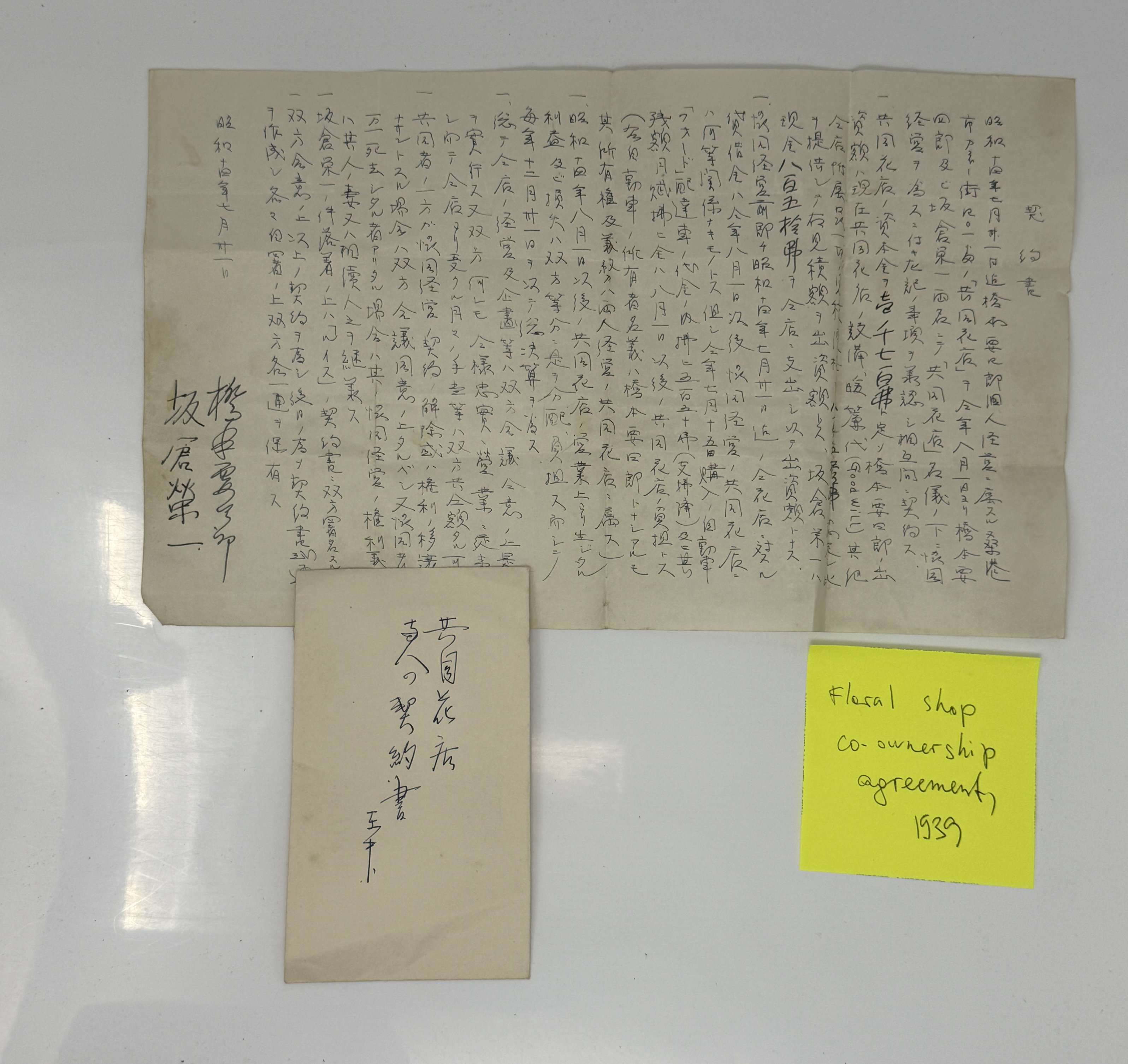— The floral shop co-ownership agreement. Between Yoshiro Hashimoto and Sakakura Eiichi (坂倉榮). San Francisco: ca.31st of July, 1939. [1] p. 8,5x14 in. Together with the handwritten envelope. Signed by both businessmen at the end.