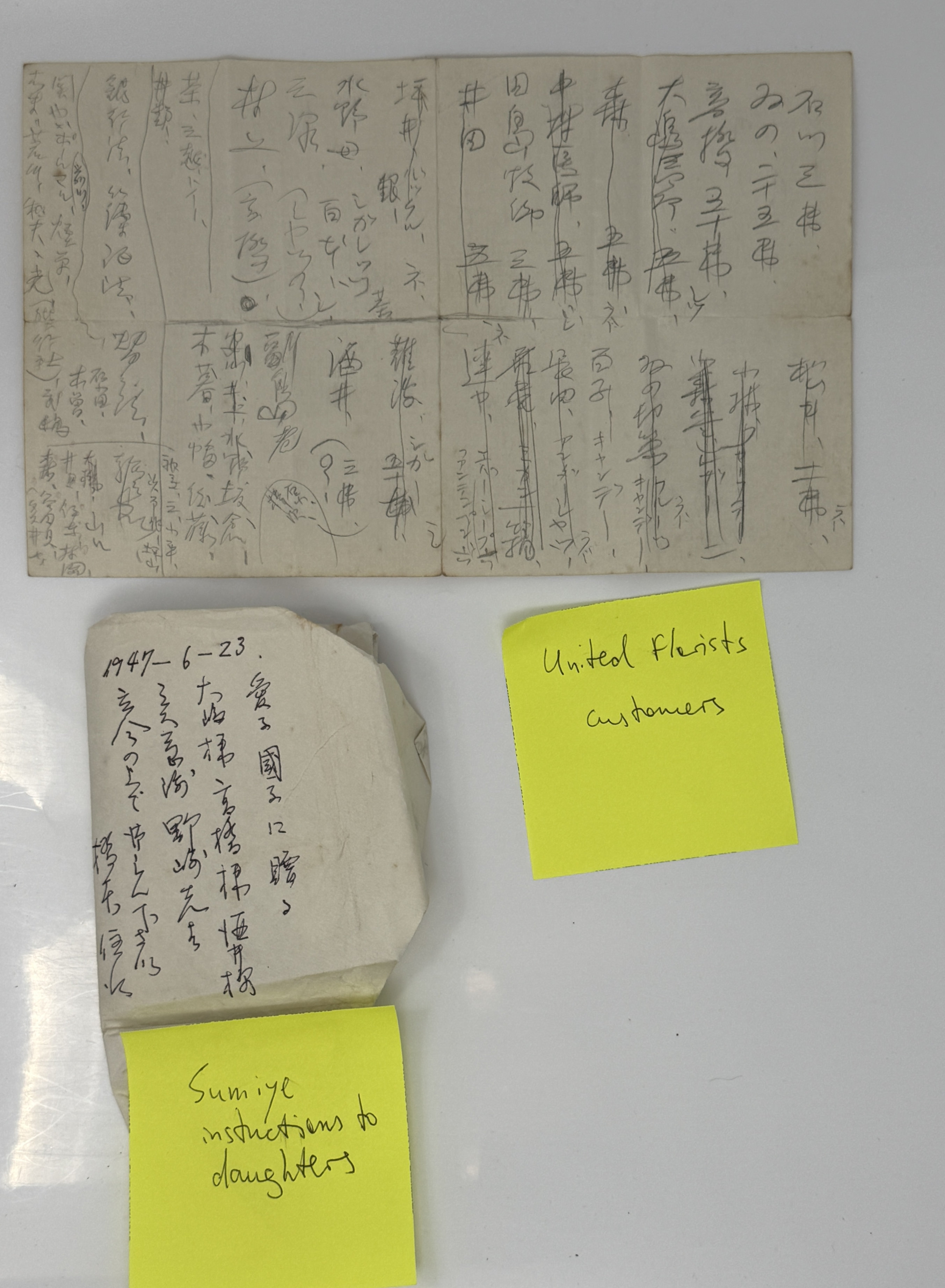 On the verso of the letter the accounting for United Florists, with the names of customers owned money to the shop and the amounts. In Japanese.