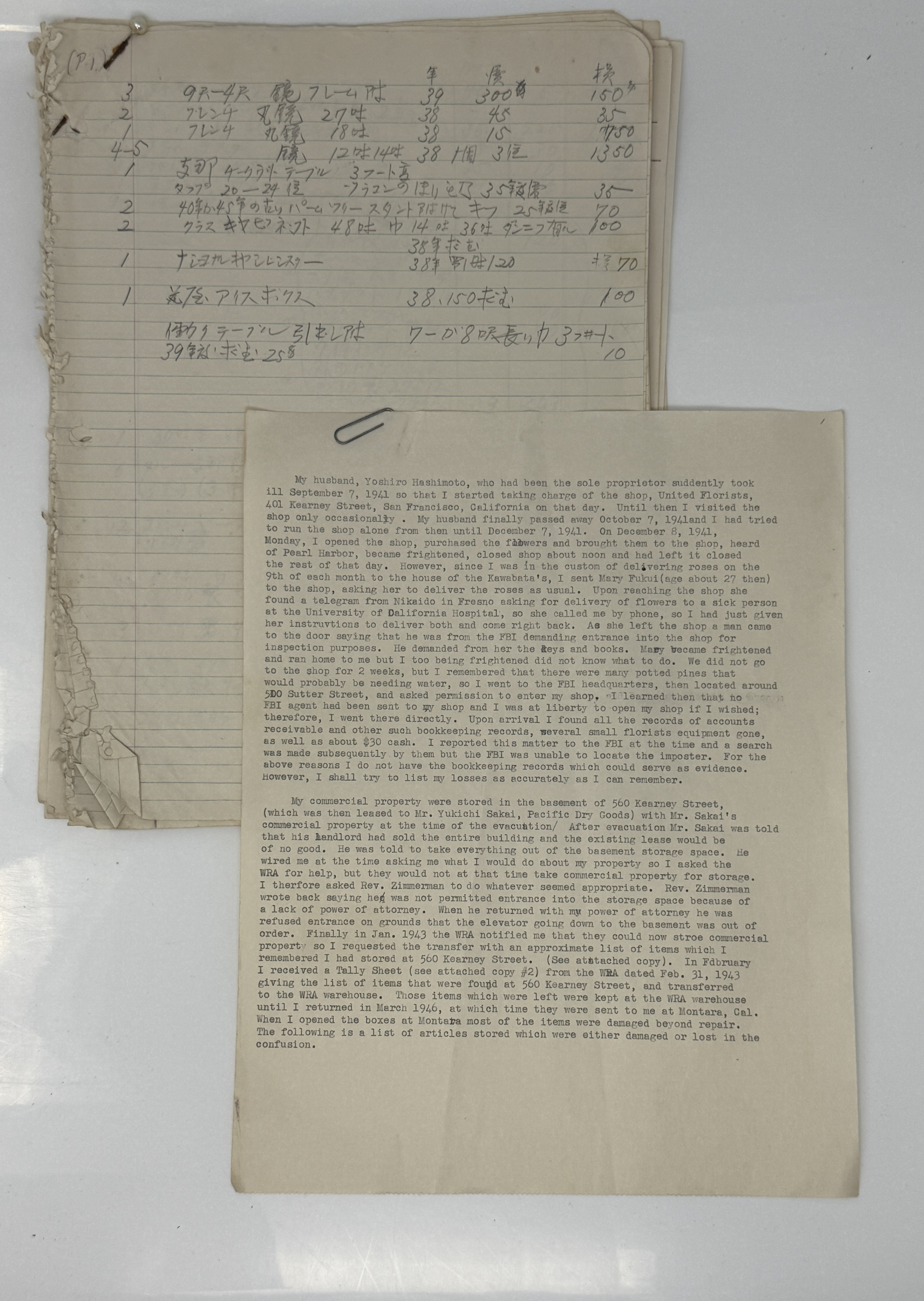 The list is the inventory of the floral shop as of late 1941, when the business was grounded to a halt by the war. It details all the vases, Japanese, Chinese and German, office supplies, ribbons, Japanese plants (with remark that they were stored with friends and dried up due to inexperienced care). Accounts receivable at the end of this section give names and business relationships with customers, for example: ‘Aki Hotel. $15 on flowers sent, requested payments about Jan.1942, Mes.Aki refused me payment stating she knows nothing about the business and I would have to wait till her husband returned from internment camp’.; ‘Aso Sanzo, manager at Nippon Hotel. About $100 for flowers delivered. He was interned 12/7/1949 and has since been deported to Japan. Whereabouts unknown’. ‘Mitsubishi. About $50 for flowers delivered. Closed with outbreak of war, employees deported cannot obtain payments’, ‘About 17 or 18 Philipine customers $100. One of these was chief waiter at Mssajin, so I went to request payment and told he was at St.Francis hotel, but with travel restrictions on our travel beyond Van Ness Avenue I was unable to go and see him. Requested payments of those living in the Fillmore are, but was refused of payment or could not collect in time before evacuation’. Total loses for United Florists stated as over $4000.