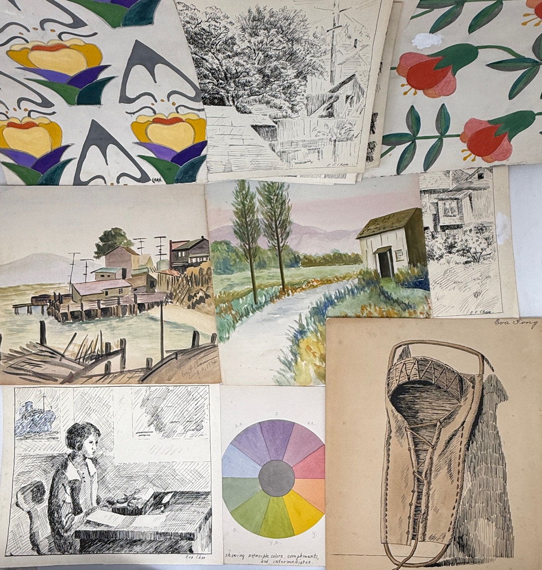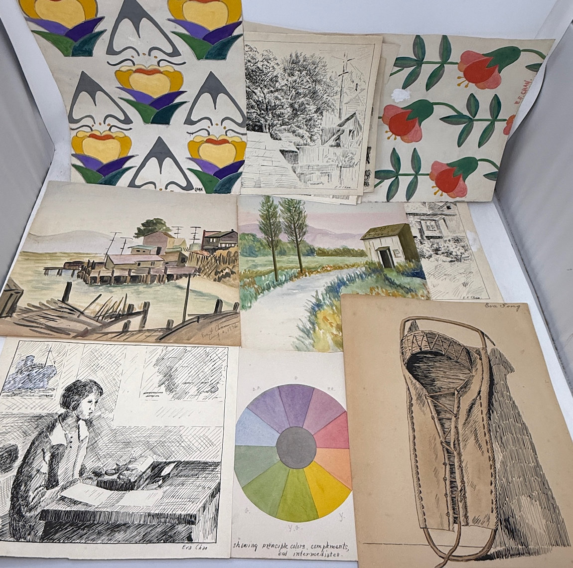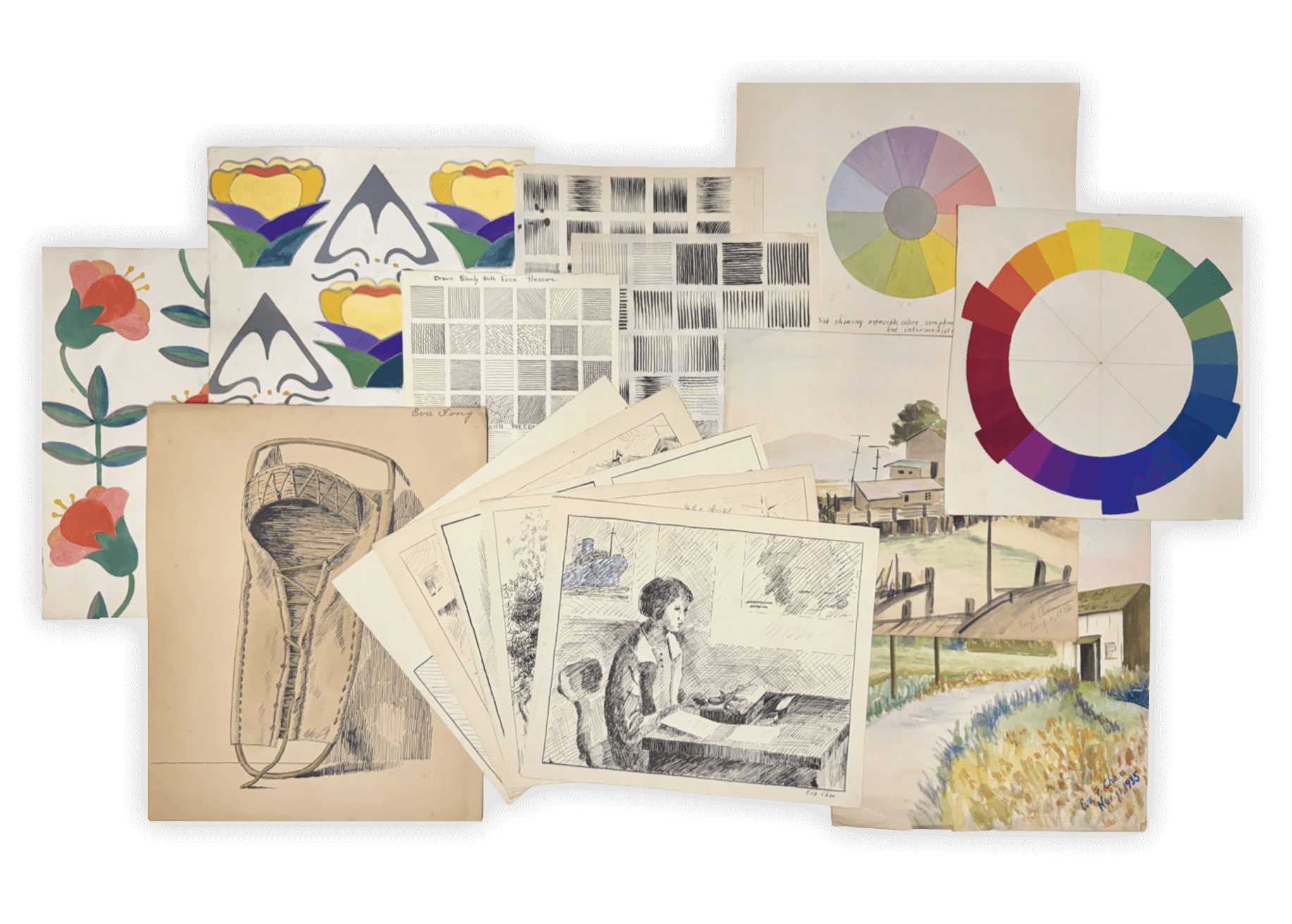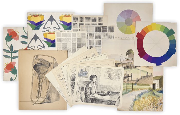 The archive consists of the artist’s self-portrait in ink, showing her at her work station with the image of an ocean steamer framed next to a window; four landscapes—two in watercolor and two in ink—depicting wooden walkways and buildings by the water, dated August 2, 1936; and the landscape with the path leading to a shack in the field, dated November 11, 1935. Also included are two studies of a backyard—likely the artist’s own—both signed but undated; two ink drawings of drapery and plaids; and a detailed study of a Native American rawhide cradle in watercolor and ink (the largest work in the archive); two floral design patterns, possibly intended for textiles or wallpaper; two watercolor color wheels, one with an explanatory note by the artist; and three sheets showing the “palette-bed” for various ink techniques—variations of lines and patterns used in her drawings—one bearing two handwritten notes: “Drawn Slowly With Even Pressure” and “Drawn Quickly With Freedom.”