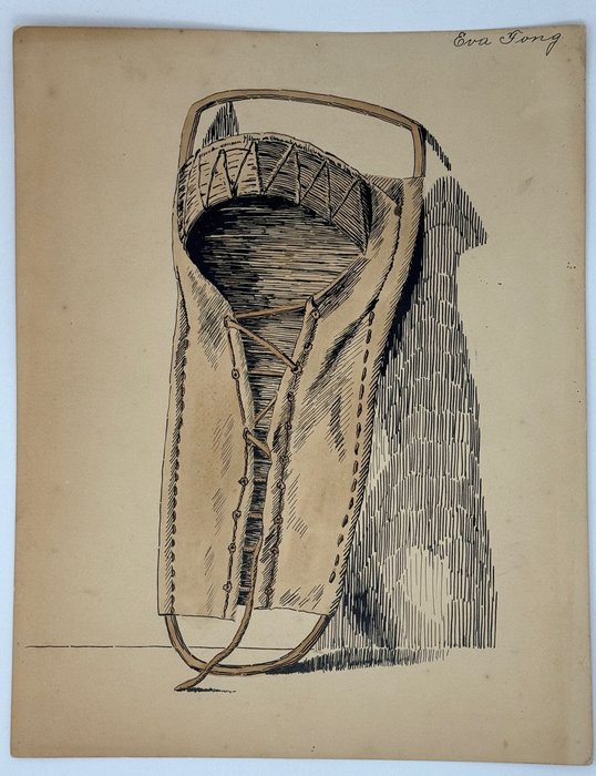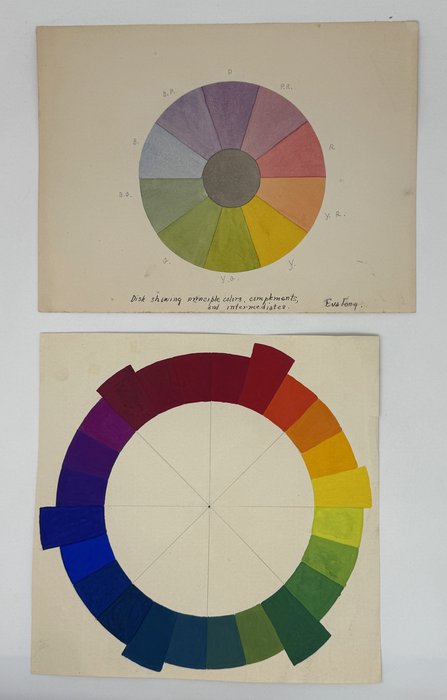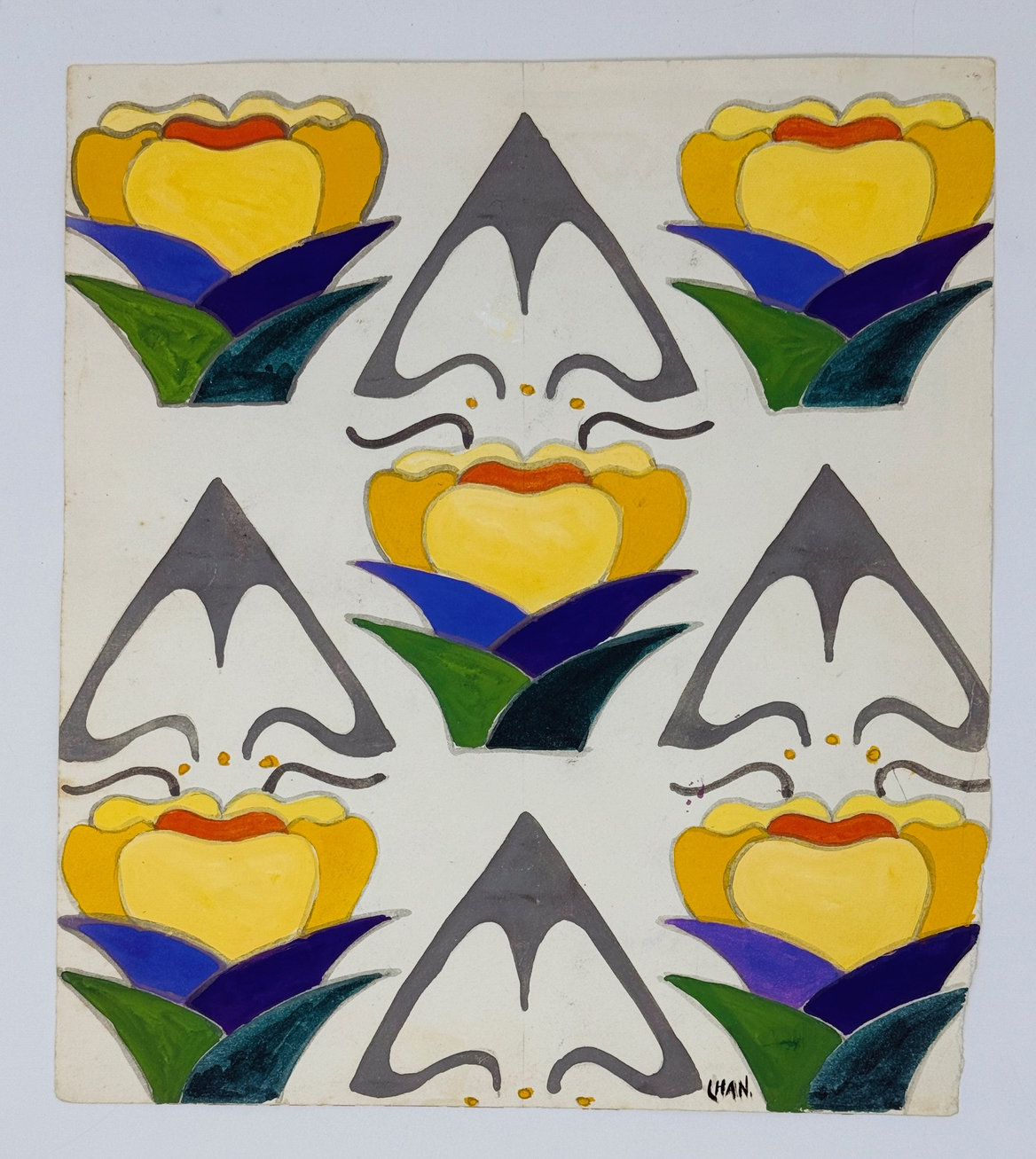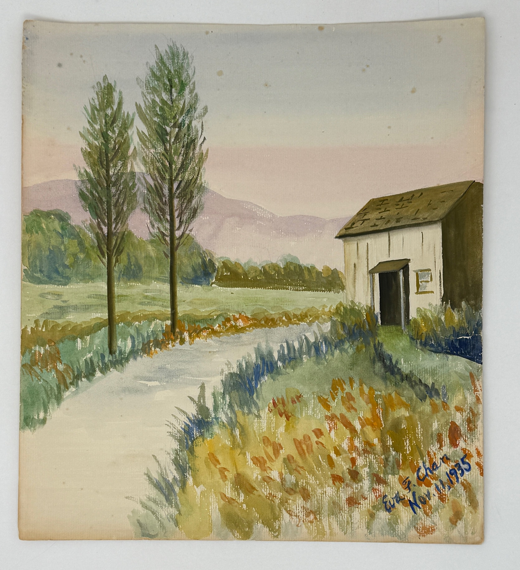 The archive consists of the artist’s self-portrait in ink, showing her at her work station with the image of an ocean steamer framed next to a window; four landscapes—two in watercolor and two in ink—depicting wooden walkways and buildings by the water, dated August 2, 1936; and the landscape with the path leading to a shack in the field, dated November 11, 1935. Also included are two studies of a backyard—likely the artist’s own—both signed but undated; two ink drawings of drapery and plaids; and a detailed study of a Native American rawhide cradle in watercolor and ink (the largest work in the archive); two floral design patterns, possibly intended for textiles or wallpaper; two watercolor color wheels, one with an explanatory note by the artist; and three sheets showing the “palette-bed” for various ink techniques—variations of lines and patterns used in her drawings—one bearing two handwritten notes: “Drawn Slowly With Even Pressure” and “Drawn Quickly With Freedom.”