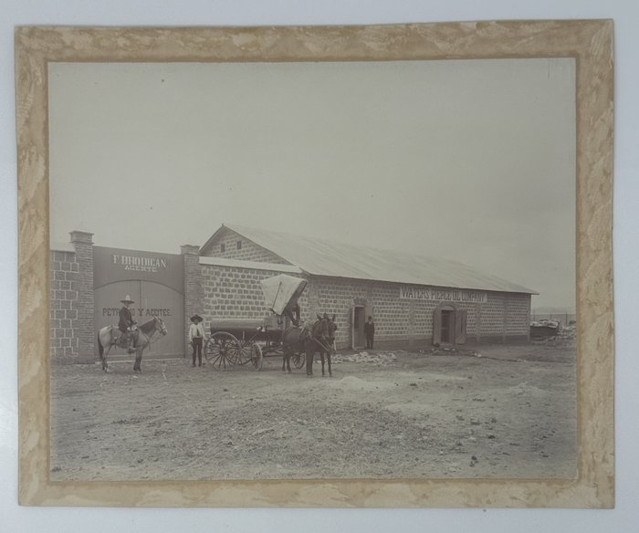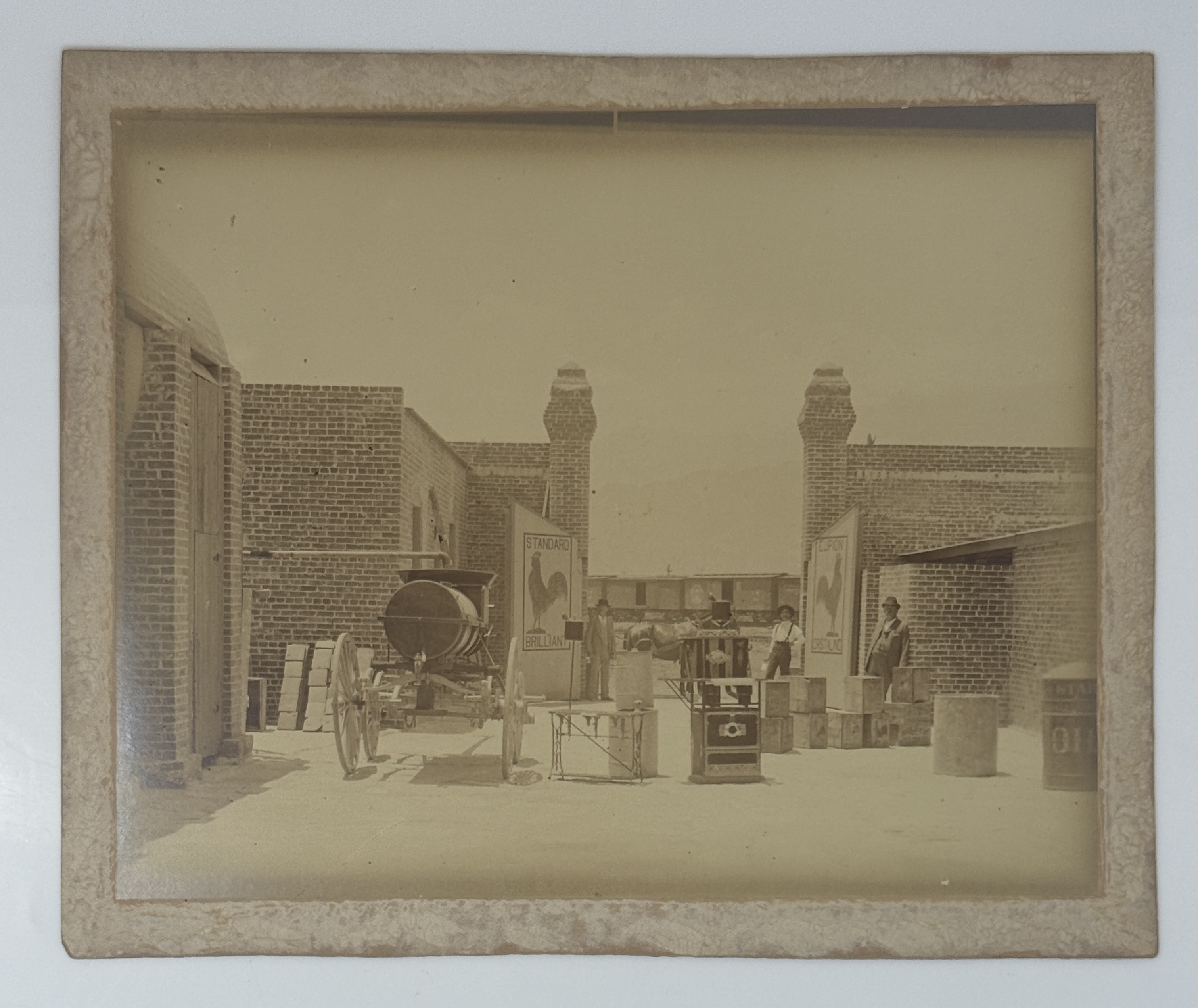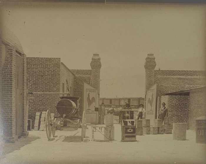 The photo of the depository from the outside shows the gate with the ‘Standard. Brilliant’ slogan on the gate and the image of the rooster, as well as the advertisement in Spanish, explaining the activity of Waters-Pierce, that is laid out of bricks on the wall of the depository. The other photo shows the depository from another side, with the name ‘F. Brogan, Agente’ written over the gate - a possible operator of this refinery. The man, dressed as an American, stands next to the door with the sign ‘Despacho’ [I.e. Office]. The image of the freight train on the background of third photo shows the train ready for loading, with the logo of a Mexican railway on one of the cars. Two railroad tracks could be seen on the same photo.
