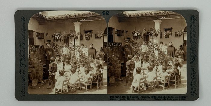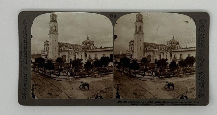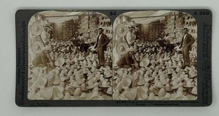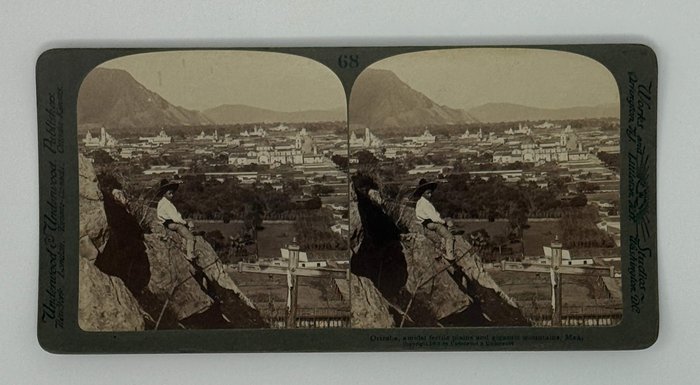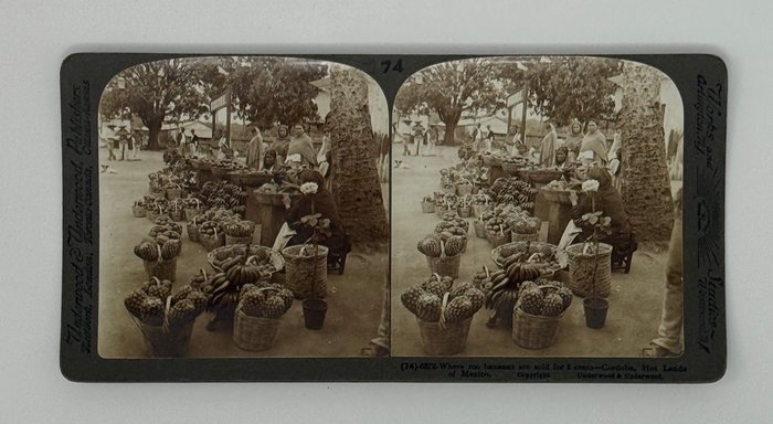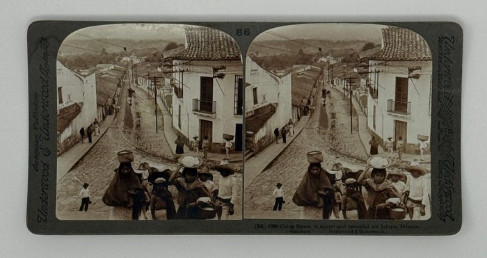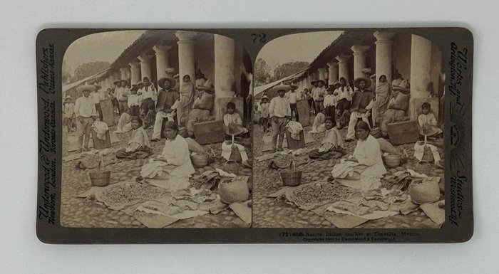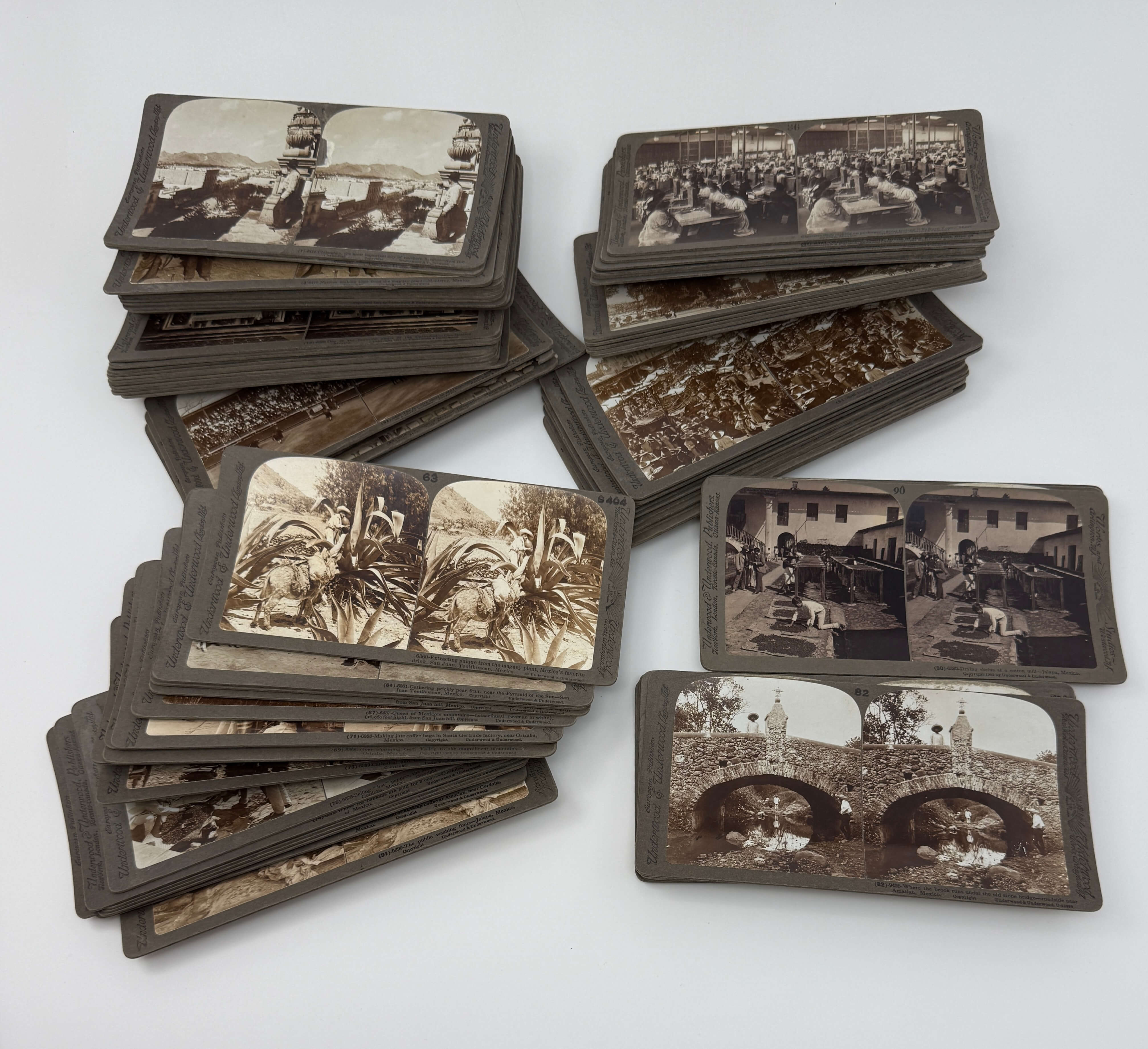 Ninety-four pairs of albumen stereoview photographs, including four duplicates, each pair ca. 7,5x15 cm (2 ¾ x 6 in) mounted on original grey ‘Underwood&Underwood’ cards. All photos are captioned at the bottom of the card, many has explanatory text at the back: a few paragraphs in English, and the translation of the main title of the photograph into Spanish, German, French, Danish and Russian. A few card mounts with wear and sign of a book-worm, but not affecting the images (except for the bottom margins of images number 32 ‘Calendar Stone’ and number 70 ‘Carpet Factory’), otherwise a very good collection of strong stereoviews.