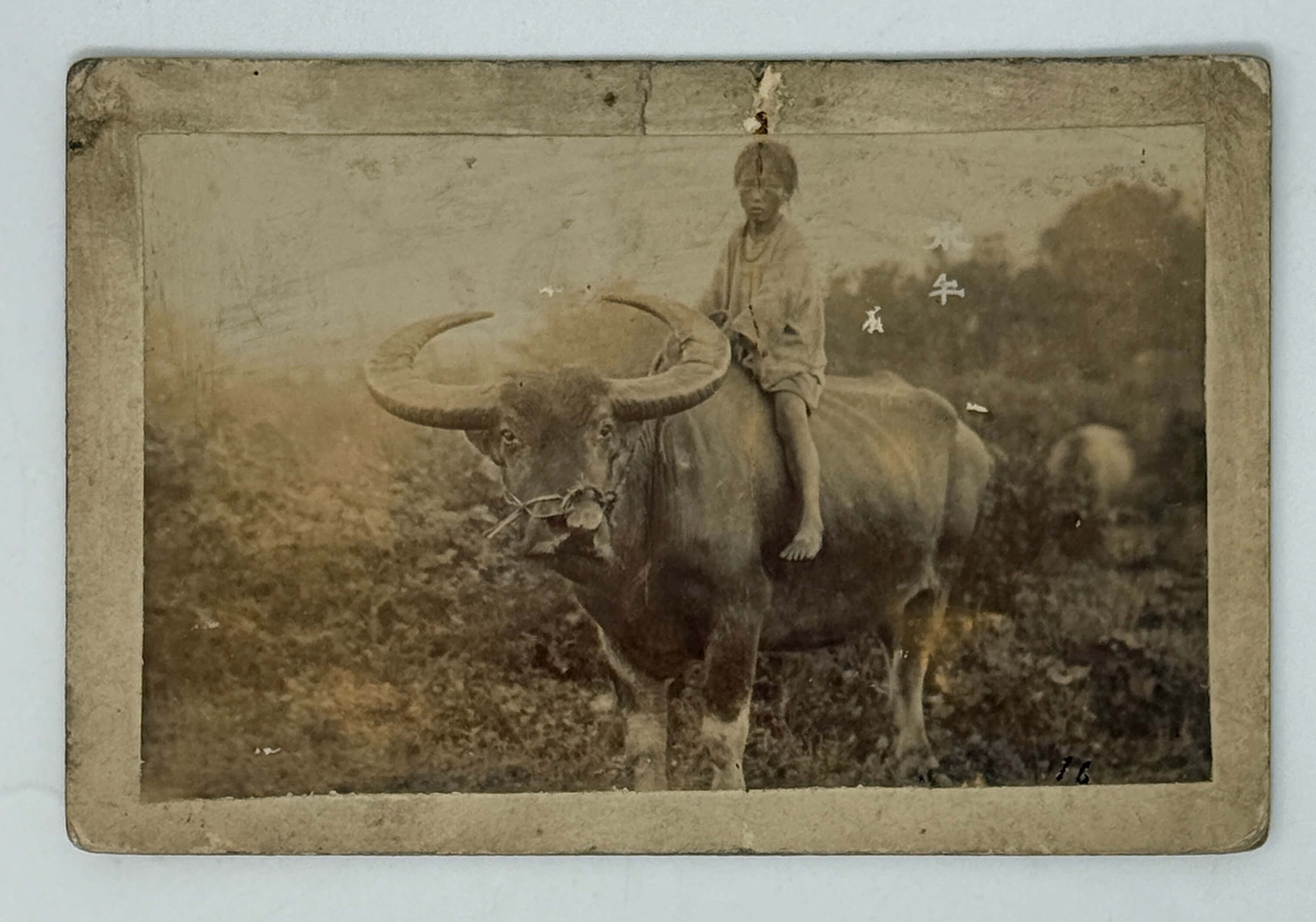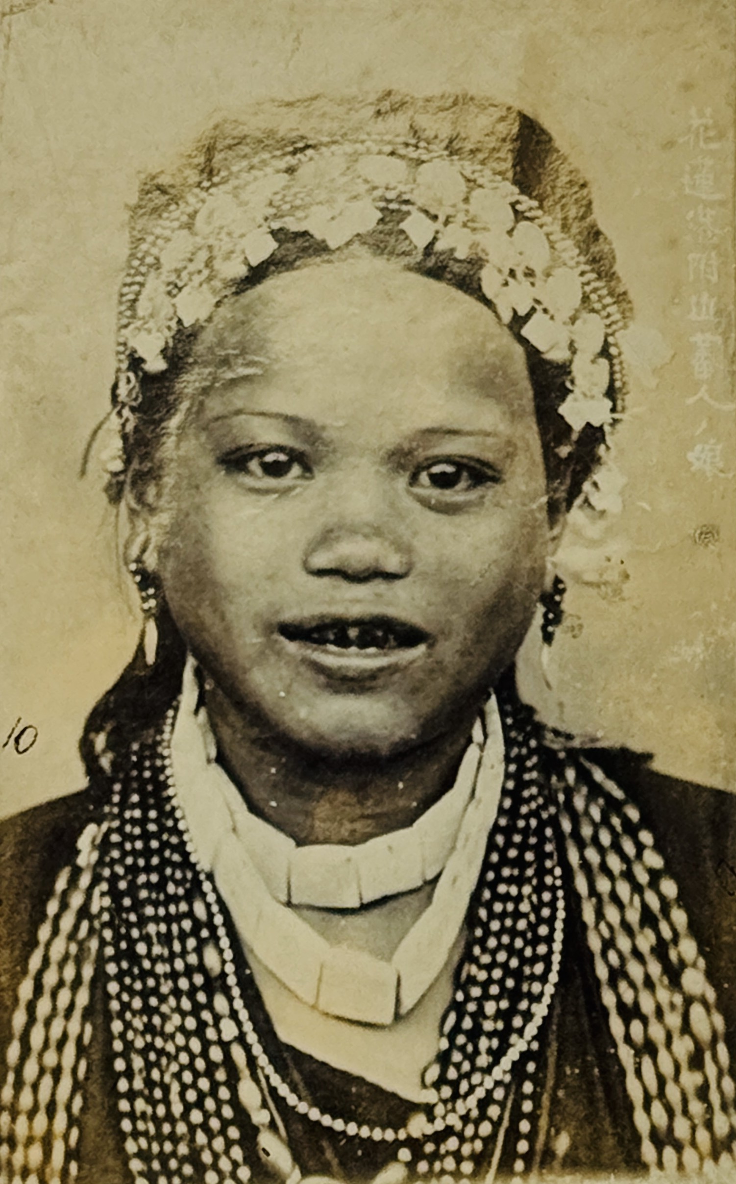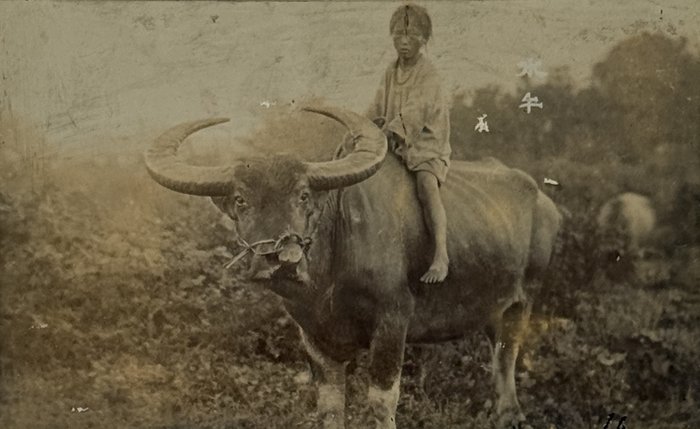 The photos include nine portraits: an image of ‘Pisao’, the deputy chief of the group, in traditional attire, with face tattoos, portrait of a woman wearing head decorations and jewelry , two warriors photographed with their weapons, children wearing festive attire (this photograph might be showing Puyuma people of Taiwan, as the clothes are similar to their tradition), a boy on a buffalo and portrait of a younger women, titled ‘the wife of Taroko aboriginal’.