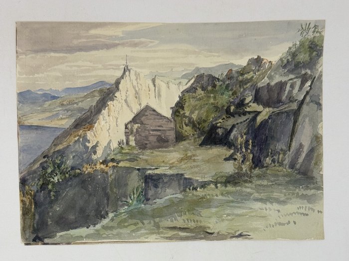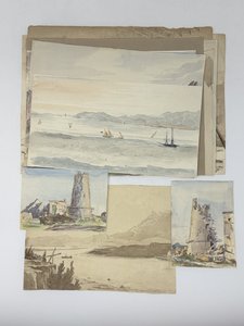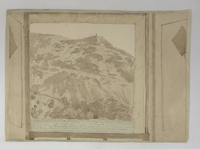 Eleven watercolour and two pencil drawings, mostly larger ones from ca. 24x30 cm (9 ½ x 11 ¾ in) to ca. 15x27,5 cm (5 ¾ x 10 ¾ in); two smaller drawings are ca. 10x13,5 cm (4 x 5 ¼ in). All with period ink captions on verso. One drawing with a pencil date “1824,” one with an ink date “April 7, 1825” in the right lower corners. One drawing is mounted on a period album leaf. Paper of two pencil drawings slightly age-toned, several minor tears on extremities, but overall a very good collection.