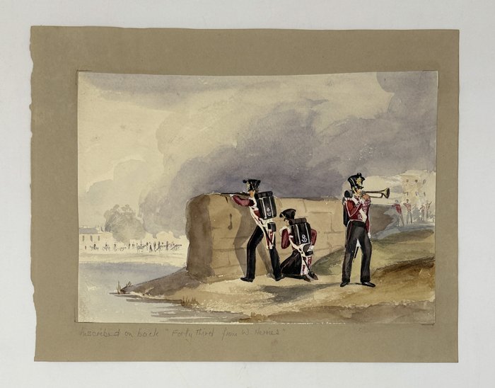 “Forty-third from […?].” Watercolour ca. 17x24 cm (6 ¾ x 9 ½ in). Depicts a scene with three British soldiers on a military exercise in Gibraltar.