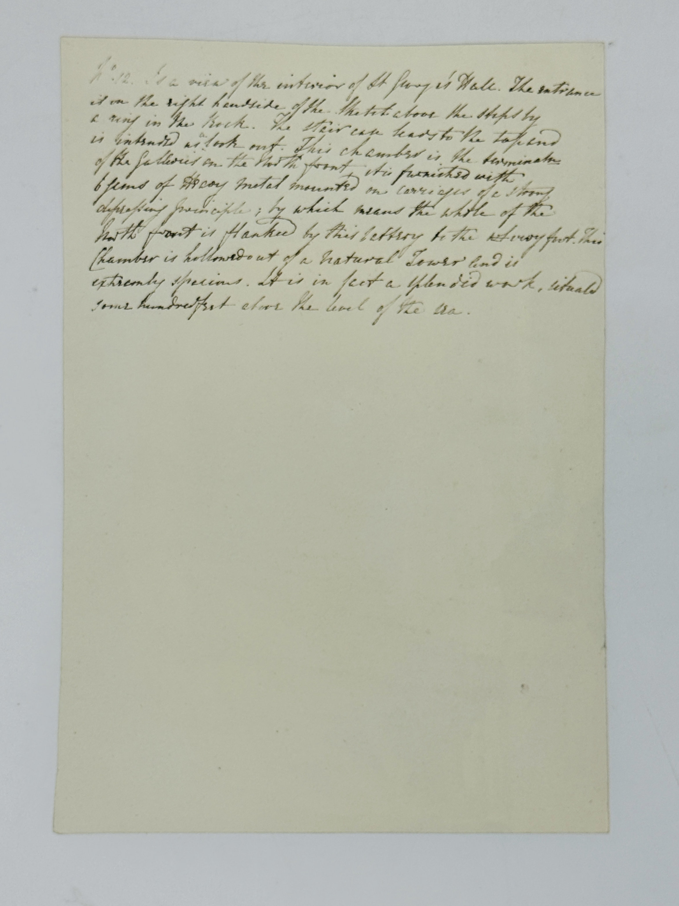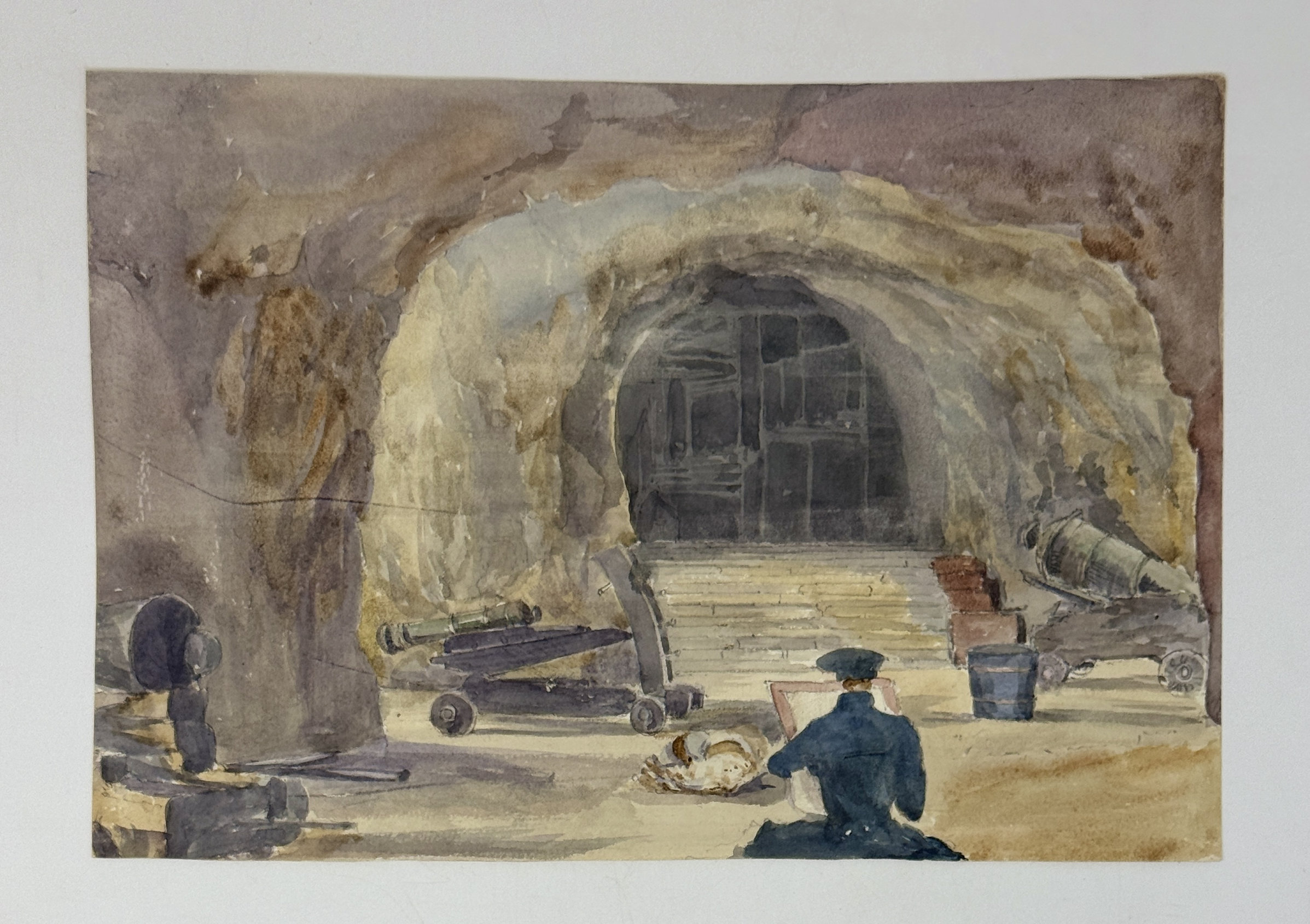 “No. 12. Is a view of the interior of St. George’s Hall. The entrance is on the right hand side of the sketch above the steps by a ring in the Rock. The staircase leads to the top and is intended as lookout. This chamber is the terminal of the galleries on the North front, it is furnished with 6 guns <…> mounted on carriages <…>; by which means the whole of the North front is flanked by this battery to the very foot. This chamber is hollowed out of a natural tower and is extremely spacious. It is in fact a splendid work, situated some hundred feet above the level of the sea.” Watercolour ca. 18,5x27 cm (7 ¼ x 10 ½ in). The artist is depicted making a sketch in the foreground.