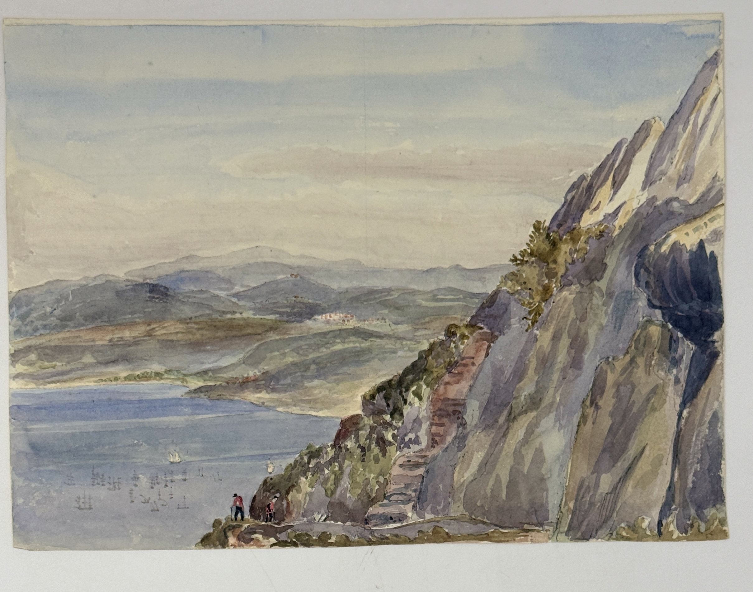 “No. 5 shews the bay as it approaches nearer to Gibraltar. San Rogue and Castellar may be seen in the distance, the latter situated at the summit of a conical hill. In the foreground two figures are seen ascending by the road up the Rock; but they appear sadly tired by their exertions.” Watercolour ca. 20x27,5 cm (8 x 10 ¾ in).