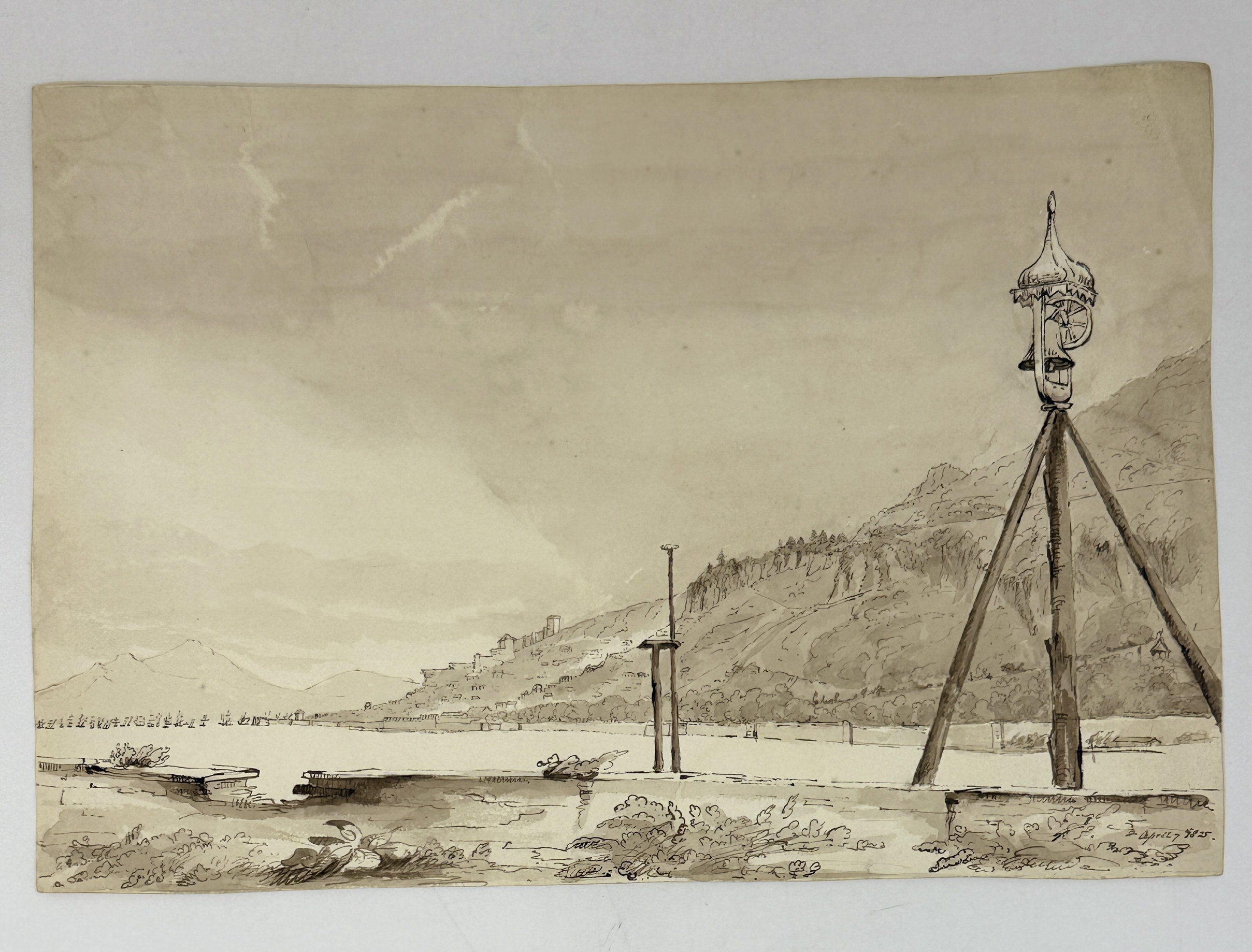 “A view from the New [South] Mole, Gibraltar.” Brown sepia watercolour ca. 22,5x33,5 cm (9 x 13 ¼ in). Dated “April 7, 1825” in the right lower corner. Shows Gibraltar Harbour from the South Mole looking north; the Moorish Castle and hills of Sierra Carbonera on the Spanish territory are seen in the background.