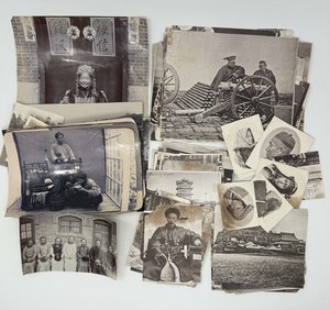 14 loose gelatin silver photos (including three period copy images): two two-part panoramas ca. 14x40 cm (5 ½ x 15 ¾ in), one large image ca. 20,5x27 cm (8 x 10 ½ in); the rest of the photos are from ca. 15x20 cm (5 ¾ x 7 ¾ in) to ca. 8,5x8,5 cm (3 ¼ x 3 ¼ in). Six photos with period pencil or ink captions on verso. With 87 loose phototypes, including 37 larger images from ca. 19,5x23,5 cm (7 ¾ x 9 ¼ in) to ca. 14,5x16 cm (5 ¾ x 6 ¼ in); the rest of the images are from ca. 12x14 cm (4 ¾ x 5 ½ in) to ca. 5,5x7,5 cm (2 ¼ x 3 in). Over 40 images with period manuscript ink or pencil captions or notes on recto or verso. Three gelatin silver photos with creases and minor tears on the margins, several photos with old mount residue on verso, a few photos mildly faded, but overall a good collection. Ca. 50 phototypes with scratches, creases or losses on the margins, or wormholes on the image. Overall a good extensive collection of interesting views.