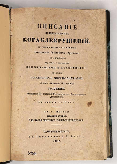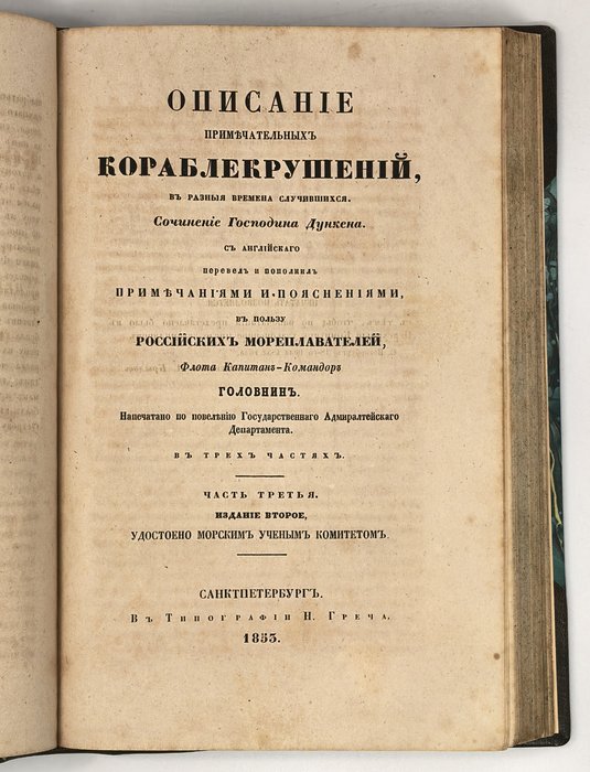 [With]: Golovnin, Vasily Mikhailovich (1776-1831) Opisanie Primechatelnykh Korablekrusheniy, v Raznye Vremena Preterpennykh Rossiyskimi Moreplavatelyami. Sobrany, Privedeny v Poryadok i Popolneny Primechaniyami i Poyasneniyami Flota Kapitan-Komandorom Golovninym. Chast’ 4, sluzhashchaya Prodolzheniyem k Opisaniyu Primechatelnykh Korablekrusheniy g. Dunkena. Napechatano po Poveleniyu Gosudarstvennogo Admiralteyskogo Departamenta [Description of the Most Interesting Shipwrecks Suffered at Various Times by Russian Navigators. Collected, Organized and Supplemented with Notes and Explanations by Fleet Captain-Commander Golovnin. Part 4, Serving as the Continuation to the Description of the Most Interesting Shipwrecks by Mr. Duncan. Published by the order of the State Admiralty Department]. Saint Petersburg: Typ. Of N. Grech, 1853.