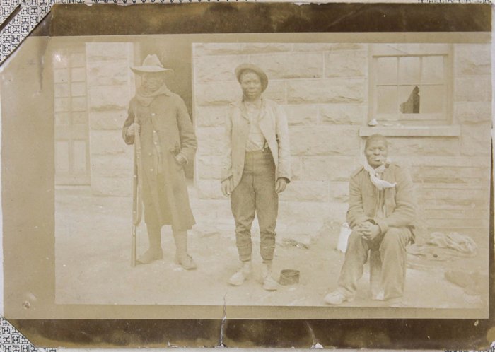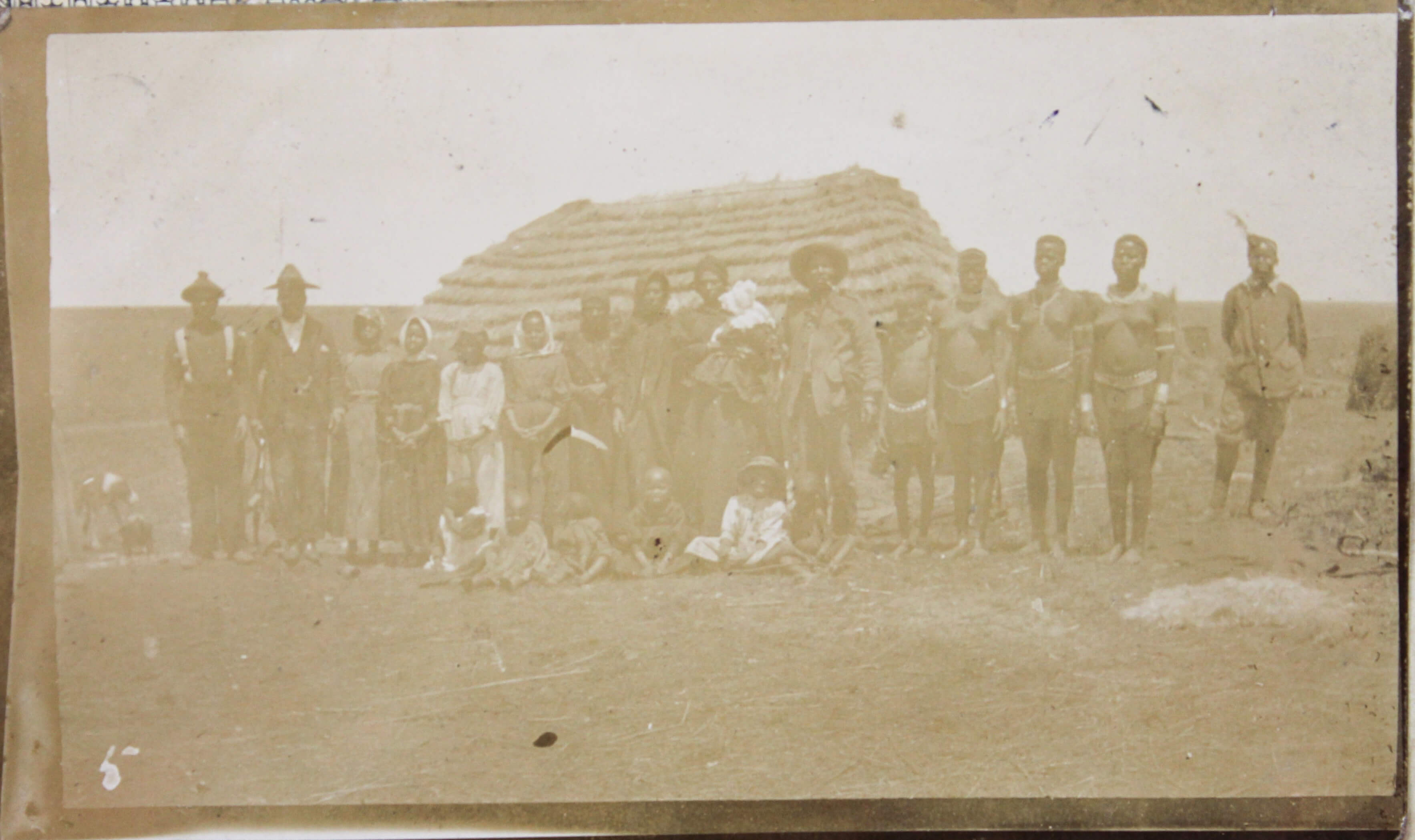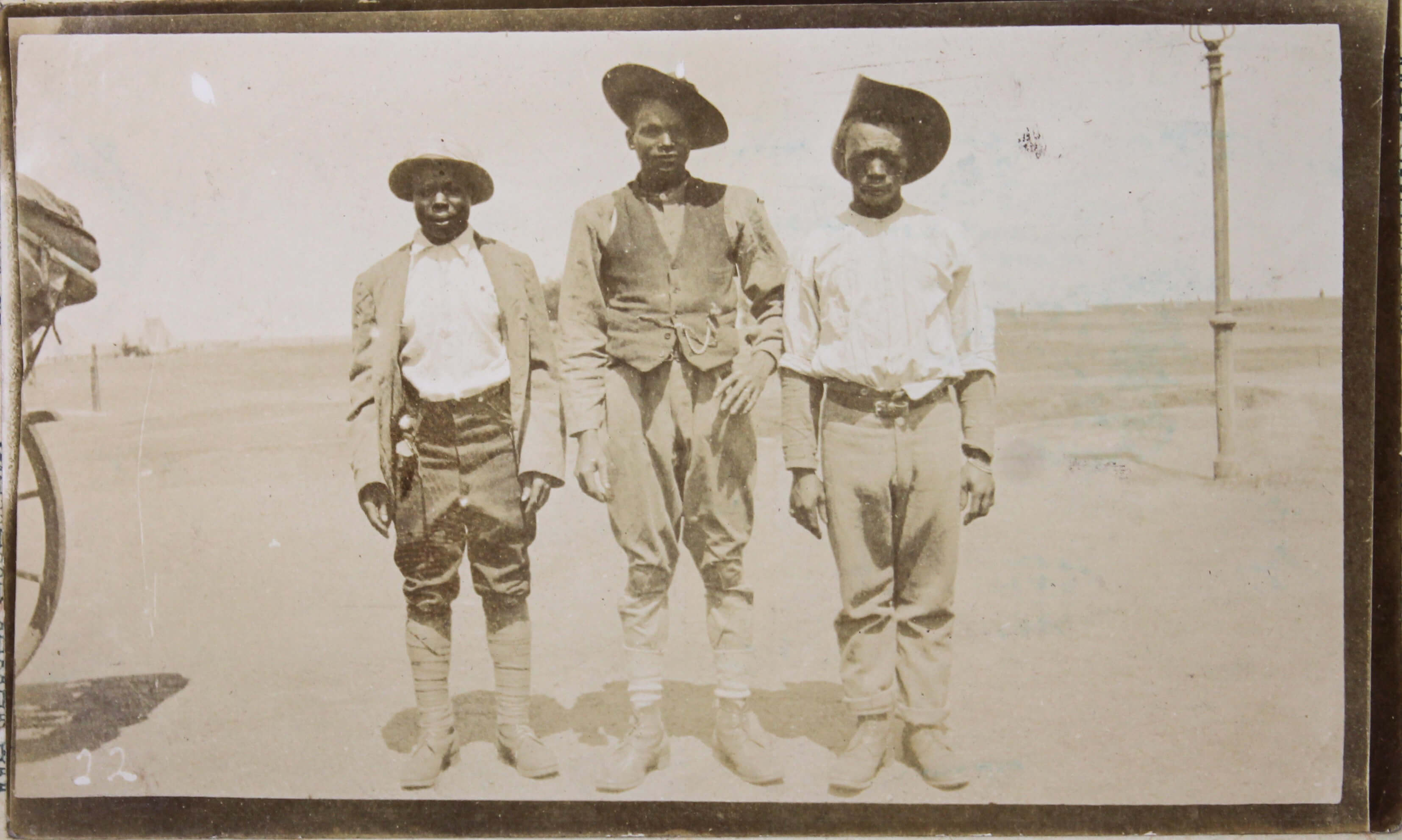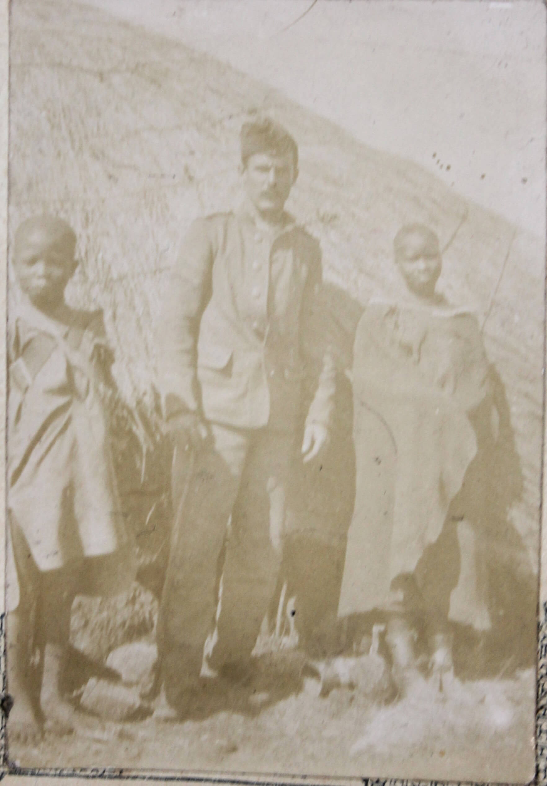 The rest of the photos mostly show individual and group portraits of local people (captioned as “kaffirs”), the compiler in various settings, and early views of landmarks in Pretoria (Lord Roberts’ Official Residence, President Kruger’s House, Jewish synagogue, general hospital, post office, reformed church), Johannesburg (train station, post office, government buildings, telephone tower), and nearby areas, including the Monument of the 58th Regiment on Majuba Hill and several burial grounds.