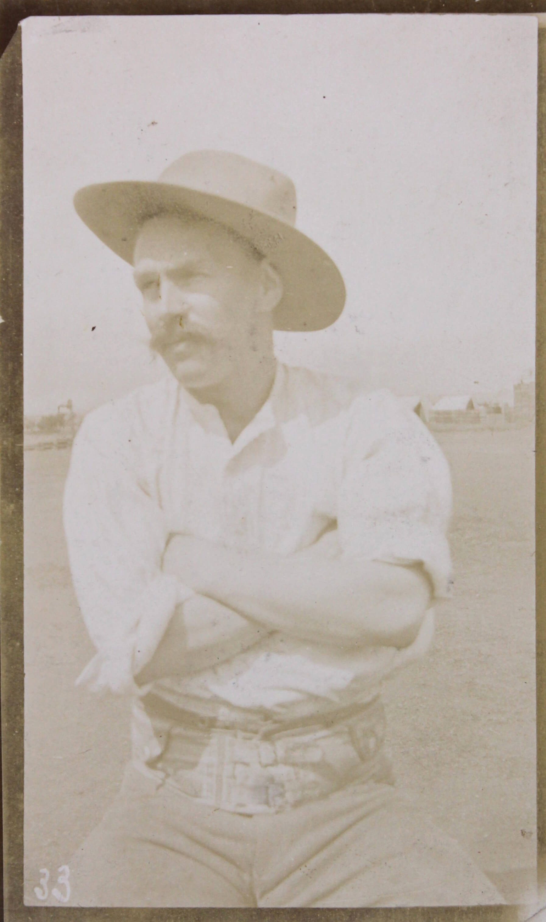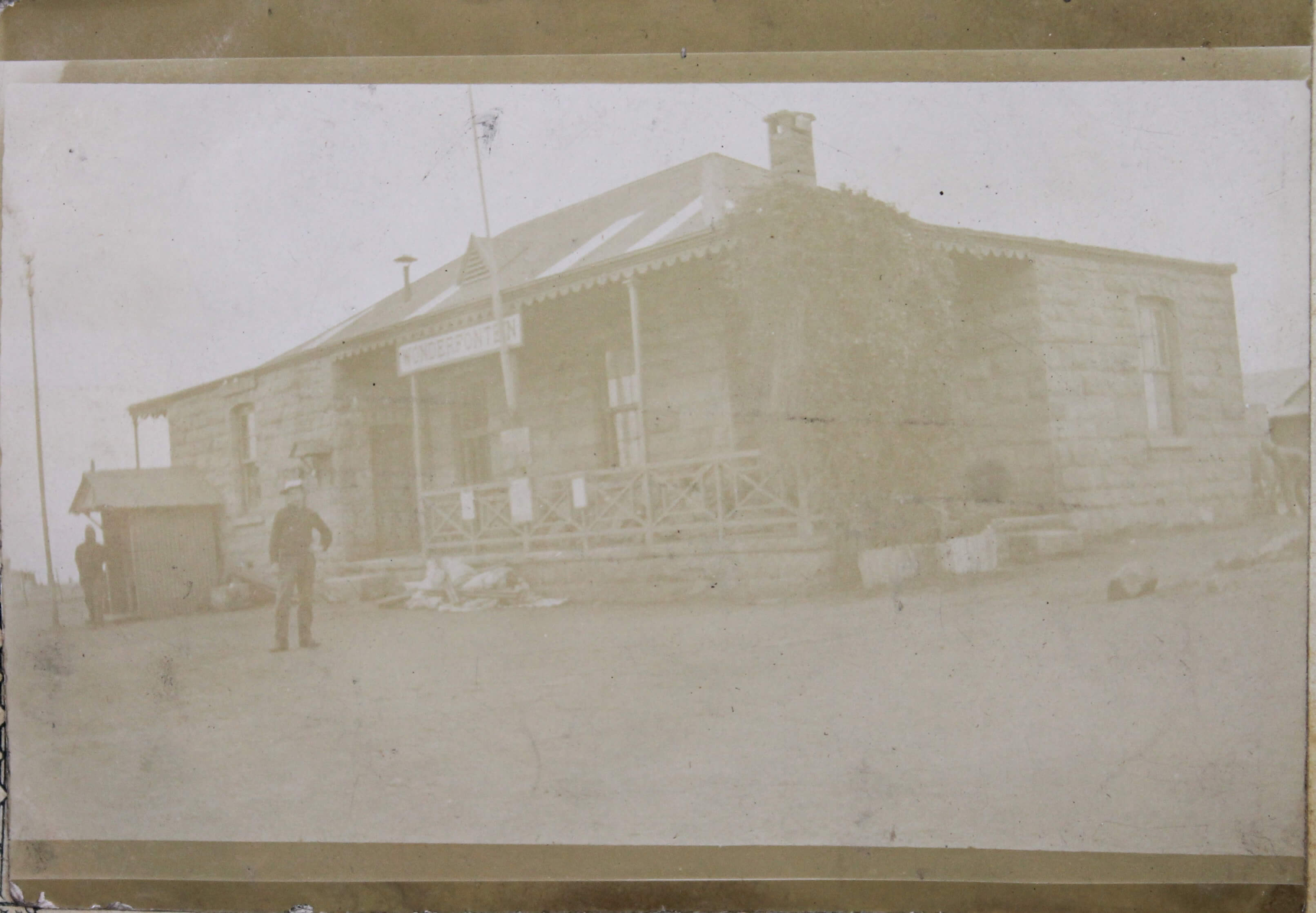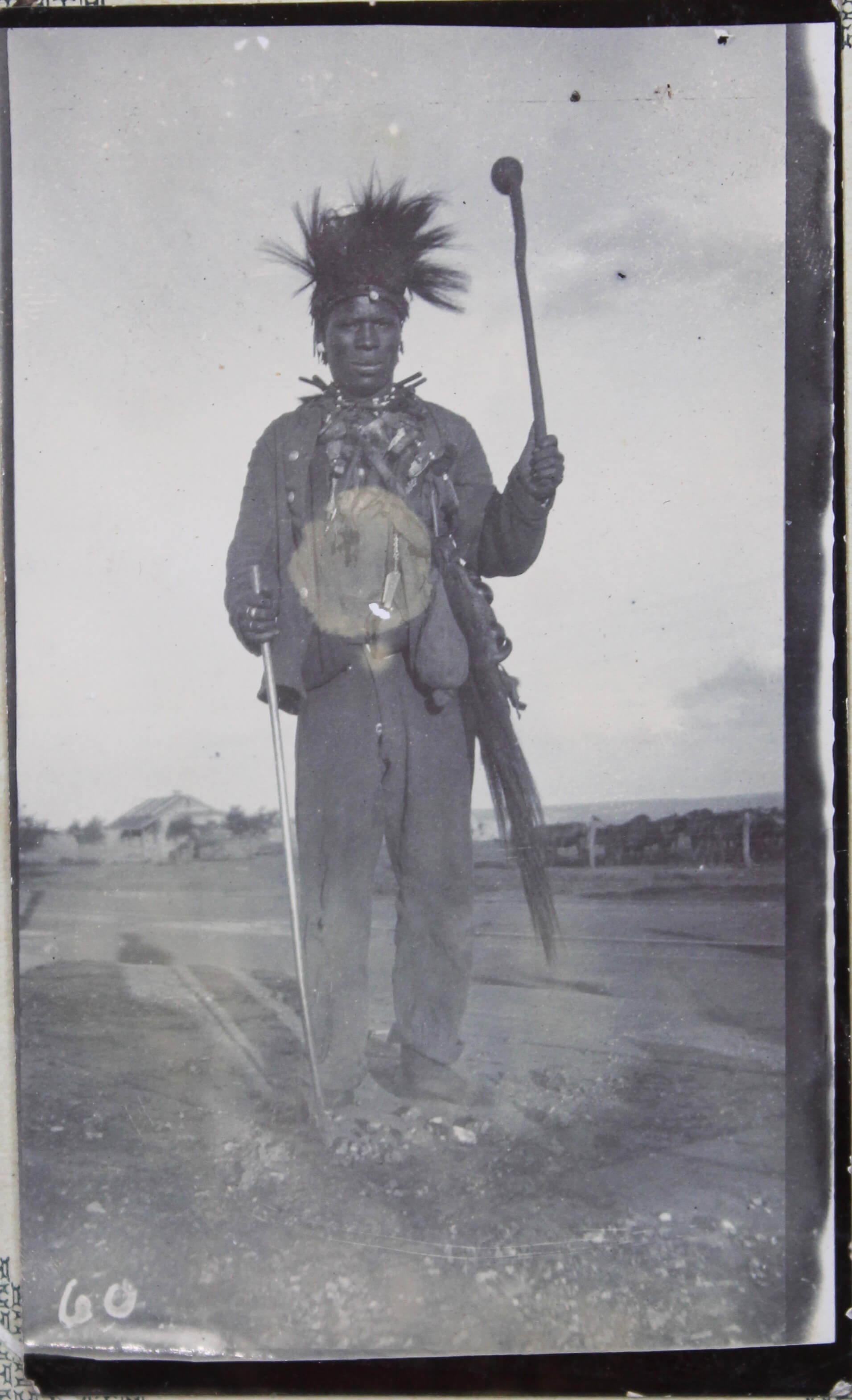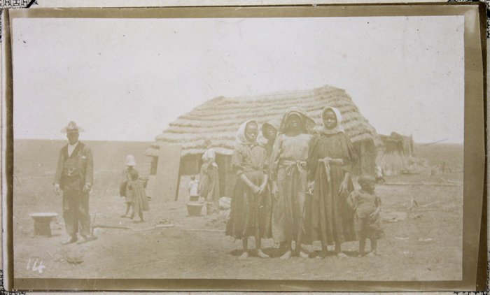 The rest of the photos mostly show individual and group portraits of local people (captioned as “kaffirs”), the compiler in various settings, and early views of landmarks in Pretoria (Lord Roberts’ Official Residence, President Kruger’s House, Jewish synagogue, general hospital, post office, reformed church), Johannesburg (train station, post office, government buildings, telephone tower), and nearby areas, including the Monument of the 58th Regiment on Majuba Hill and several burial grounds.