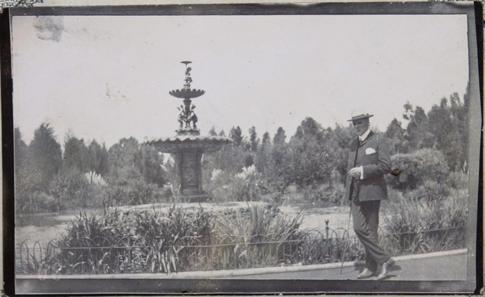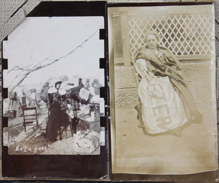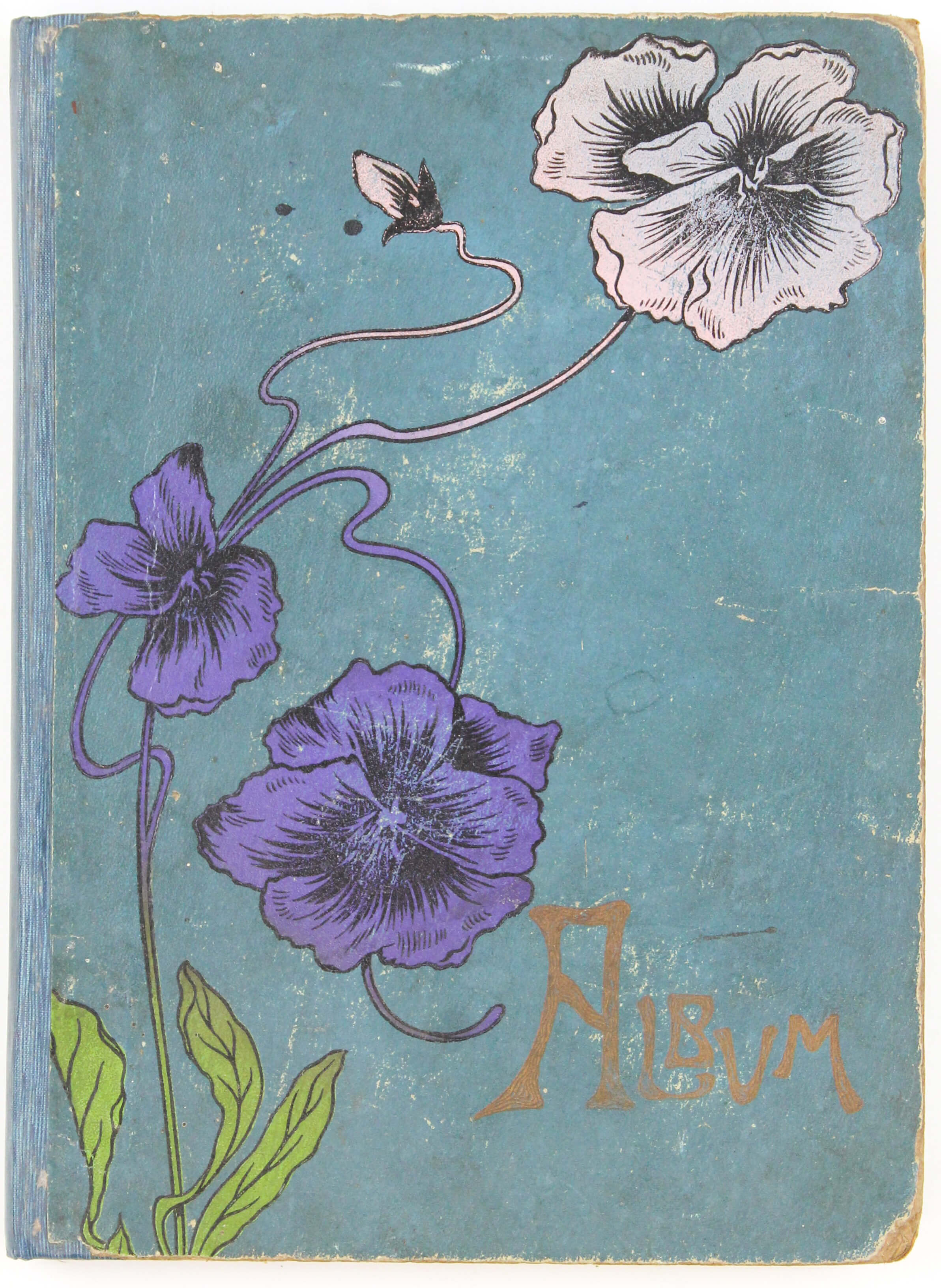 Quarto album (ca. 26,8x19,5 cm). 26 albumen leaves and one loosely inserted watermarked paper reading: “Donowan C. Wilson Photographer. Commercial Street, Hereford.” With 90 mounted original gelatin silver photographs from ca. 6,9x11,4 cm (2 ¾ x 4 ½ in) to ca. 5,2x8,2 cm (2 x3 ¼ in). Ca. 34 photos with period English captions in negatives or on the mounts. With ca. 36 mounted postcards ca. 8,9x13,5 cm (3 ½ x 5 ¼ in), most addressed on the rear, some with period captions on the front, several stamped. Period cardboard covers with blind-tooled ornaments and gilt-tooled generic title “Album” on the front board. Covers rubbed, stains on the rear board, pages with tears, one photo with a close tear, photos age-toned, but otherwise a very good album with strong, interesting photos.