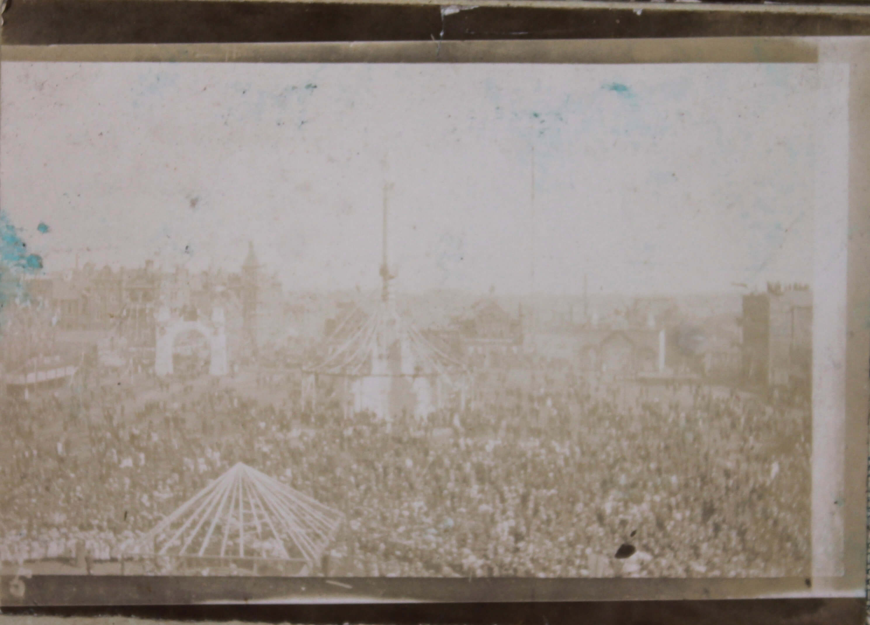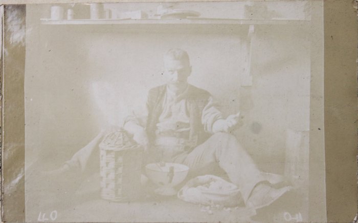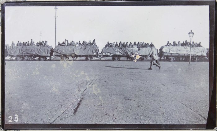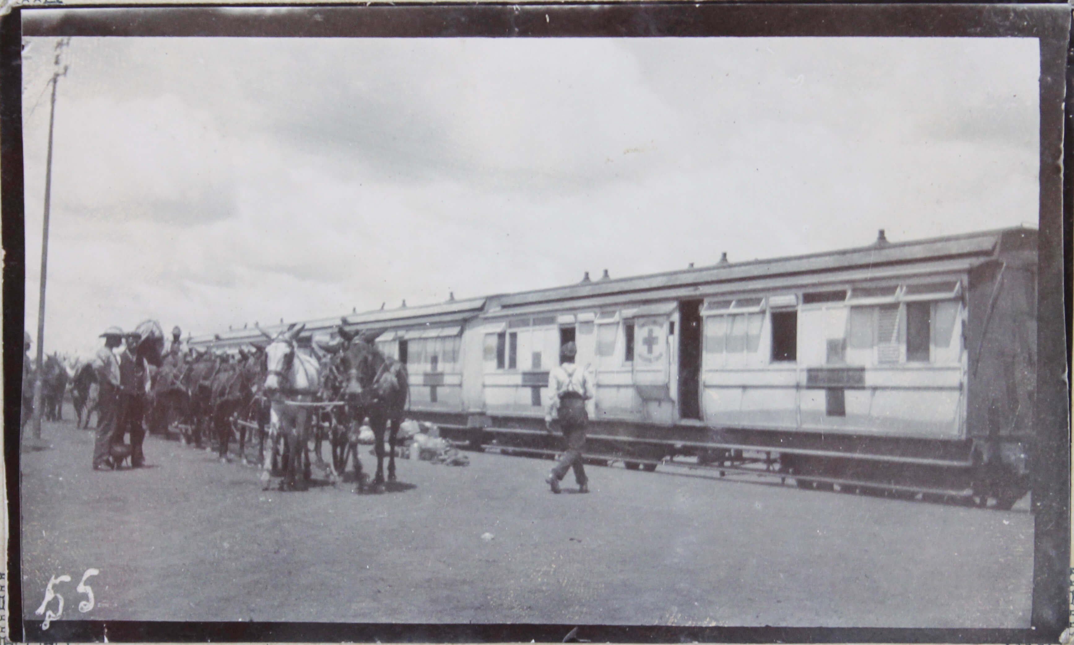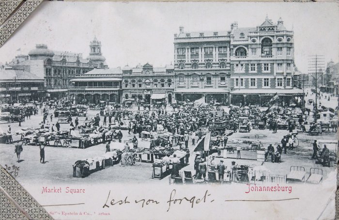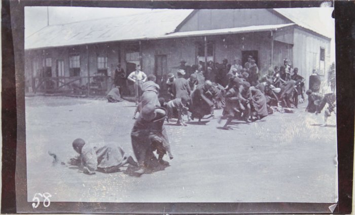 The album features eighty-eight rare original photos of the Transvaal taken shortly after the British occupation. About ten excellent photographs show military installations and activity, including artillery barracks in Pretoria, armed National Scouts departing from Wonderfontein, and the compiler pictured with his colleagues from the Telegraph Department. Especially interesting are candid scenes of wartime realities, showing “kaffirs scrambling bead at nature store,” “Kaffir prisoner who is to be executed for shooting a girl,” “Boer prisoners,” the Princess Christian Hospital Train transporting wounded soldiers, and crowds celebrating the coronation of King Edward VII in Johannesburg’s Market Square in 1902. Another important photograph shows open railway wagons, crowded with African laborers en route to Witwatersrand gold mines under the supervision of British soldiers (control of these mines was a key objective for the British, as securing the goldfields was central to their war effort and the economic administration of the Transvaal after the occupation).