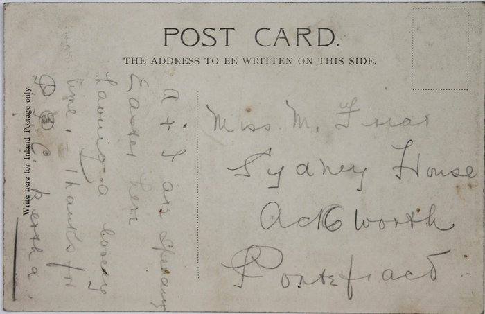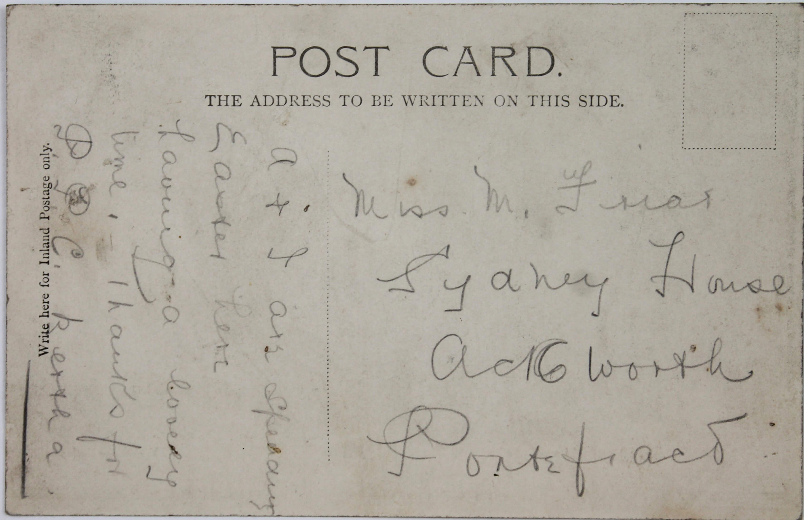 The album also includes approximately 35 black-and-white and color printed postcards, mostly addressed to “Mr. and Mrs. Raistrick” (most likely the compiler’s parents) in Featherstone, Pontefract, Yorkshire, dated between 1901 and 1906.