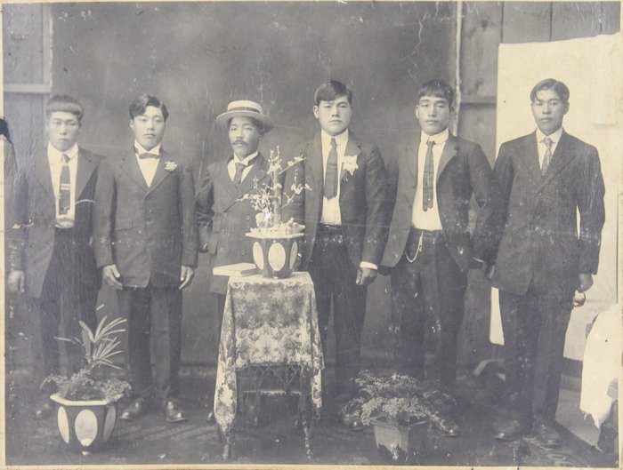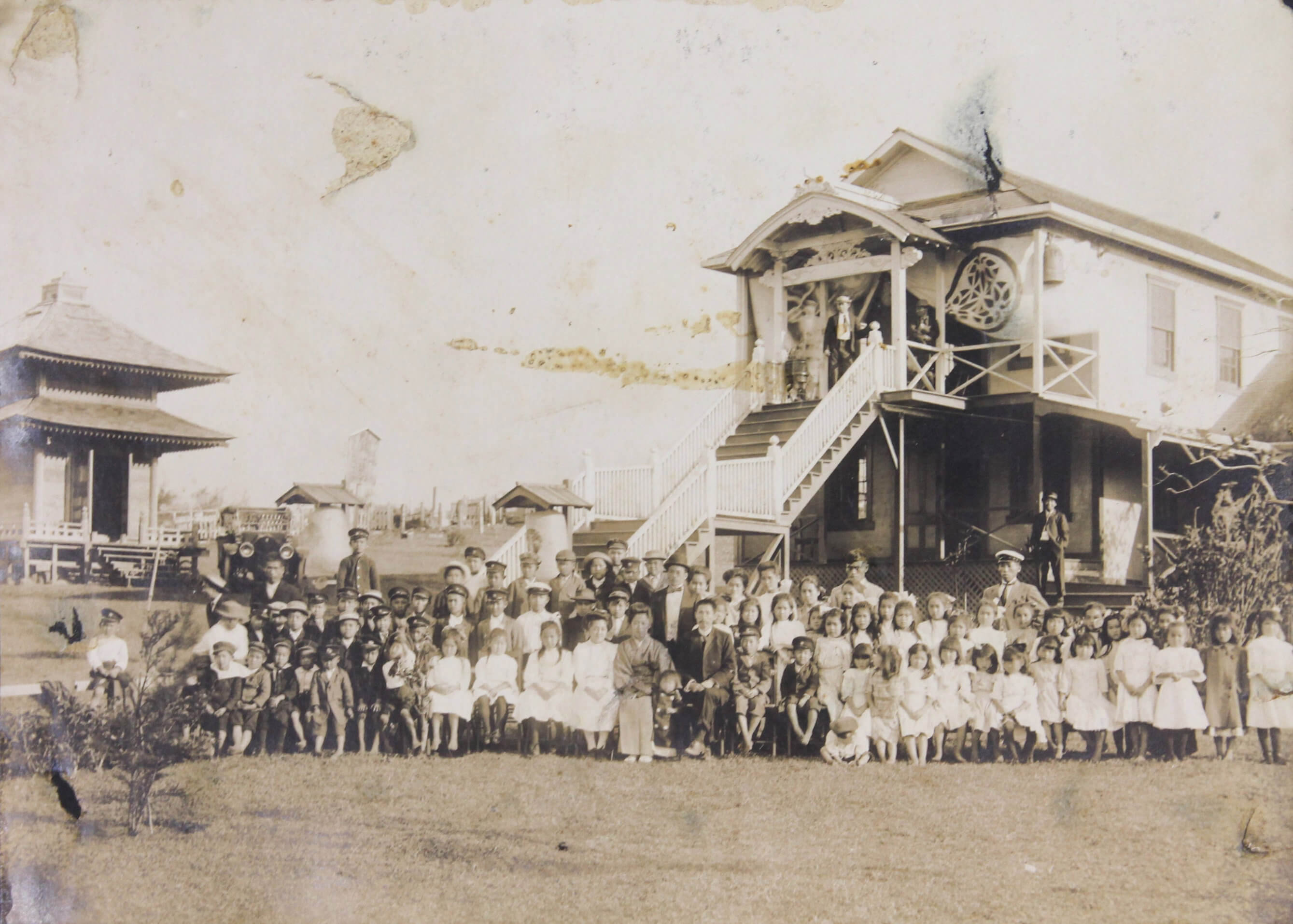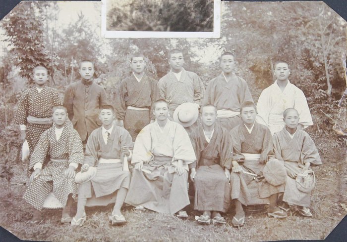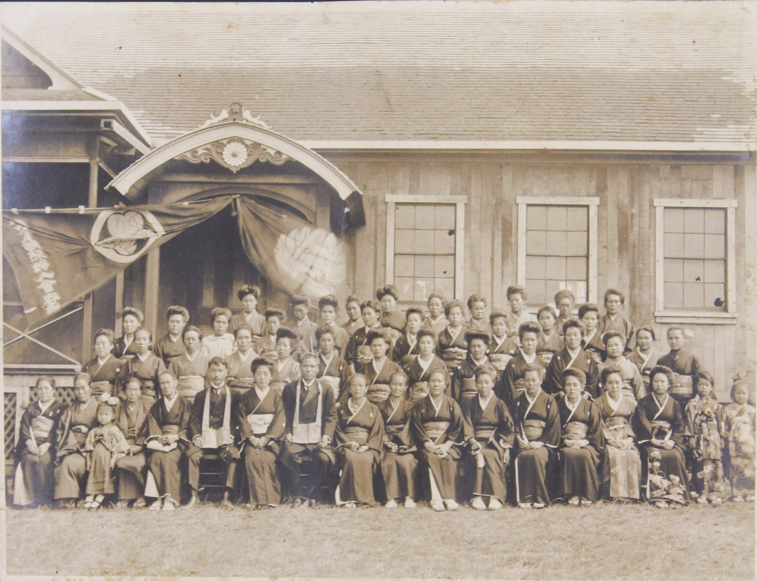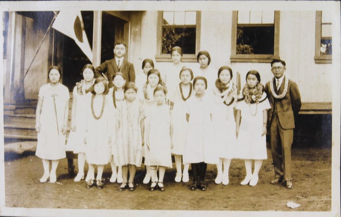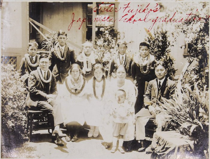 About thirteen large-size professional photographs portray Japanese school boys and girls, some in American school uniforms and others in kimonos, yukatas, suits, and military uniforms, gathered outside their schools. Many wear Hawaiian flower leis and pose beside American flags or Japanese signage. One interesting image bears a handwritten Japanese inscription on the mount, identifying the location as the East Kona Japanese School. It shows students posed outdoors with the school building and several traditional Japanese-style houses in the background. Another important group portrait shows what appears to be a local Japanese youth association, with its mostly female members posing beside the organization’s flag and building. The rest of the large-size prints are mostly studio portraits, produced in early Hawaiian studios and showing the compiler’s relatives in various settings.