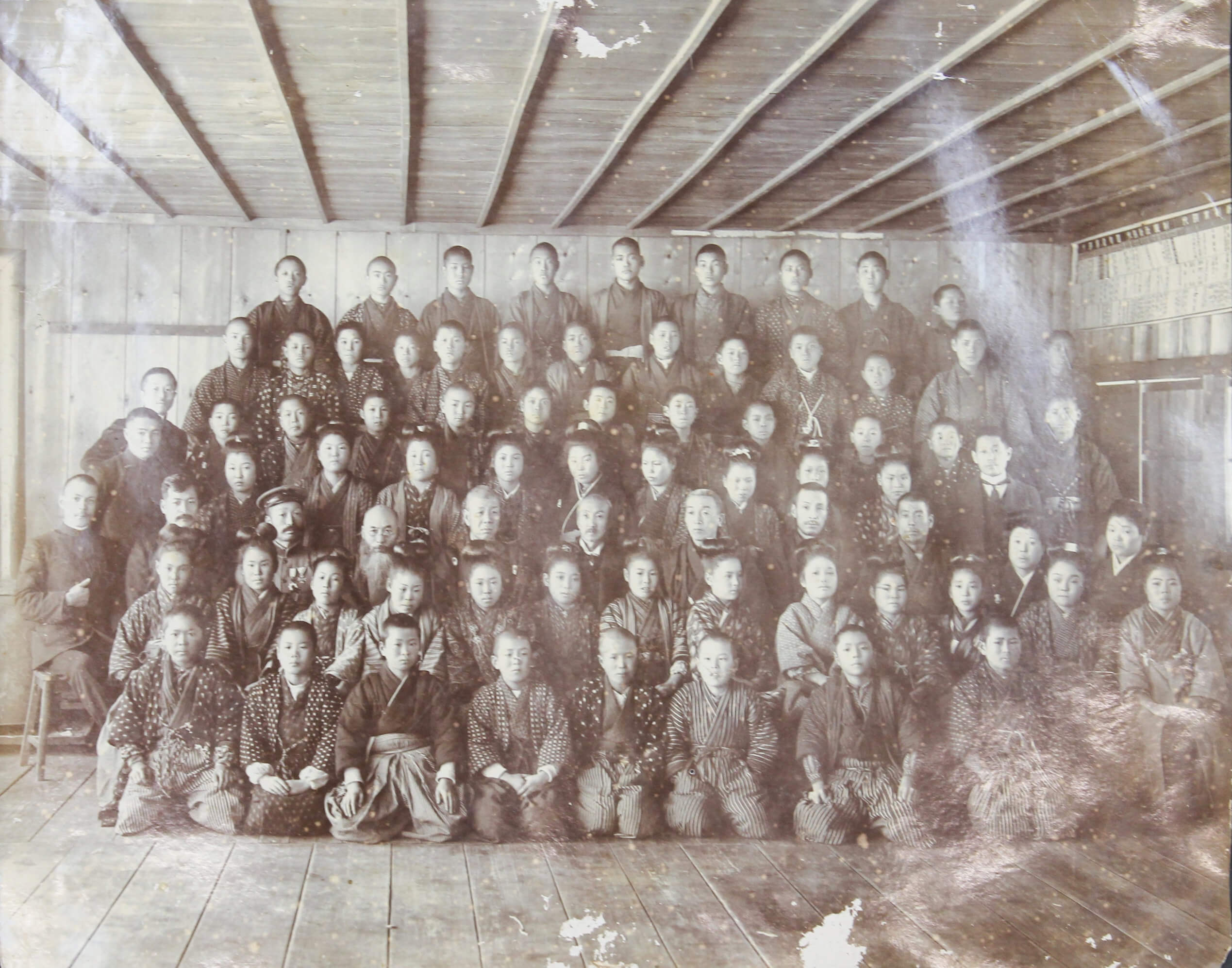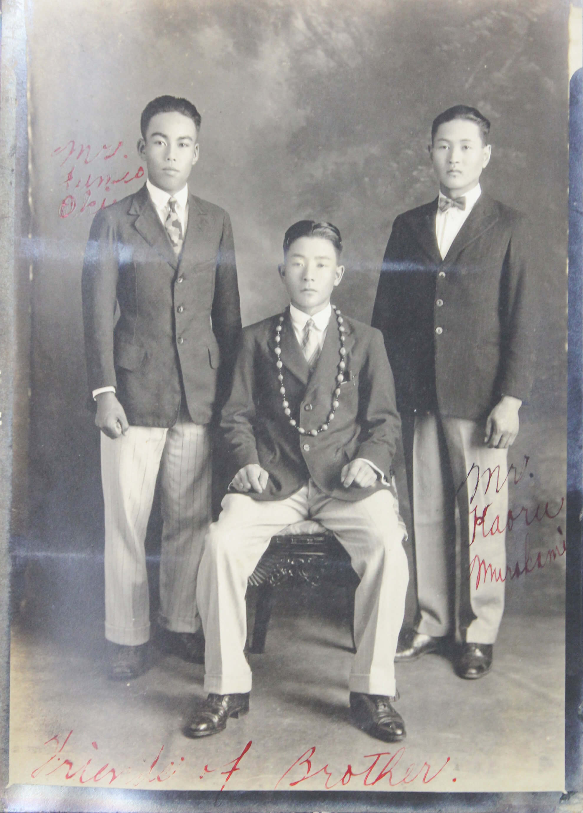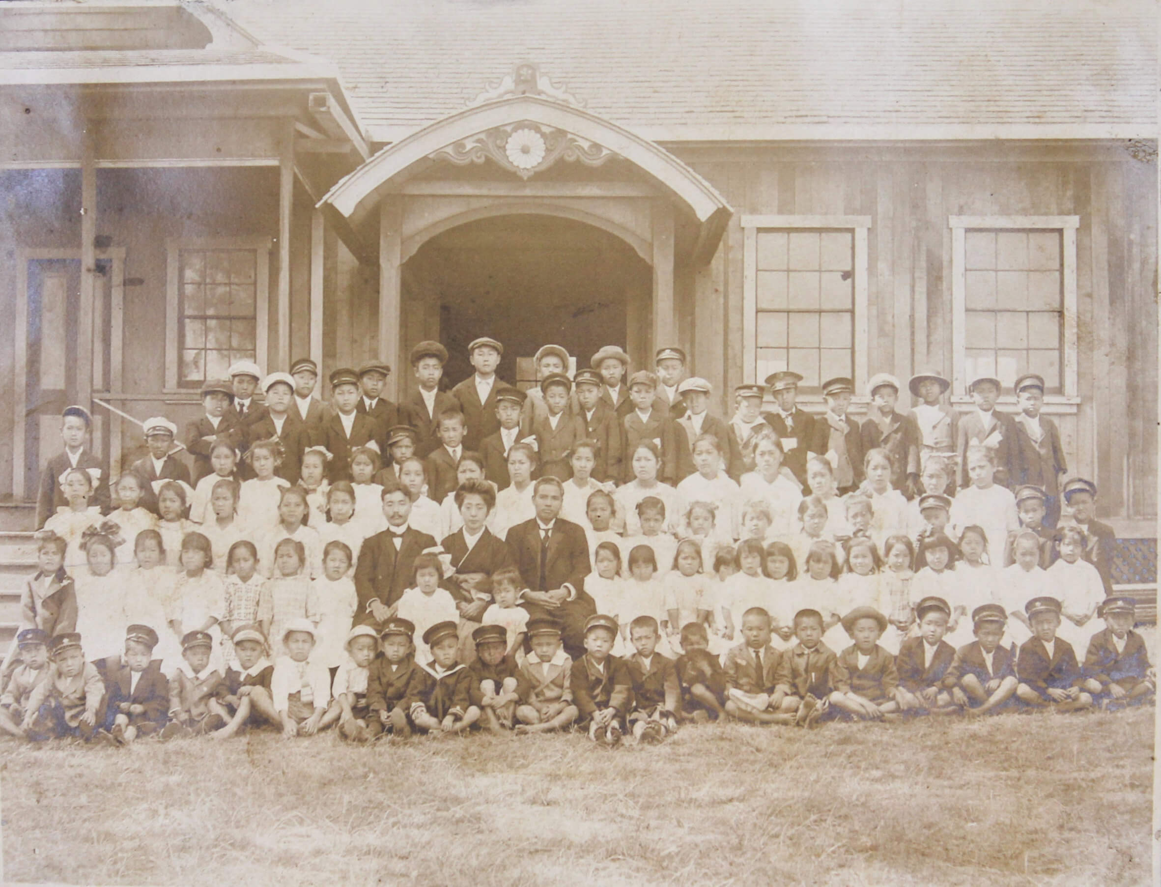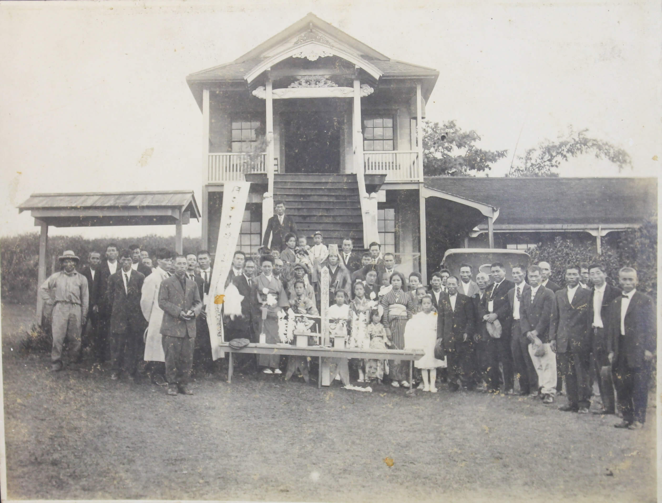 About thirteen large-size professional photographs portray Japanese school boys and girls, some in American school uniforms and others in kimonos, yukatas, suits, and military uniforms, gathered outside their schools. Many wear Hawaiian flower leis and pose beside American flags or Japanese signage. One interesting image bears a handwritten Japanese inscription on the mount, identifying the location as the East Kona Japanese School. It shows students posed outdoors with the school building and several traditional Japanese-style houses in the background. Another important group portrait shows what appears to be a local Japanese youth association, with its mostly female members posing beside the organization’s flag and building. The rest of the large-size prints are mostly studio portraits, produced in early Hawaiian studios and showing the compiler’s relatives in various settings.