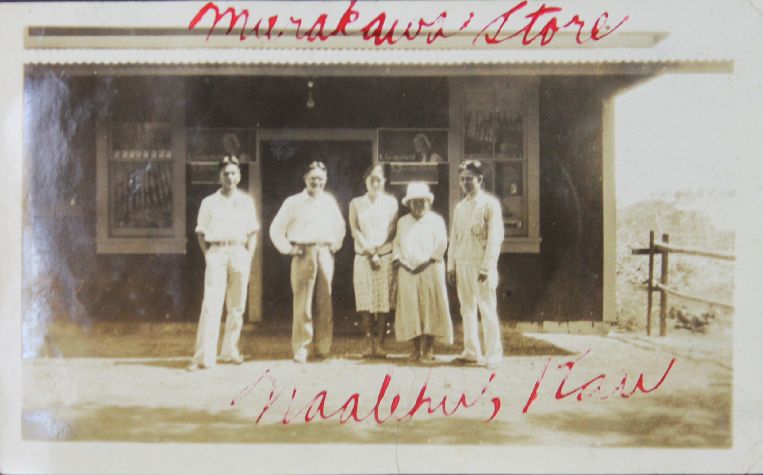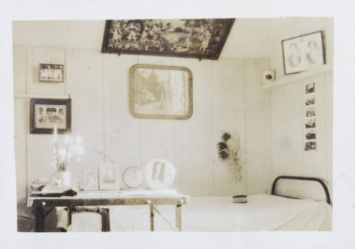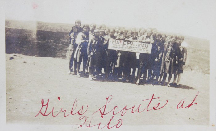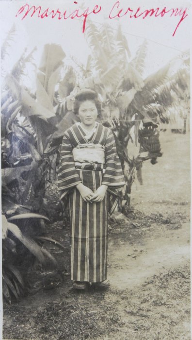 Over thirty excellent photographs were apparently taken around Hawaii and depict “girls’ scouts at Hilo,” the famous Japanese “Marakawa Store” in Naalehu, “our gym,” the interior of the compiler’s house, and a “Hawi camp.” The latter was likely housing for sugar-plantation workers and may have belonged to one of the compiler’s relatives. Especially interesting are two candid urban scenes showing Japanese youths standing with American friends and smiling at the camera, along with an image of the compiler dressed for a traditional Japanese marriage ceremony. There is also an intriguing photograph of a Japanese boys’ musical band, capturing the members dressed in matching military-style uniforms and holding instruments (accordions, snare drums, bass drums, etc.).