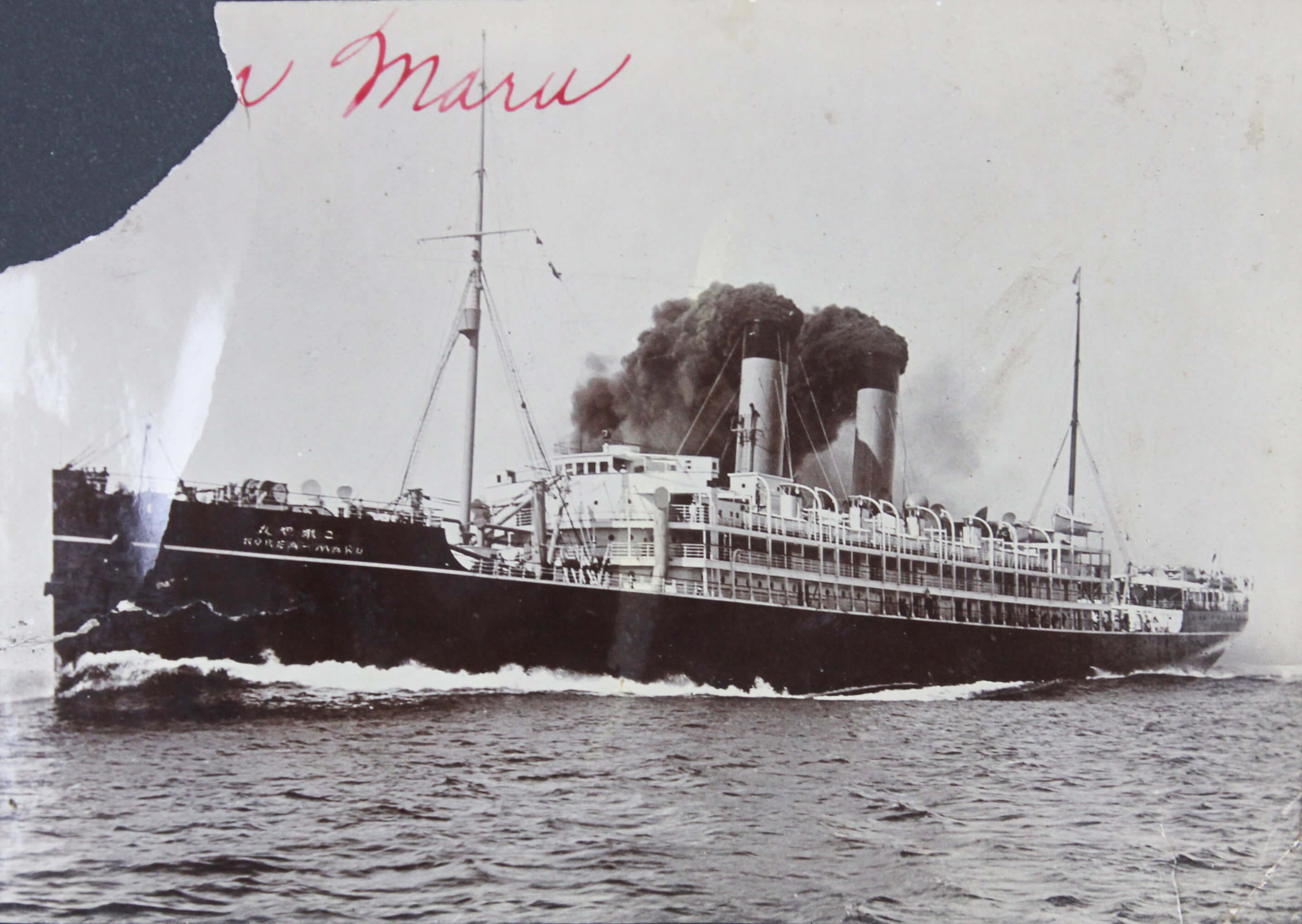 The collection includes 108 original gelatin-silver photographs and printed postcards, with one of the earliest photos showing the Japanese liner SS Korea Maru. The SS was a major trans-Pacific passenger liner of the 1920s, widely used on routes connecting Japan and the U.S. mainland. The photo was likely taken on the San Francisco waterfront when the compiler and her family were meeting a relative from Japan.