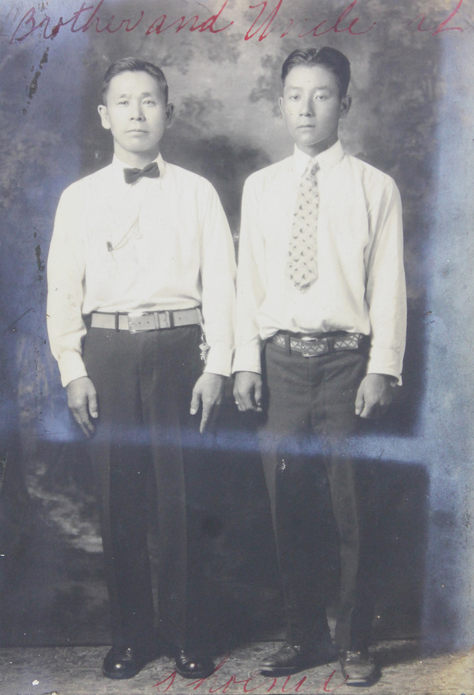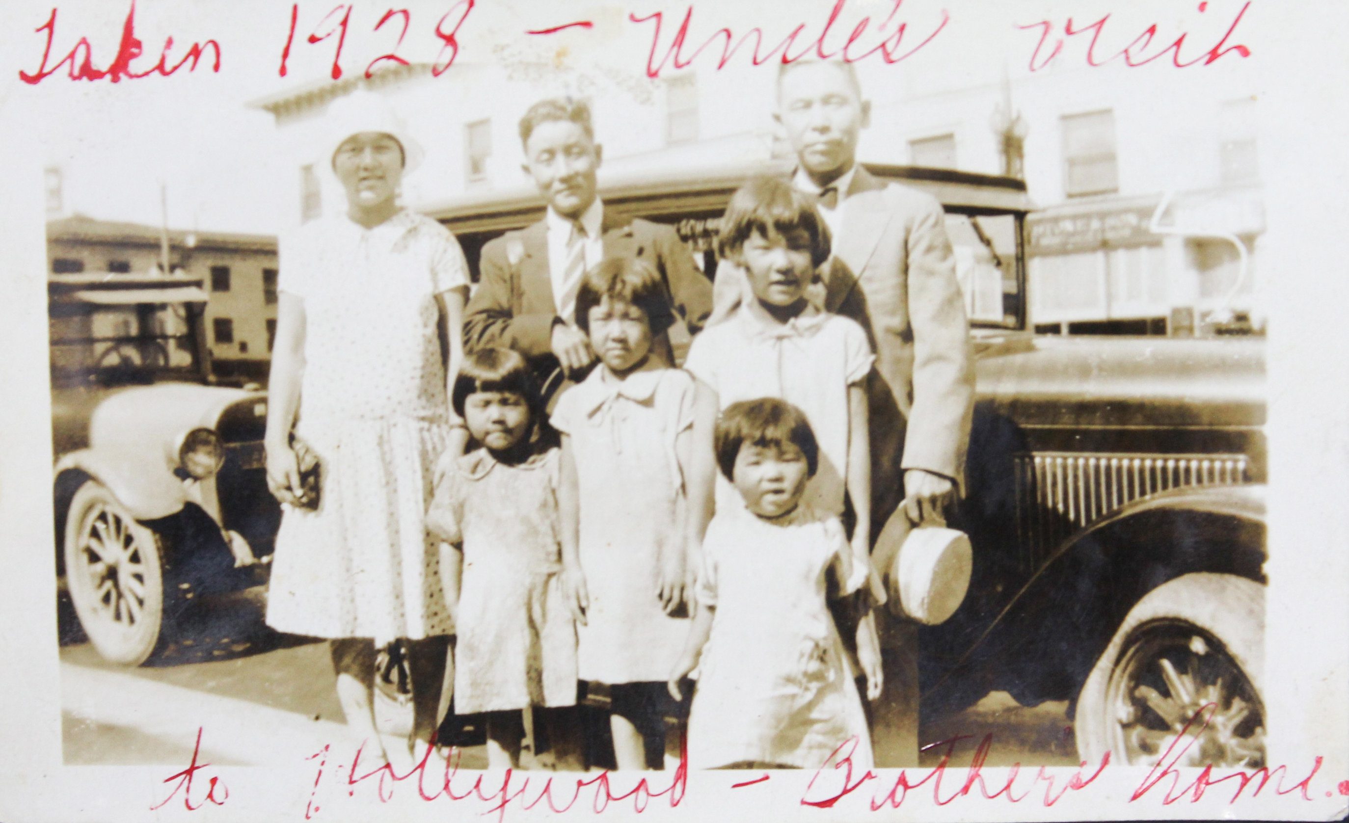 Many other photographs show the compiler’s extended family (brothers, sisters, uncles, aunts, and cousins) posing by cars (with clearly visible license plates), in nature, in studios, etc. Among the identified relatives are her aunt Senoske Ujiie and her husband, Yayoii Ujiie, who first arrived in San Francisco in 1918 and again from Yokohama in 1927 before settling in Arizona. According to the Irei Monument Project, Yayoii was later incarcerated at the Poston internment camp in Parker, Arizona during WWII. The album includes images of the Ujiie family visiting the compiler’s brother in Hollywood and posing both in studio portraits and outdoor scenes in Phoenix.