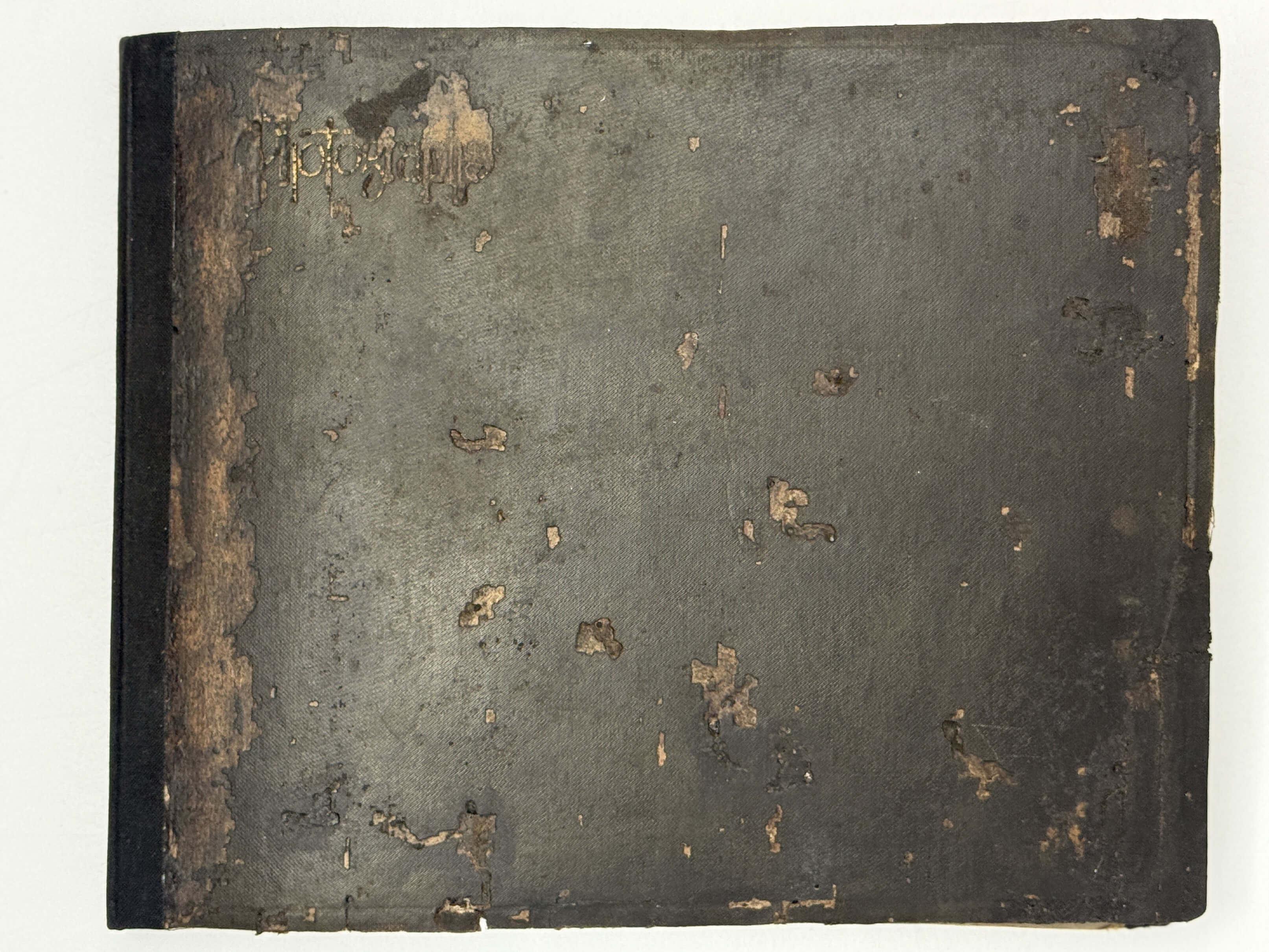 Oblong Quarto album (ca. 20,6x25,5 cm). 26 paper album leaves (three blanks). With 92 mounted original gelatin silver photographs from ca. 19,6x24,6 cm (7 ¾ x 9 ¾ in) to ca. 4,4x6,7 cm (1 ¾ x 2 ½ in). About 41 photos with period English ink captions in negatives; at least four photos with period Japanese captions on the mounts or in negatives; about photos dated.; with 16 Japanese printed postcards, each ca. 9,1x14,1 cm (3 ½ x 5 ½ in). Period dark brown cloth binding with the gilt-tooled generic title “Photographs” on the front cover. Professional restoration of the spine and the album leaves. Binding rubbed, four pages detached and with tears, three photos with the loss of fragments, mild silvering, but otherwise a very good album with strong, interesting photos.