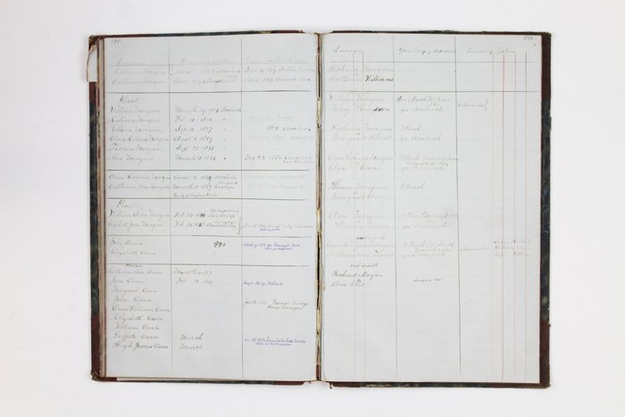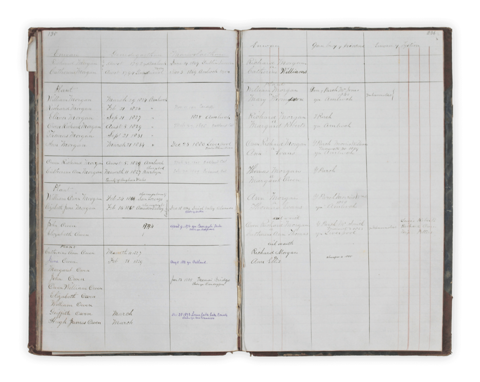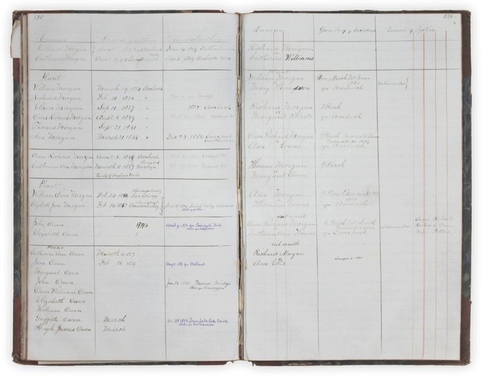 The final portion consists of a formal Family Register. This section provides a chronological record of the Morgan lineages, documenting births, locations, and deaths. Owen meticulously traces his ancestry back to his grandparents in Amlwch and Llandeiniol, extending the genealogy to include his wife’s family (Owen) and multiple generations of descendants.