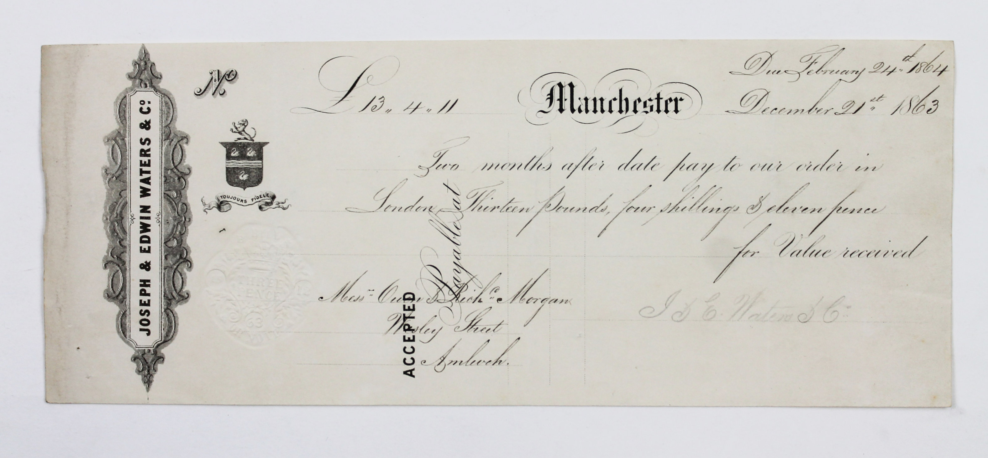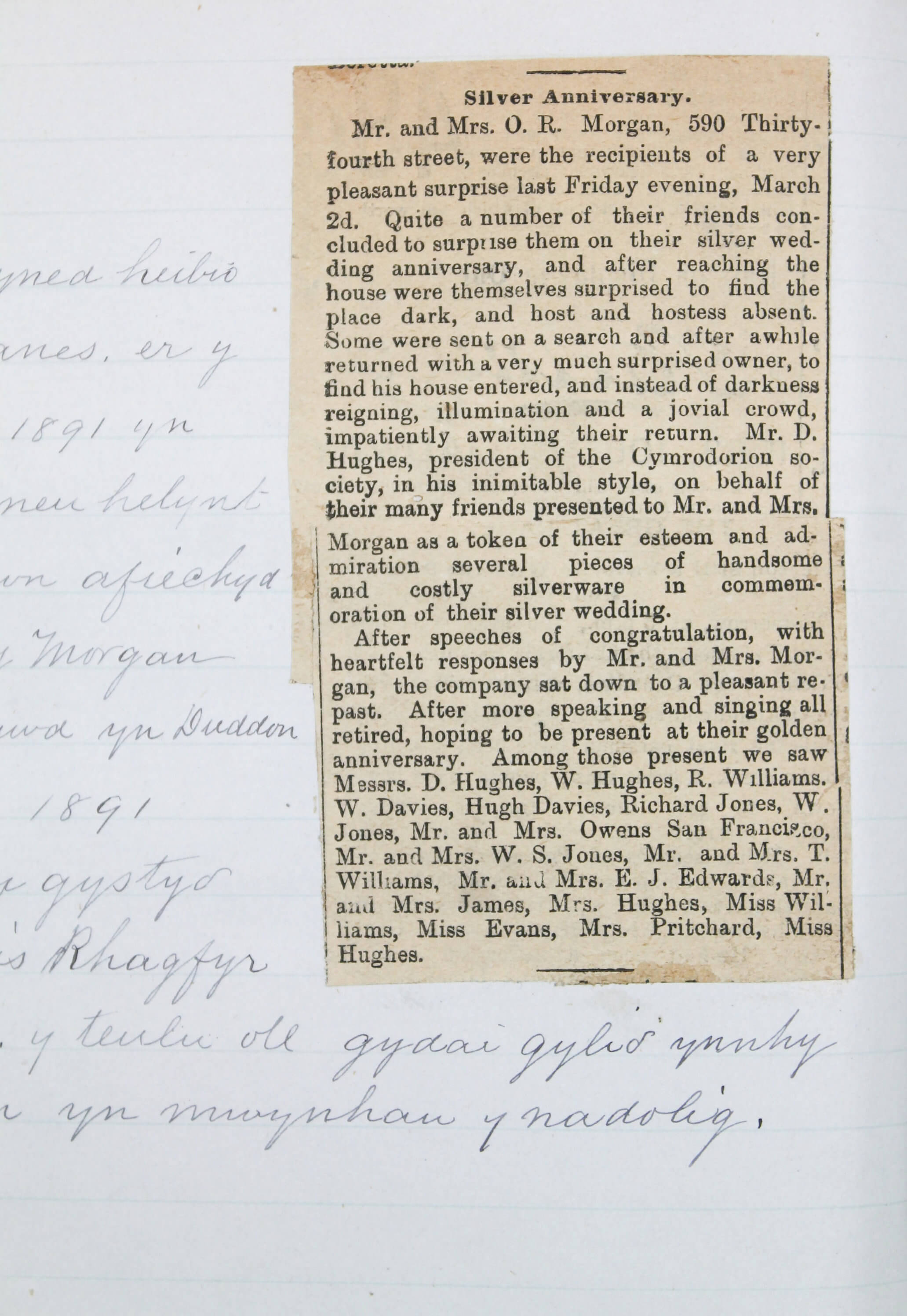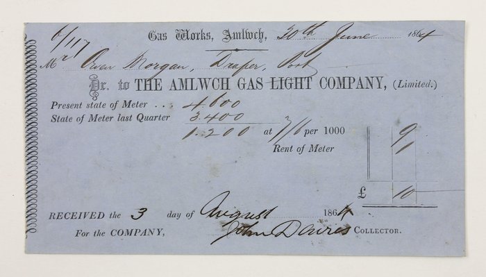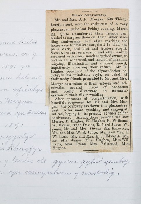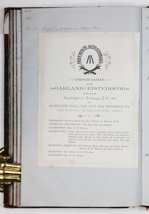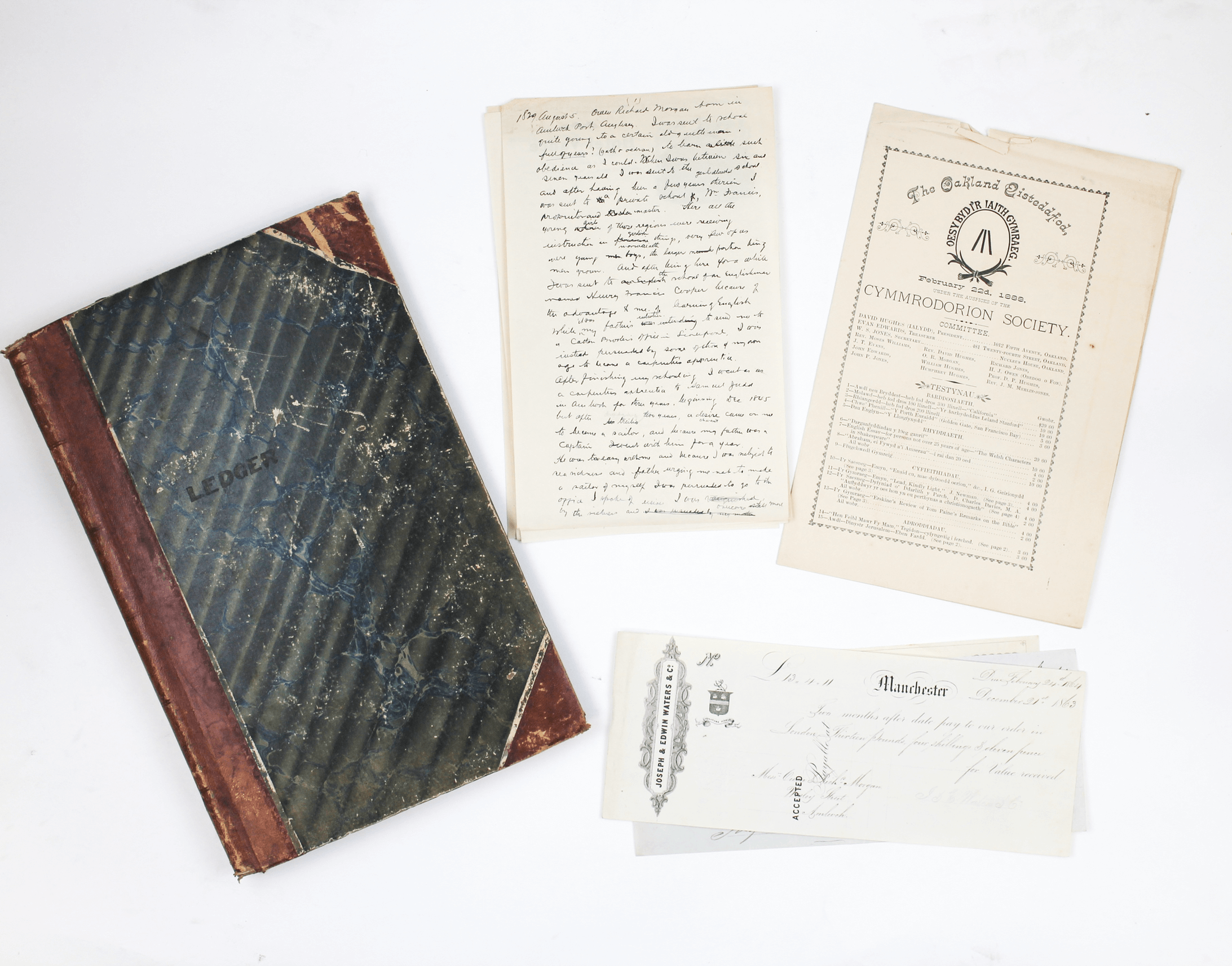 The archive is supplemented by several pieces of period printed ephemera, including five printed receipts from the 1860s and 1873, addressed to or issued by Morgans & Evans or Owen Richard Morgan. These receipts mostly feature the official letterheads of early Welsh and Manchester businesses, including the Amlwch Gas Light Company and Joseph & Edwin Waters & Co. of Manchester; the original programs for the Oakland Eisteddfod of 1887 and February 22, 1888 (former mounted in the journal); and two clippings from period English-language newspaper (one mounted in the journal).