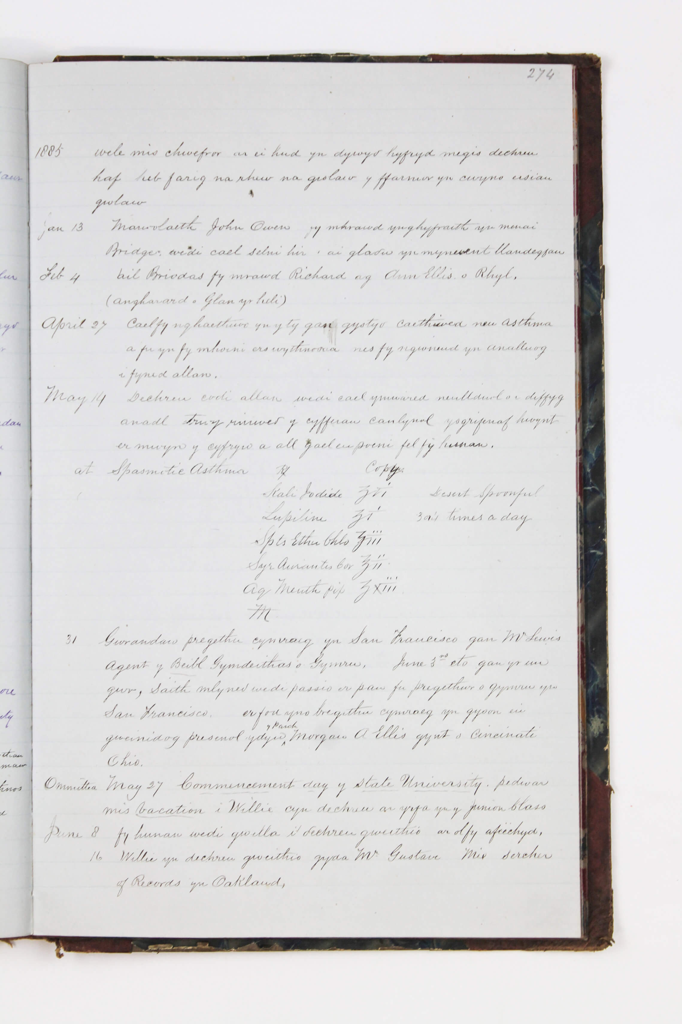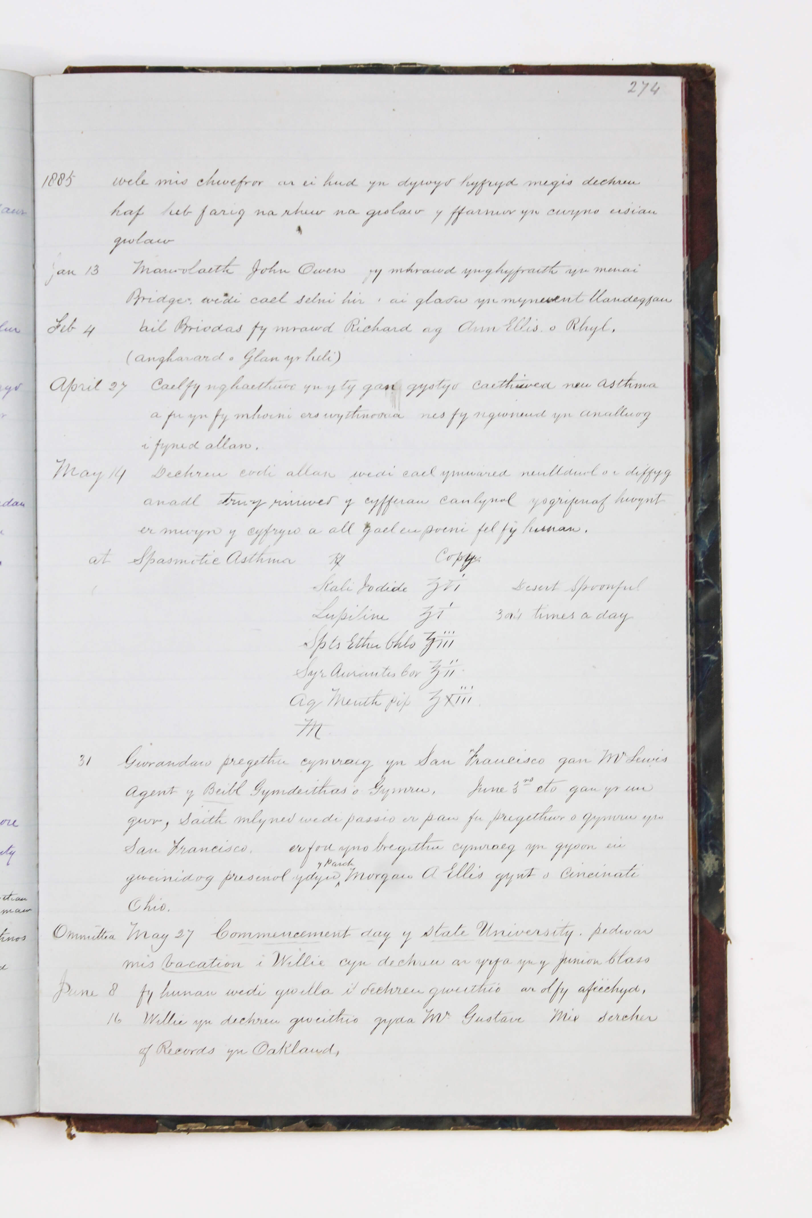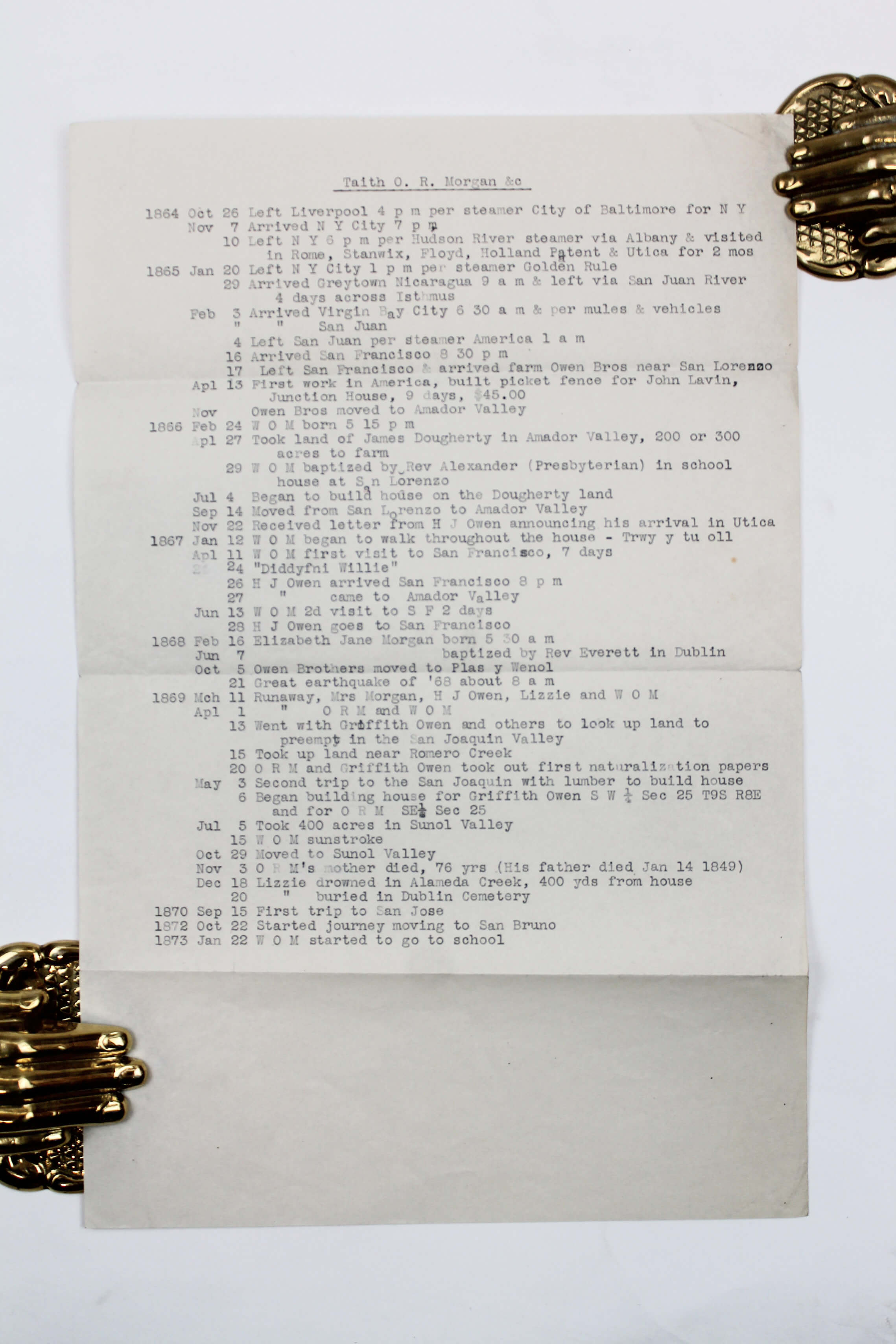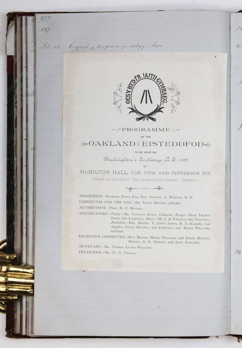 The most extensive part of the journal (over twenty-five pages) continues Owen’s autobiography with a detailed timeline of his life in America from 1864 to 1888. It opens with his arrival in New York aboard the SS “City of Baltimore” and his first employment as a fencer at Junction House. The narrative follows Owen’s personal and professional life alongside major historical events, including the assassination of President Garfield and the Great San Francisco Earthquake of 1868 (which he describes as rocking his house "like a ship in a storm.") Especially interesting are Owen’s descriptions of the California Welsh diaspora. He documents the establishment of the Oakland Cymmrodorion Society in 1886 and preparations for the 1887 Oakland Eisteddfod at Hamilton Hall, with detailed accounts of competitions (singing, essays, poetry, etc.) held against the San Francisco society, menus for intermissions, and awarded prizes. Owen also notes lesser-known cultural practices, including Welsh “basket parties” and the custom of female members hiring rooms at the Masonic Temple to receive callers. The timeline names numerous early Welsh settlers in California, including Thomas Rowland, Griffith Owen, Aaron Williams, Willie Morgan, Richard Jones, David Hughes, and Thomas Williams. This part of the journal is supplemented by a handwritten continuation of the timeline for 1889 (in Welsh) and a typewritten English translation of Owen Morgan’s American timeline for the years 1864–1873.