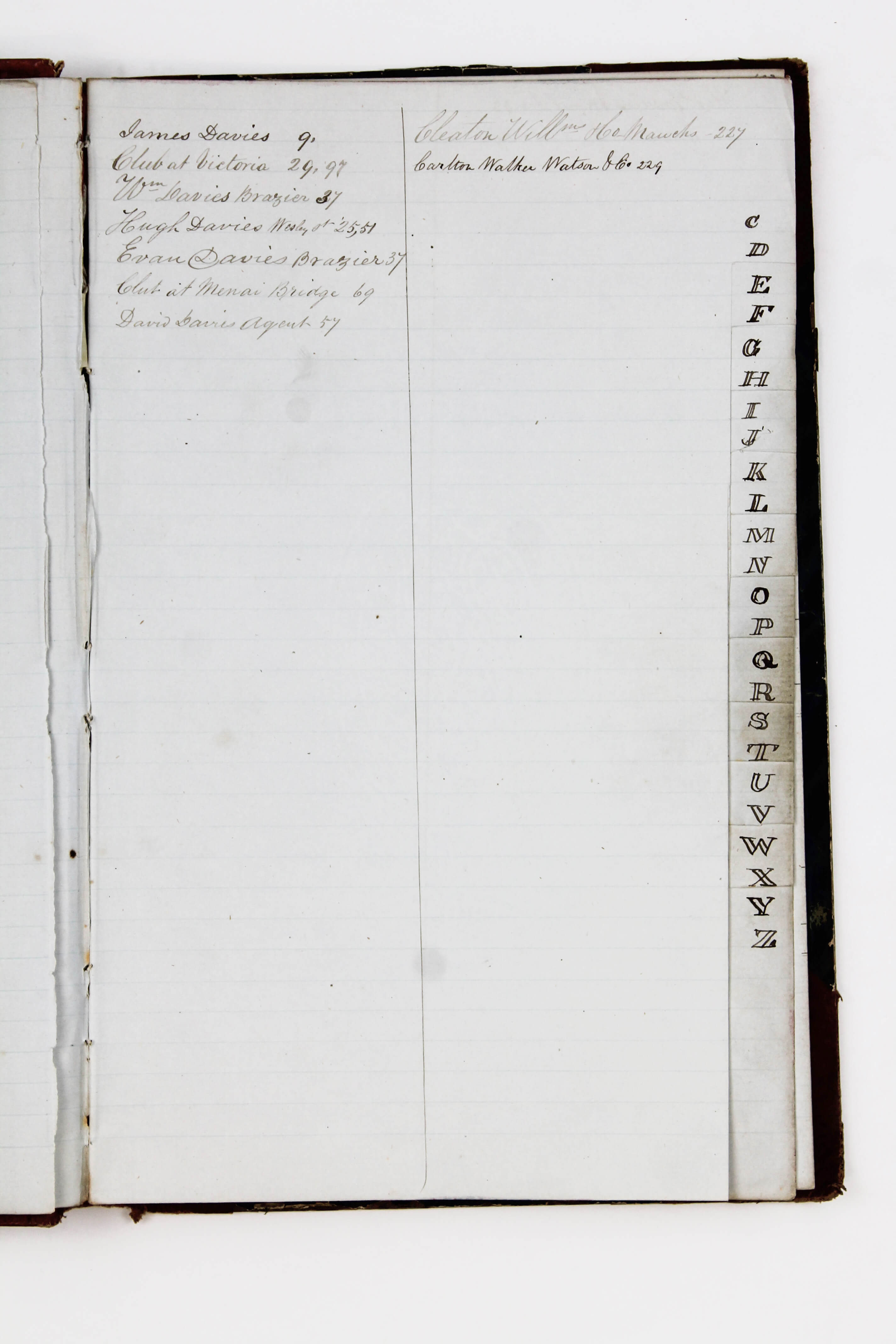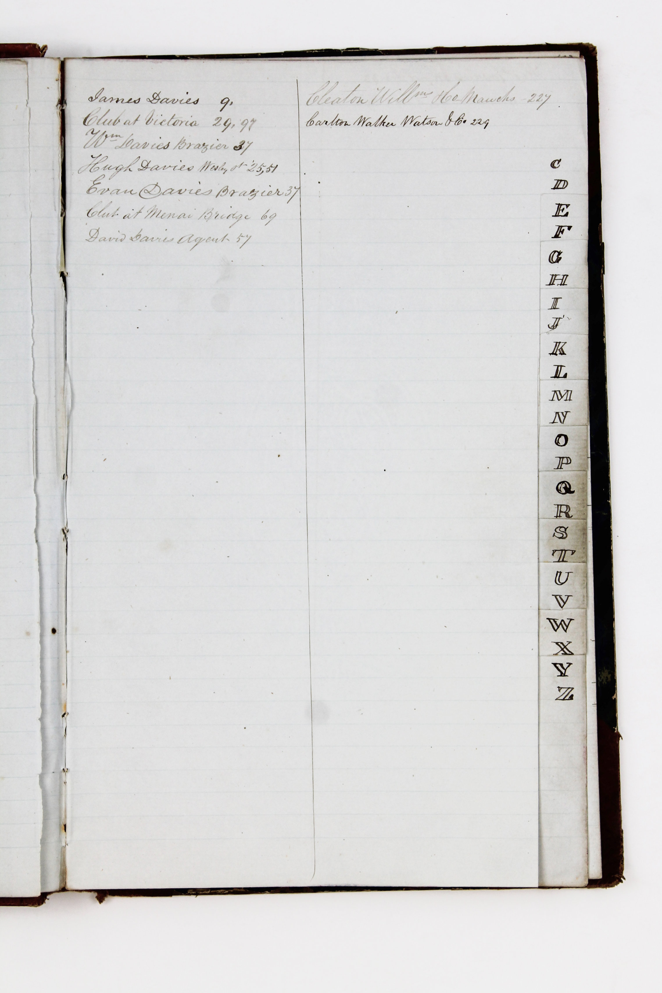 Another section of the journal is a pre-tabbed Business and Social Index, apparently begun in the early 1860s while Owen was operating a foundry in Wales. The index lists over 100 contacts, largely Welsh individuals and local firms, including Cleaton Willm & Co and Carlton Walker Watson & Co. Many entries include occupations, addresses, and numerical references, likely linked to a separate business ledger. Women are recorded primarily as dressmakers, while men appear as agents, braziers, molders, sawyers, painters, seamen, printers, and shoemakers. Importantly, the index names several Welshmen who later emigrated to California and became prominent members of the Cymmrodorion Society, including William Hughes (smelter), Hugh Davies, William Jones, and David Hughes, later Vice President of the Oakland Cymmrodorion Society.